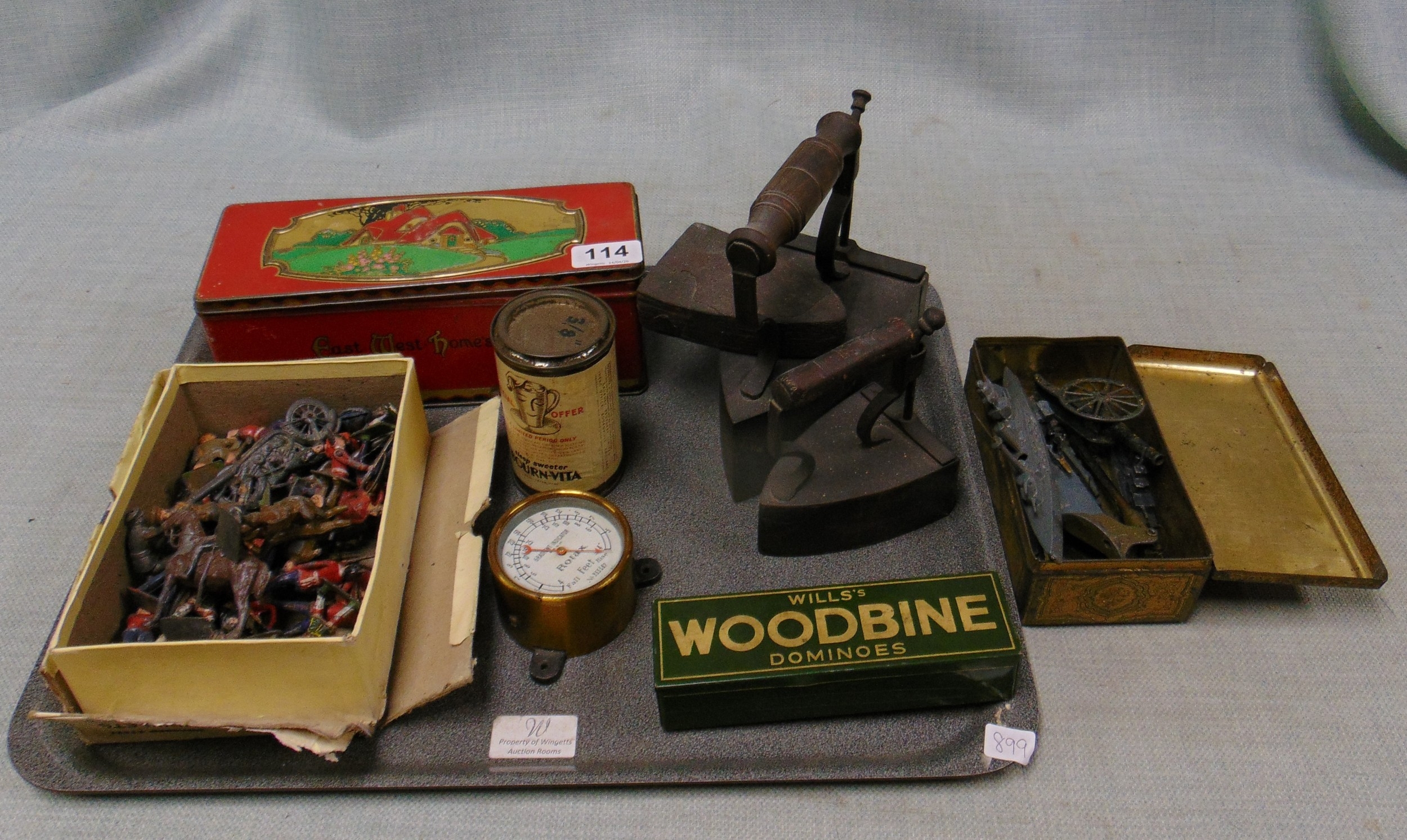 Two flat irons, model ships, etc.