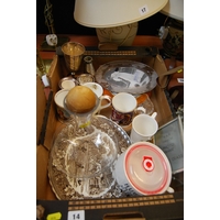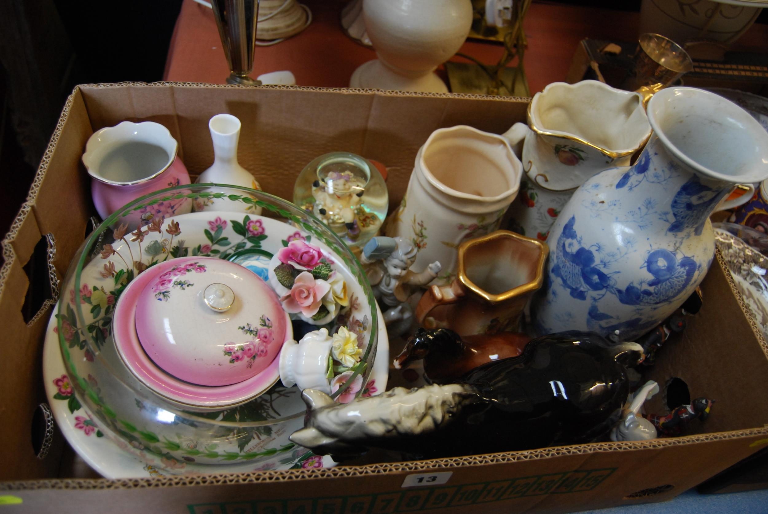 BOX OF CHINA JUGS, VASES, 2 PORTMEIRION BOWLS, ETC