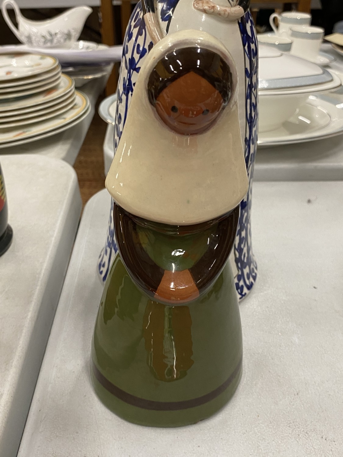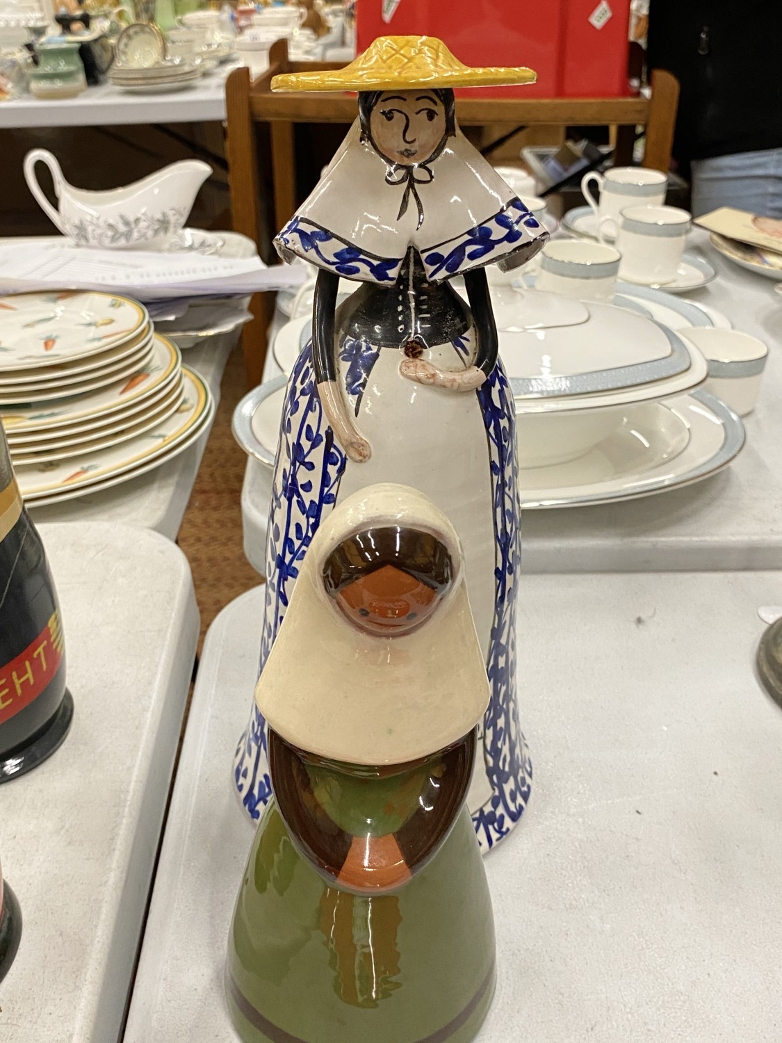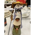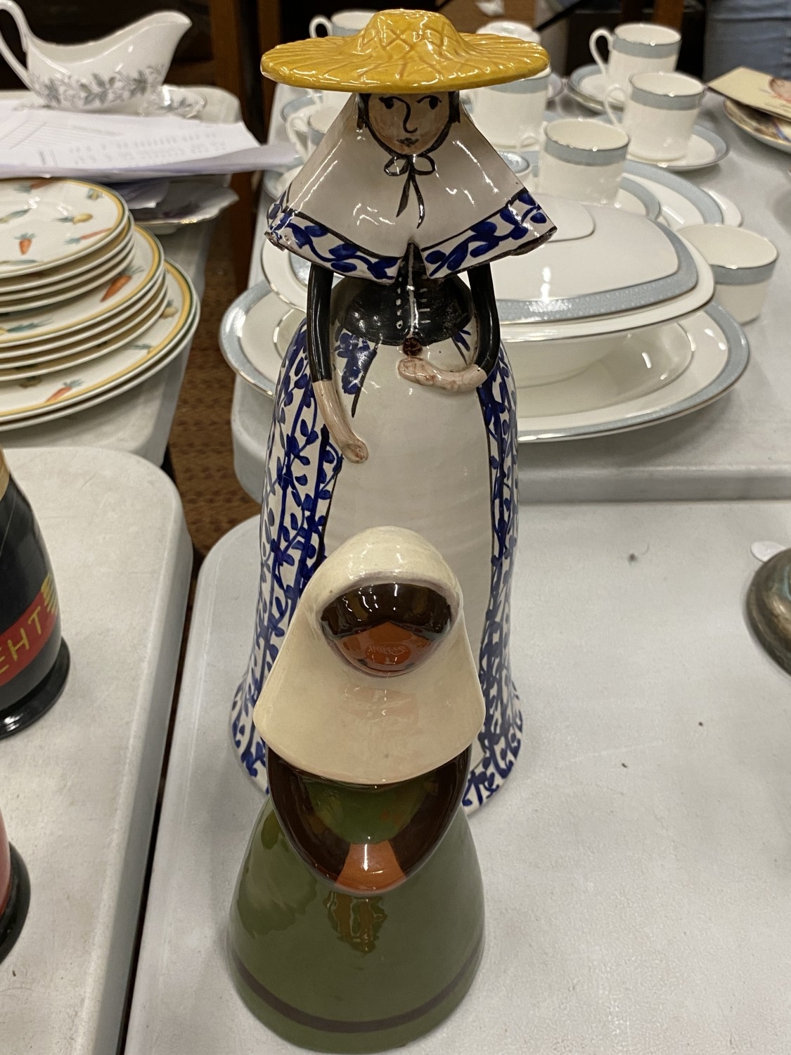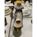 A BLUE AND WHITE CERAMIC BELL GIRL WITH A YELLOW HAT TOGETHER WITH A JIE KERAMIK GANTOFTA STYLE CERAMIC FIGURE OF A GIRL
