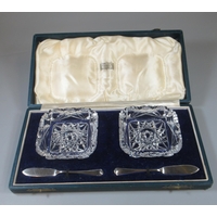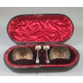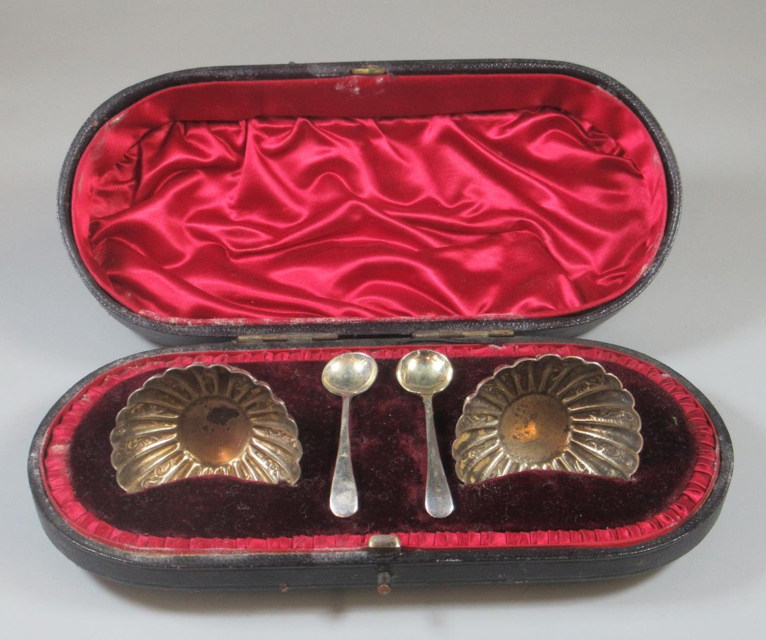 Pair of cased silver salts of fluted circular design, London hallmarks, 1.88oz troy approx. Together with two plated salt spoons.