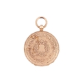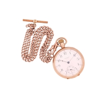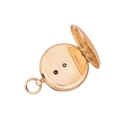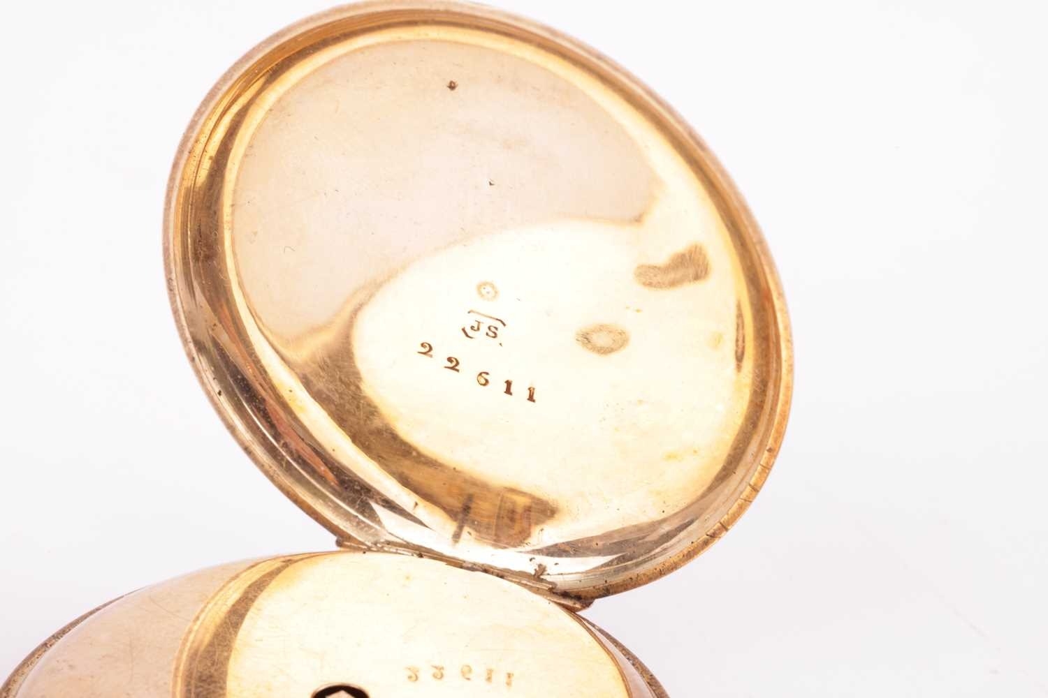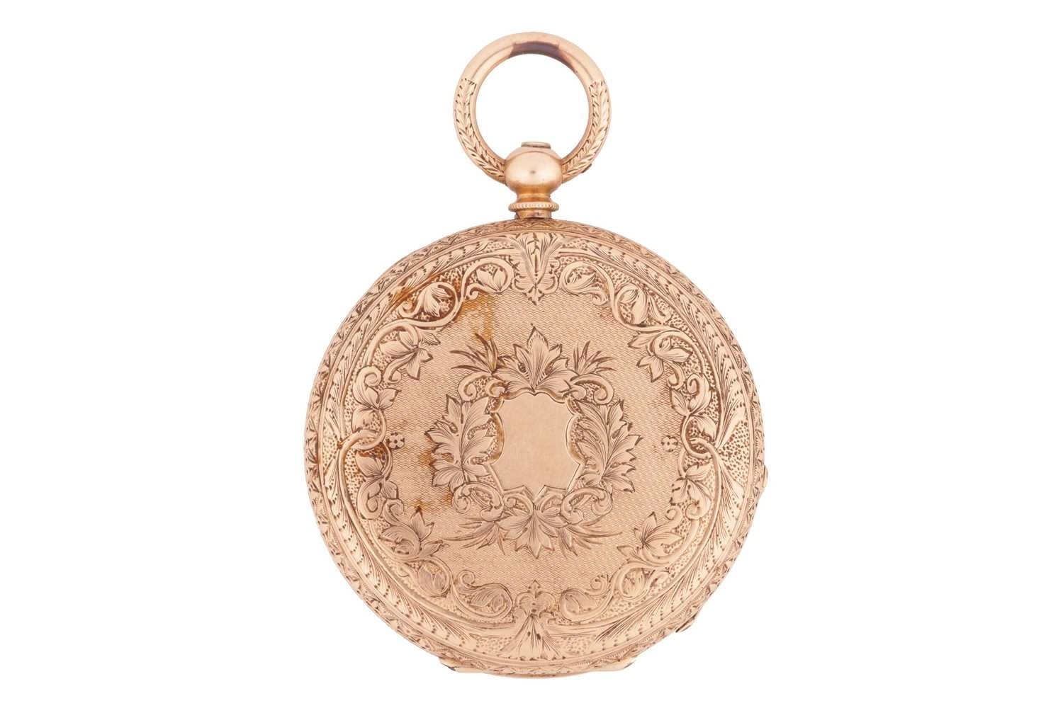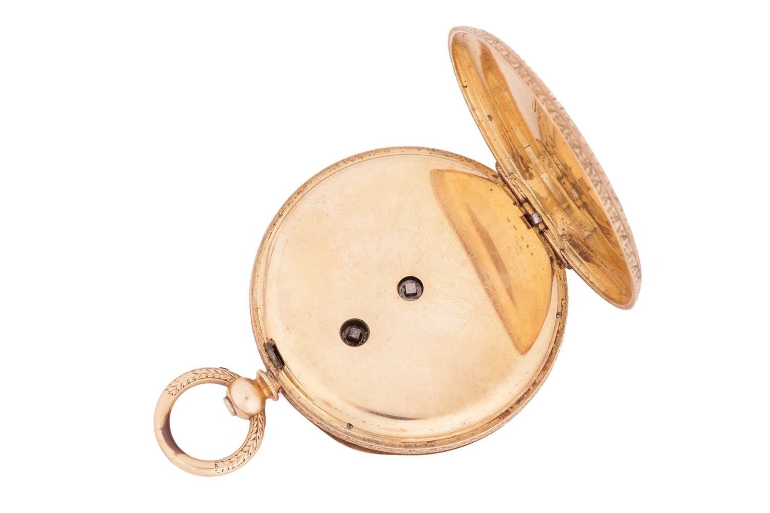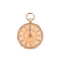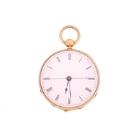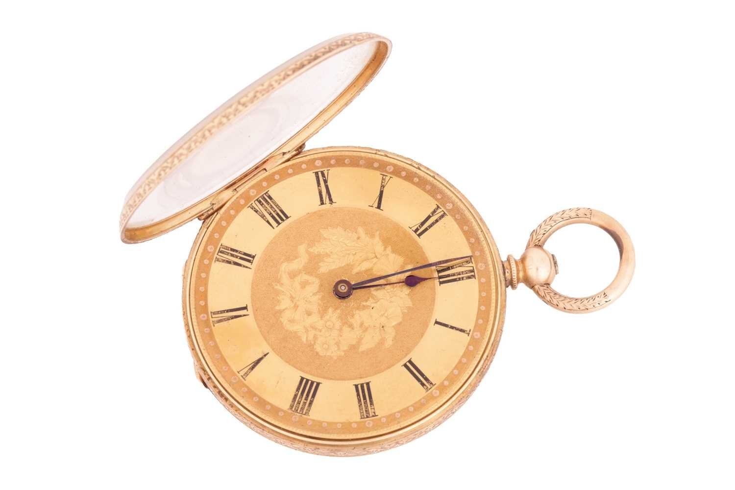 An open-faced pocket watch, gilt dial with Roman numerals against a machine turned background, the reverse of the case foliate engraved against a cross-hatched ground, with vacant cartouche to centre; key wound cylinder movement. Unmarked - tests as high carat gold. Gross weight 44 grams.