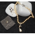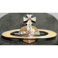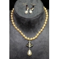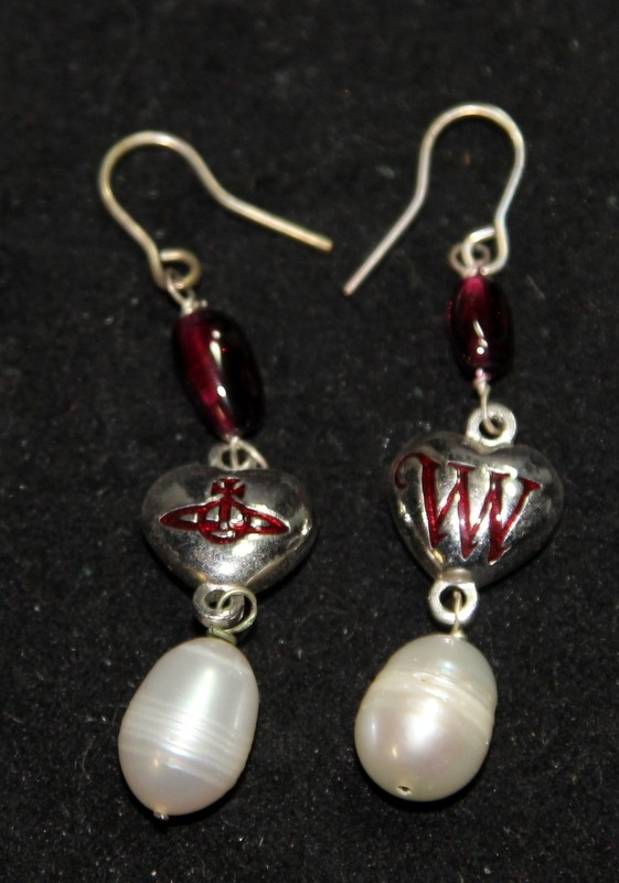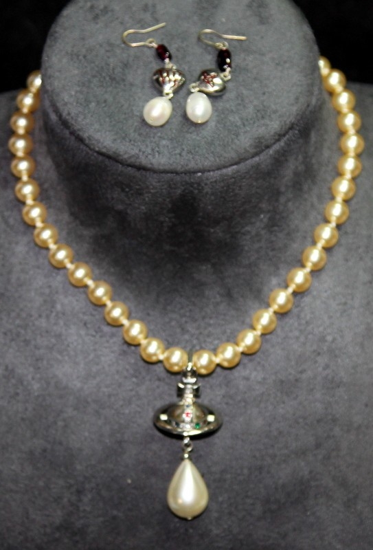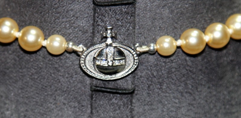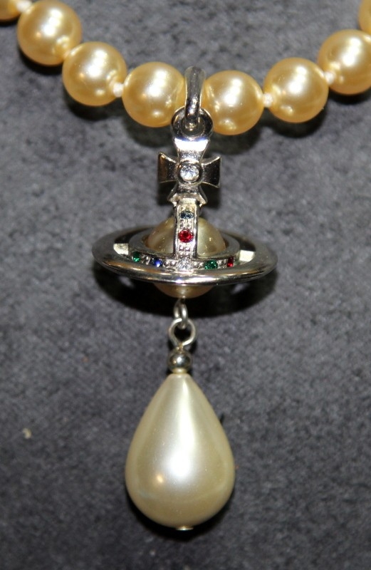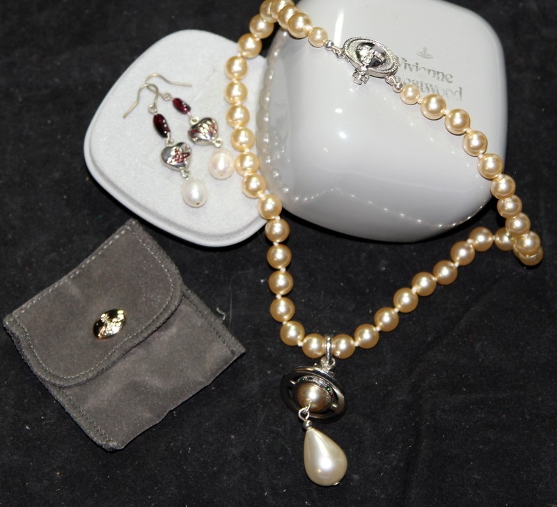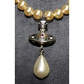 Genuine Vivienne Westwood Jewellery: Faux pearl with jewelled signature orb choker c/w drop pearl and enamel VW earrings. In excellent condition with branded pouch and box. From a single owner collection.