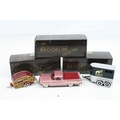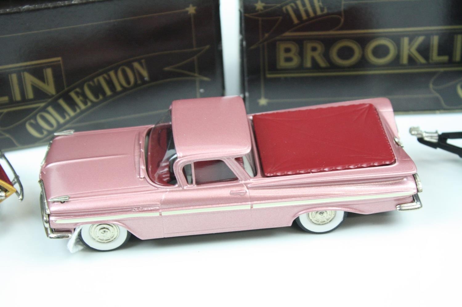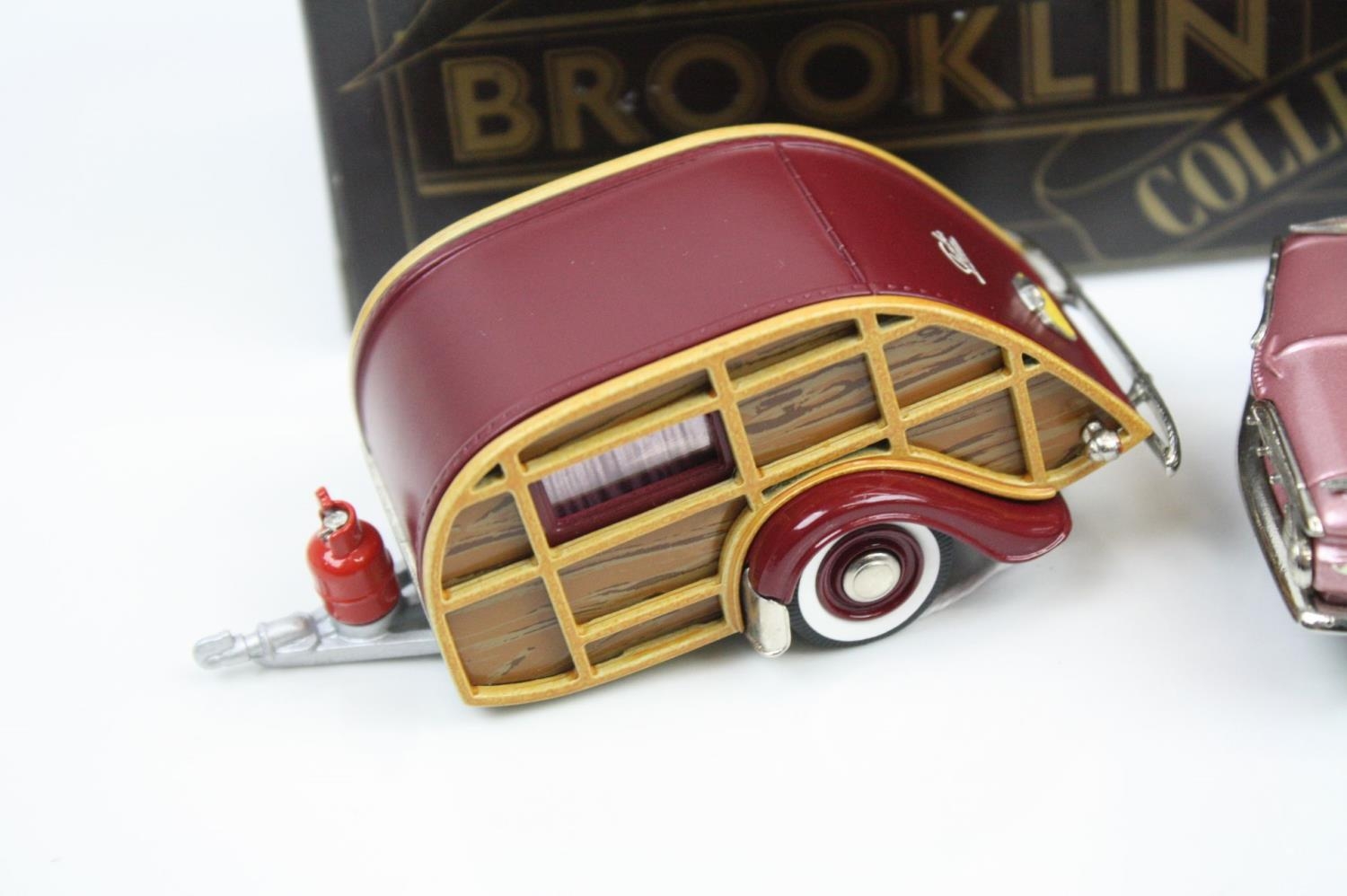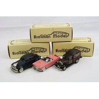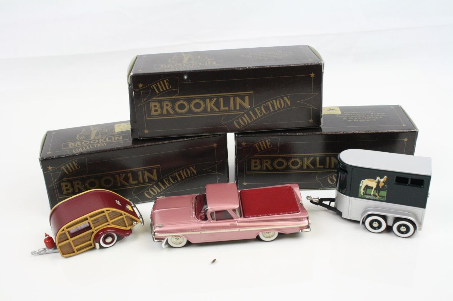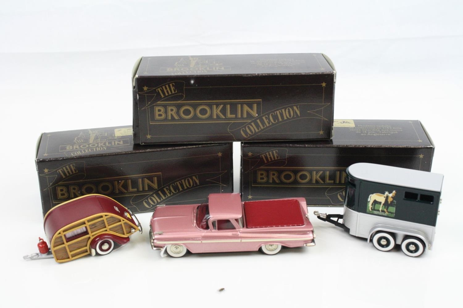 Three boxed 1/43 Brooklin Models metal models to include BRK 53 1955 Chevrolet Cameo, BRK 53x 1955 Chevrolet Cameo Blue Grass Farms and BRK 65 1947 Wesley Slumbercoach Woody Trailer, all excellent