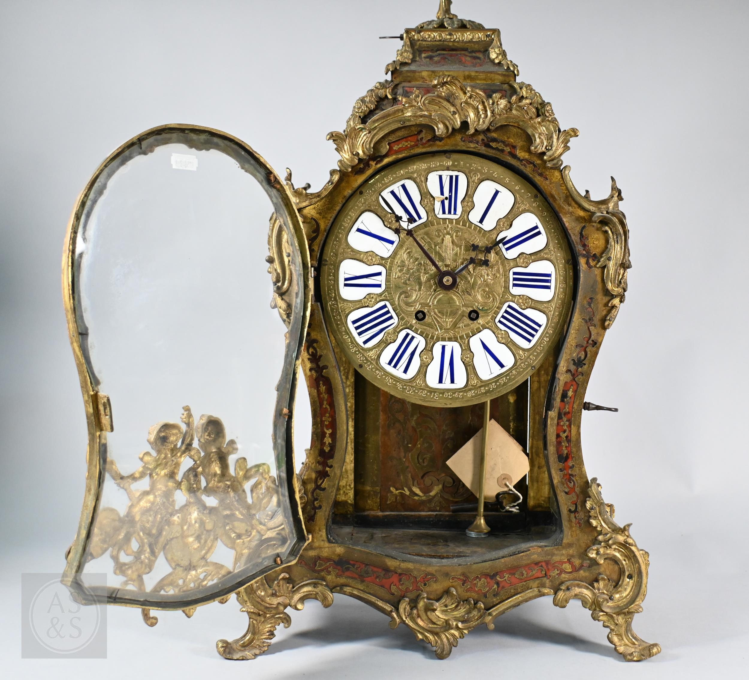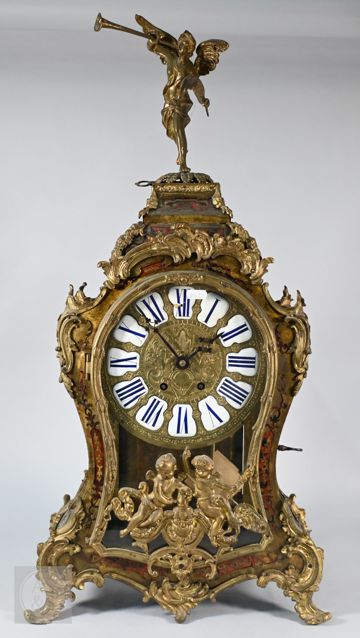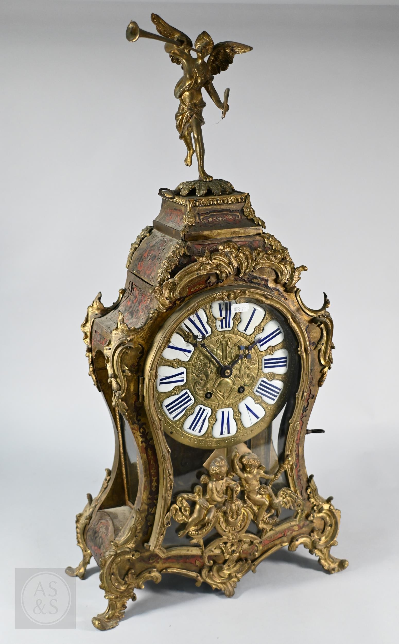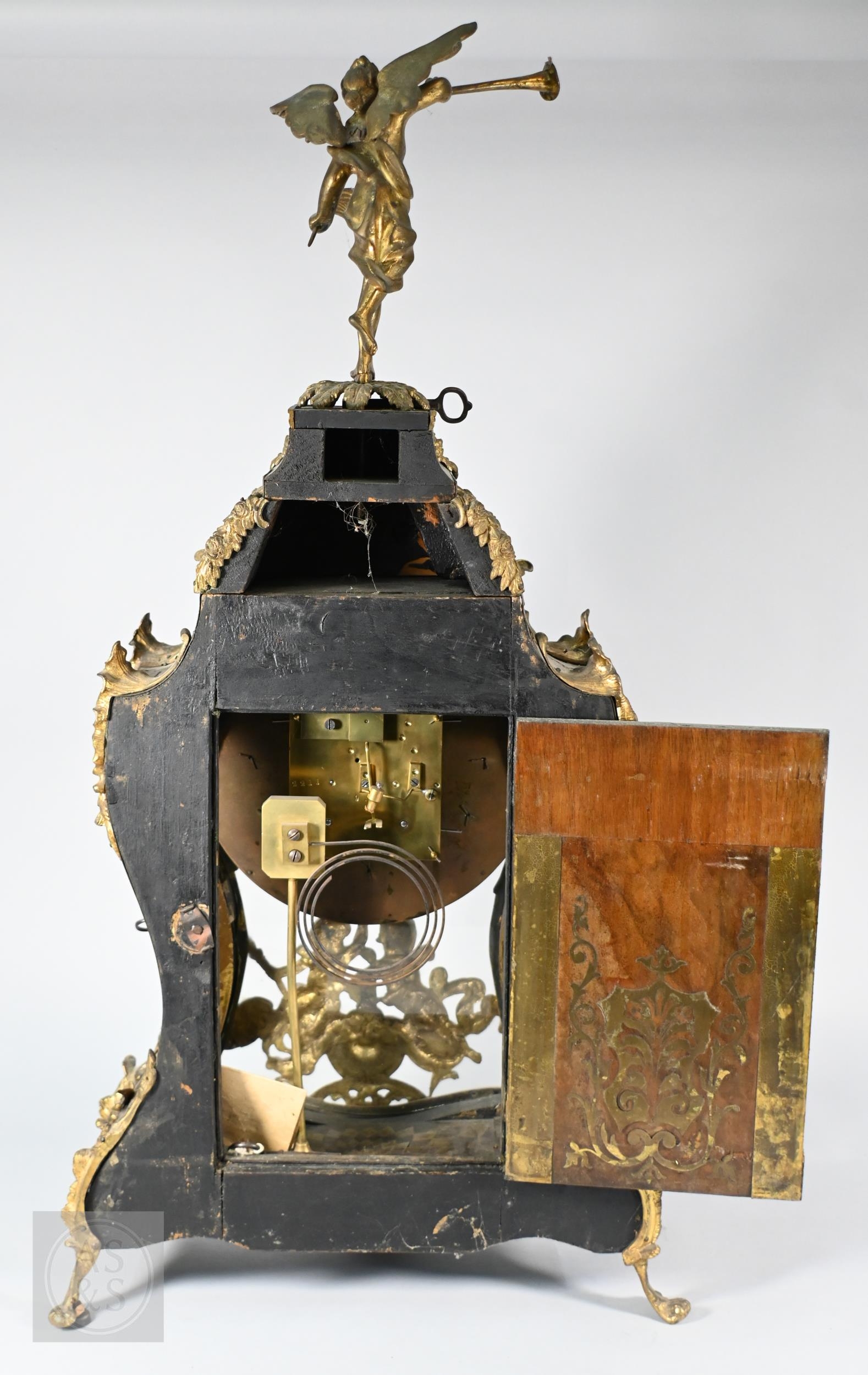 A Louis XV French boulle work bracket clock, the brass inlaid tortoiseshell case surmounted by a horn wielding figure, the 8-day two train movement with blue roman numeral tablet dial, to/w a conforming wall bracket, late 18th/19th century, all a/f