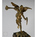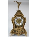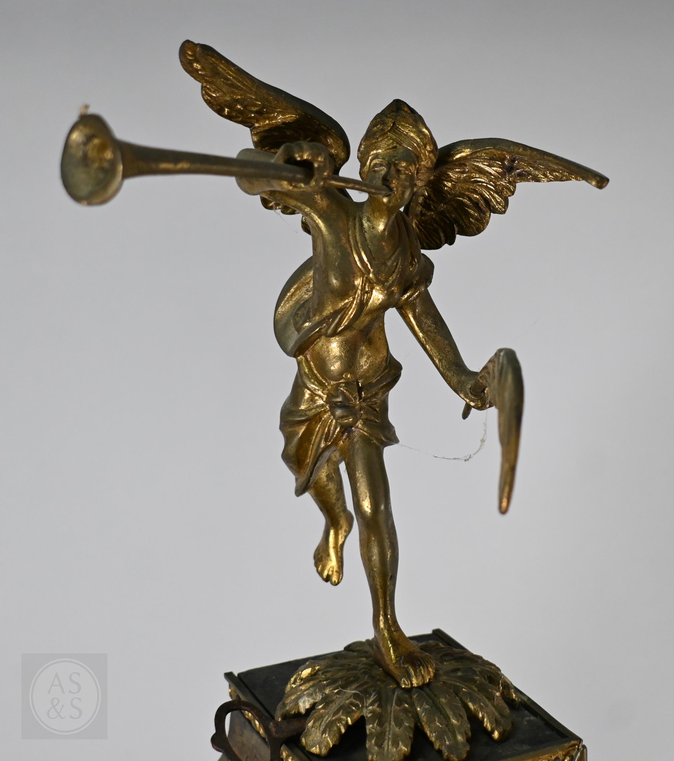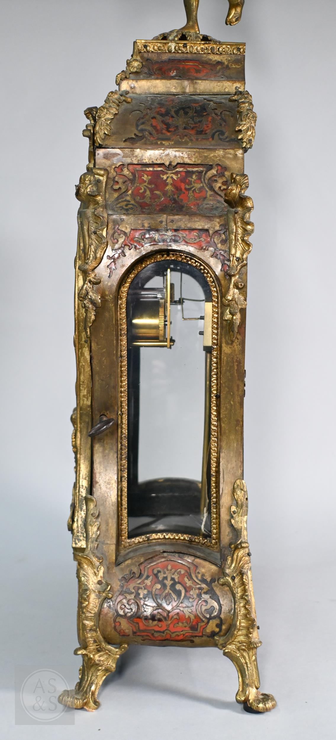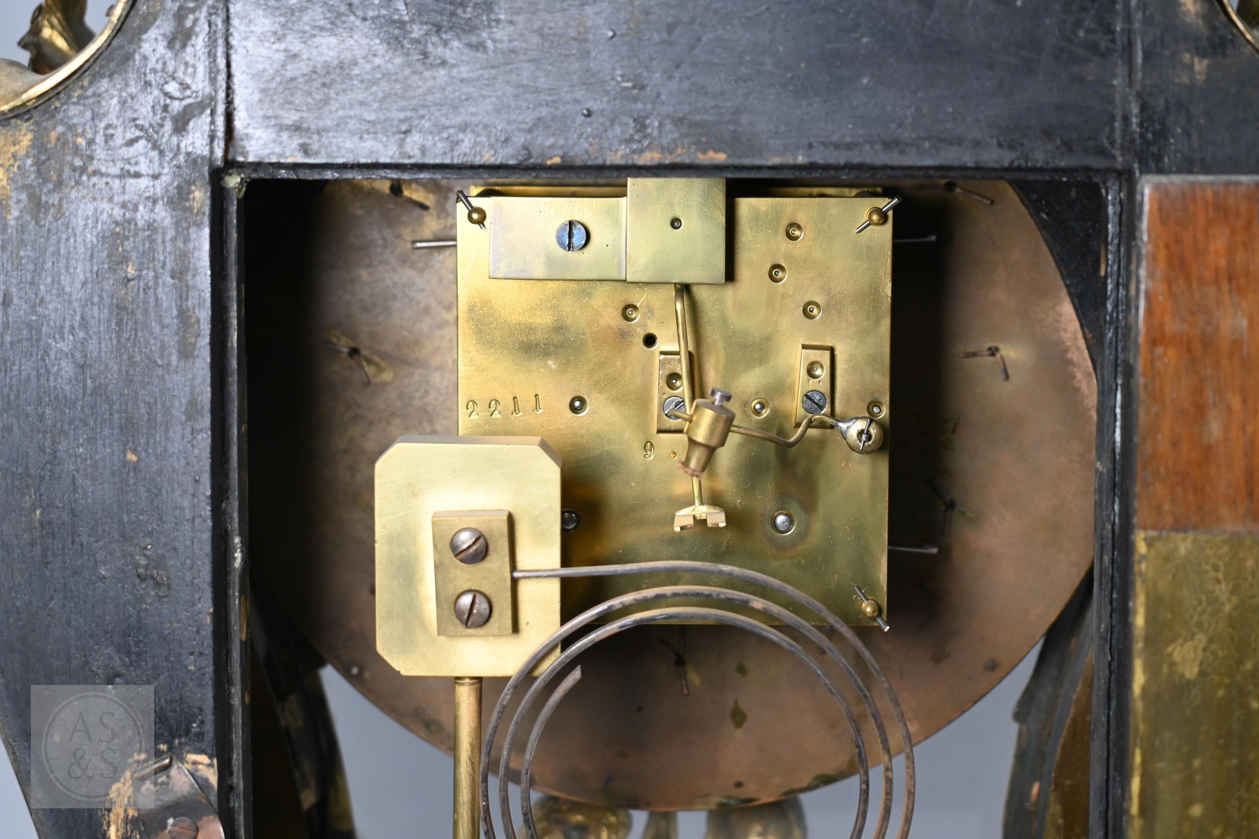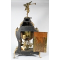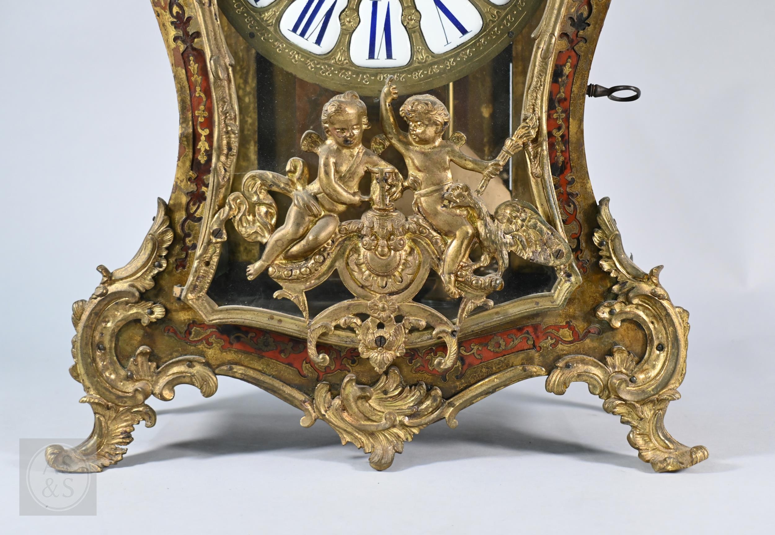 A Louis XV French boulle work bracket clock, the brass inlaid tortoiseshell case surmounted by a horn wielding figure, the 8-day two train movement with blue roman numeral tablet dial, to/w a conforming wall bracket, late 18th/19th century, all a/f
