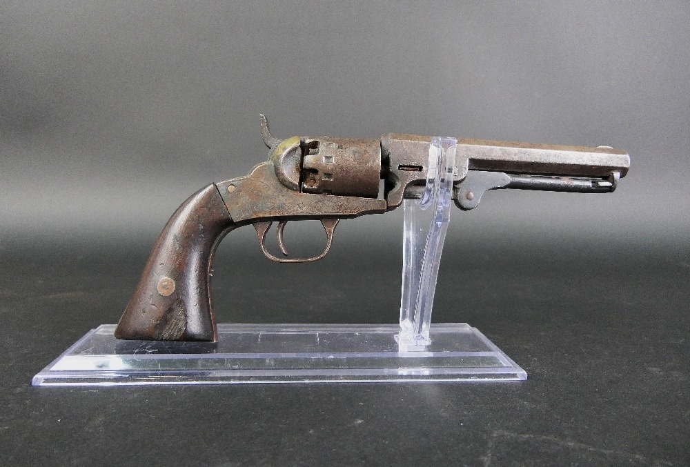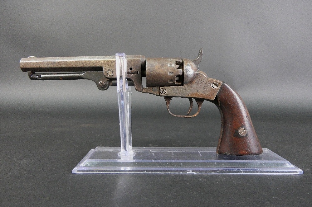 Manhatten Firearms Company 19th century percussion revolver, with 5" hexagonal barrel, marked to the top Manhatten Firearms MFG Co New York, with six shot cylinder and engraving to the frame, the underside stamped Patent, no visible serial number. Sold as a Section 58 obsolete calibre.