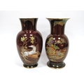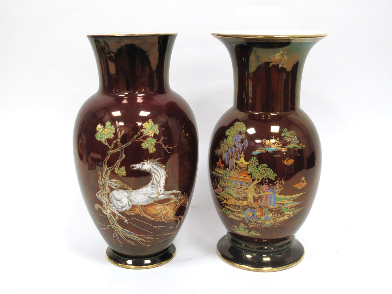 A Crown Devon Pottery Vase, of ovoid form with tapered neck, the red lustre ground painted in enamels with chinoiserie landscape scenes, printed marks, 30cm high and another decorated with horses, 30cm high. (2)