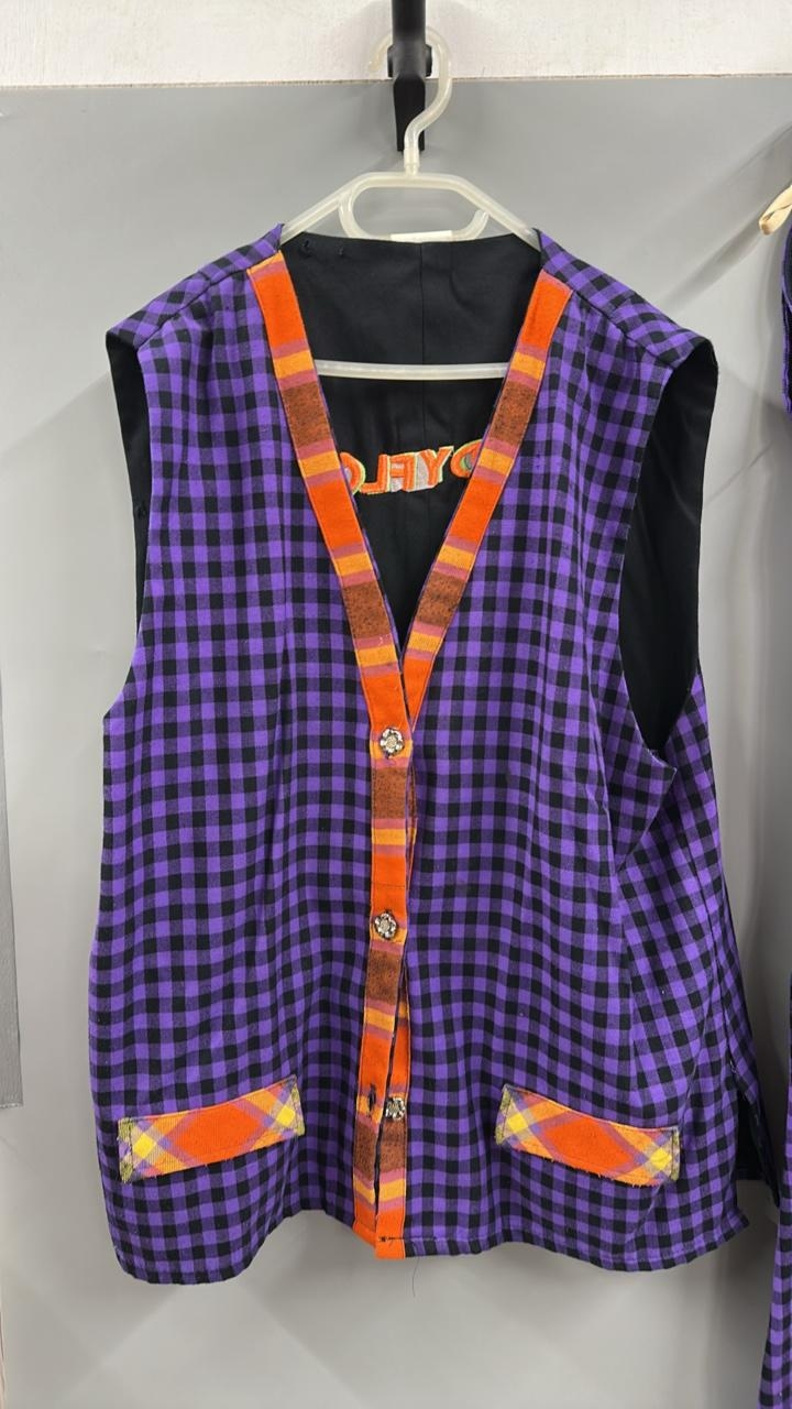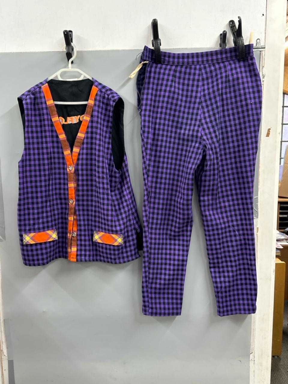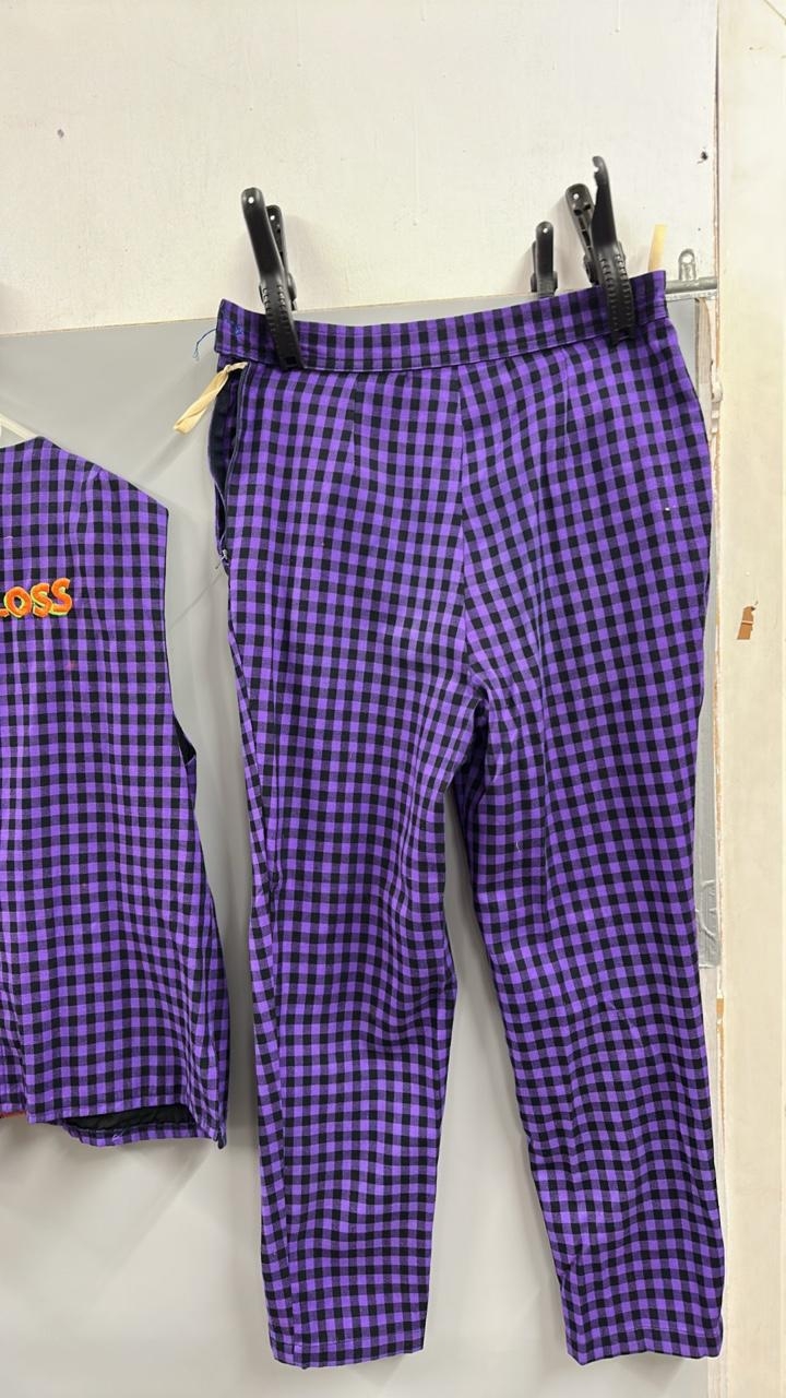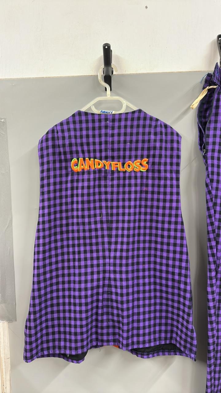 Stage worn 'candyfloss' clown costume, to include matching trousers and waistcoat. /Rail 4