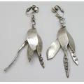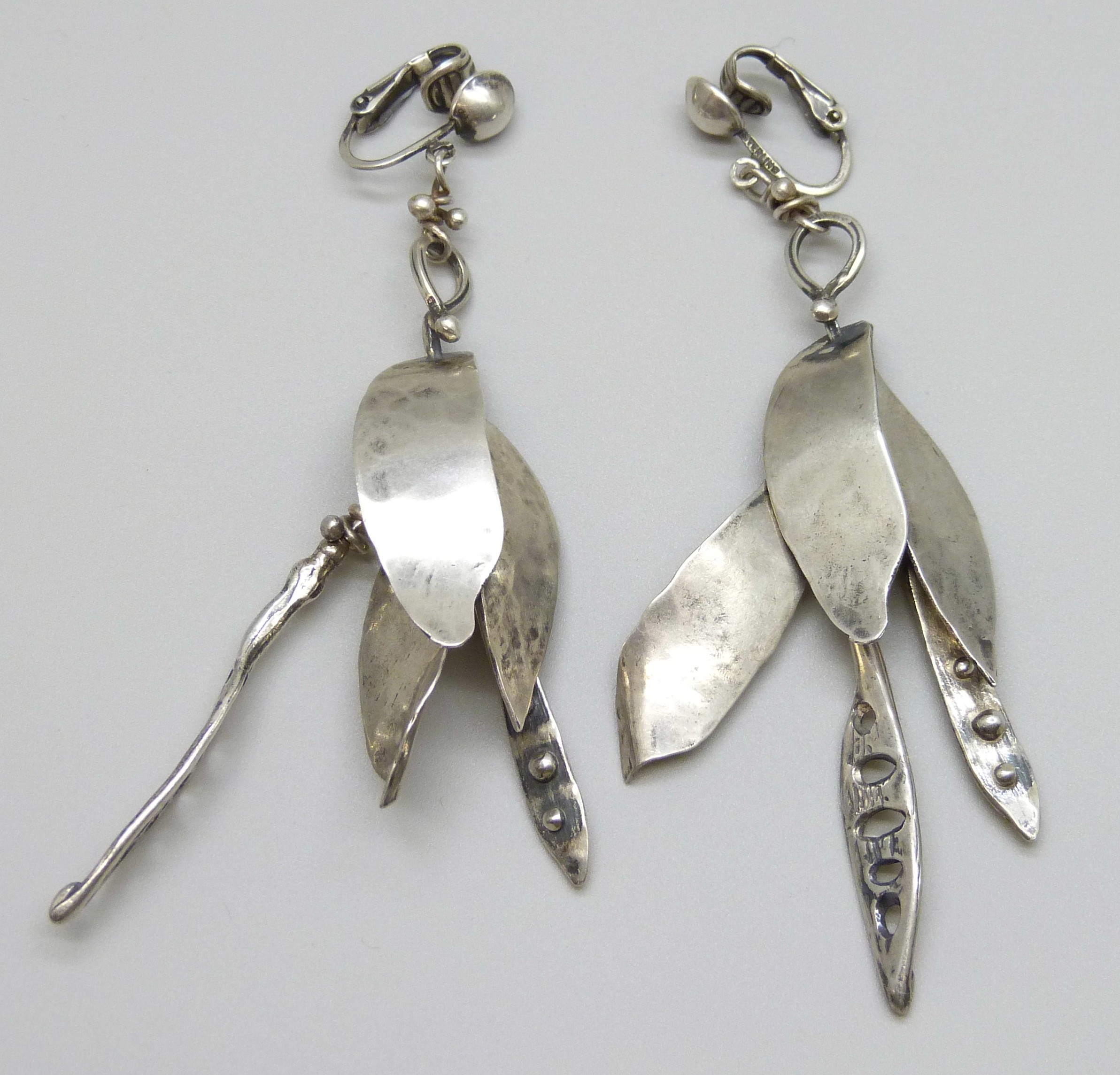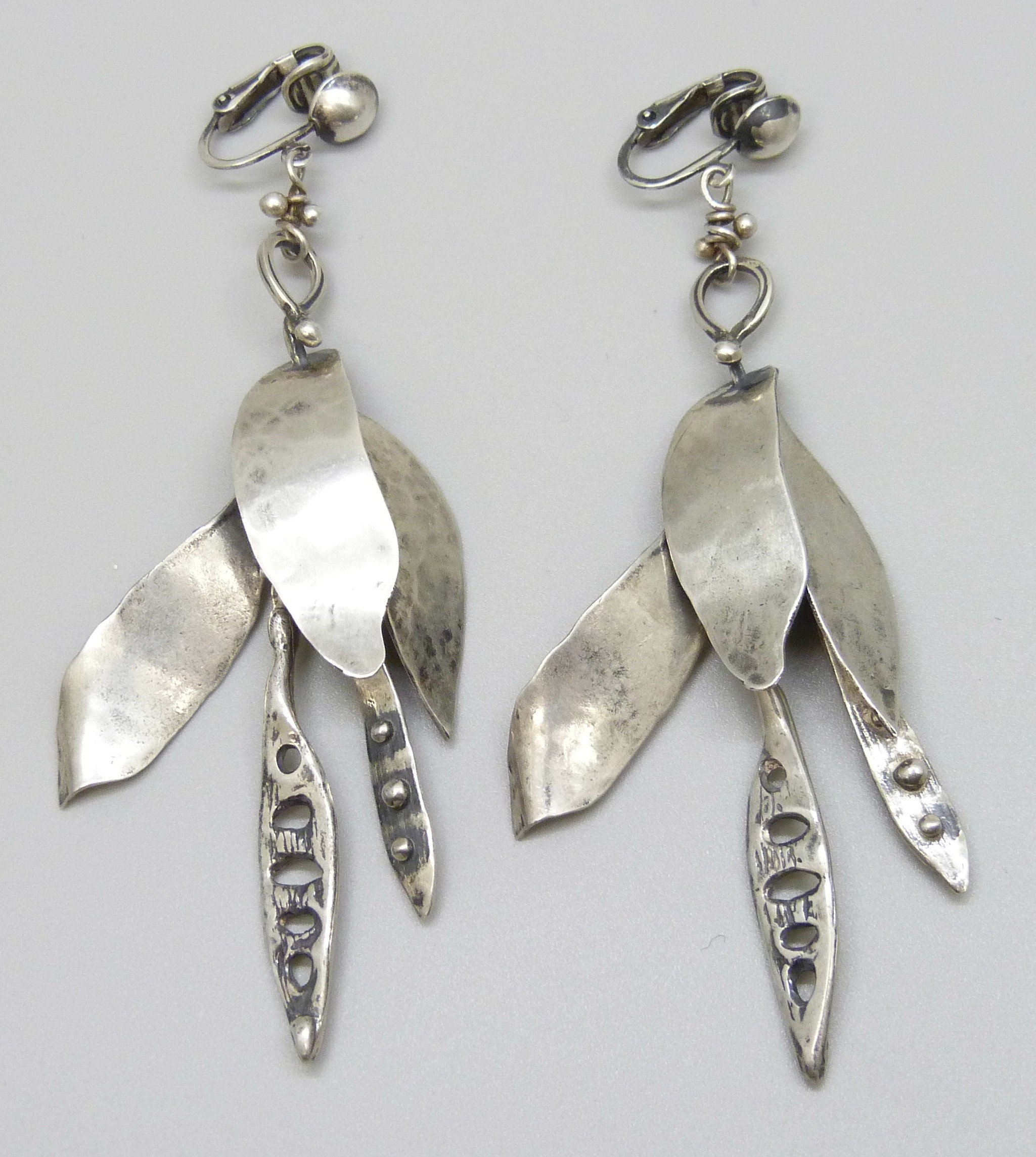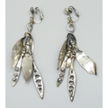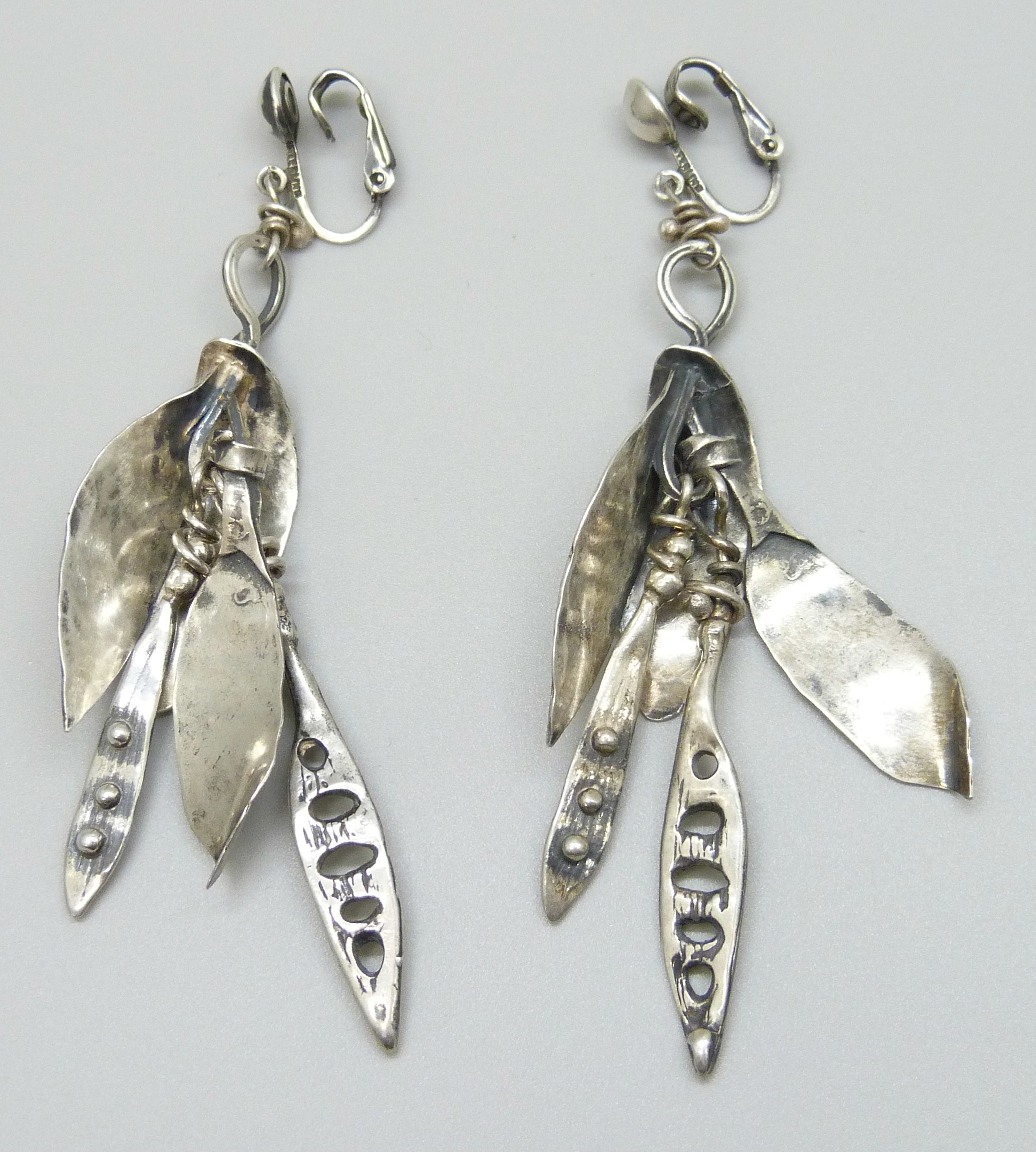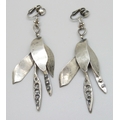 A pair of Brutalist design silver leaf earrings with clip on fasteners, 8.7cm
