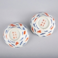 bearing six character Guangxu marks to the base, the moulded bowls with shaped rims, decorated in iron red and blue enamels with bats flying amongst clouds, 4cm high x 9cm diameter (2)