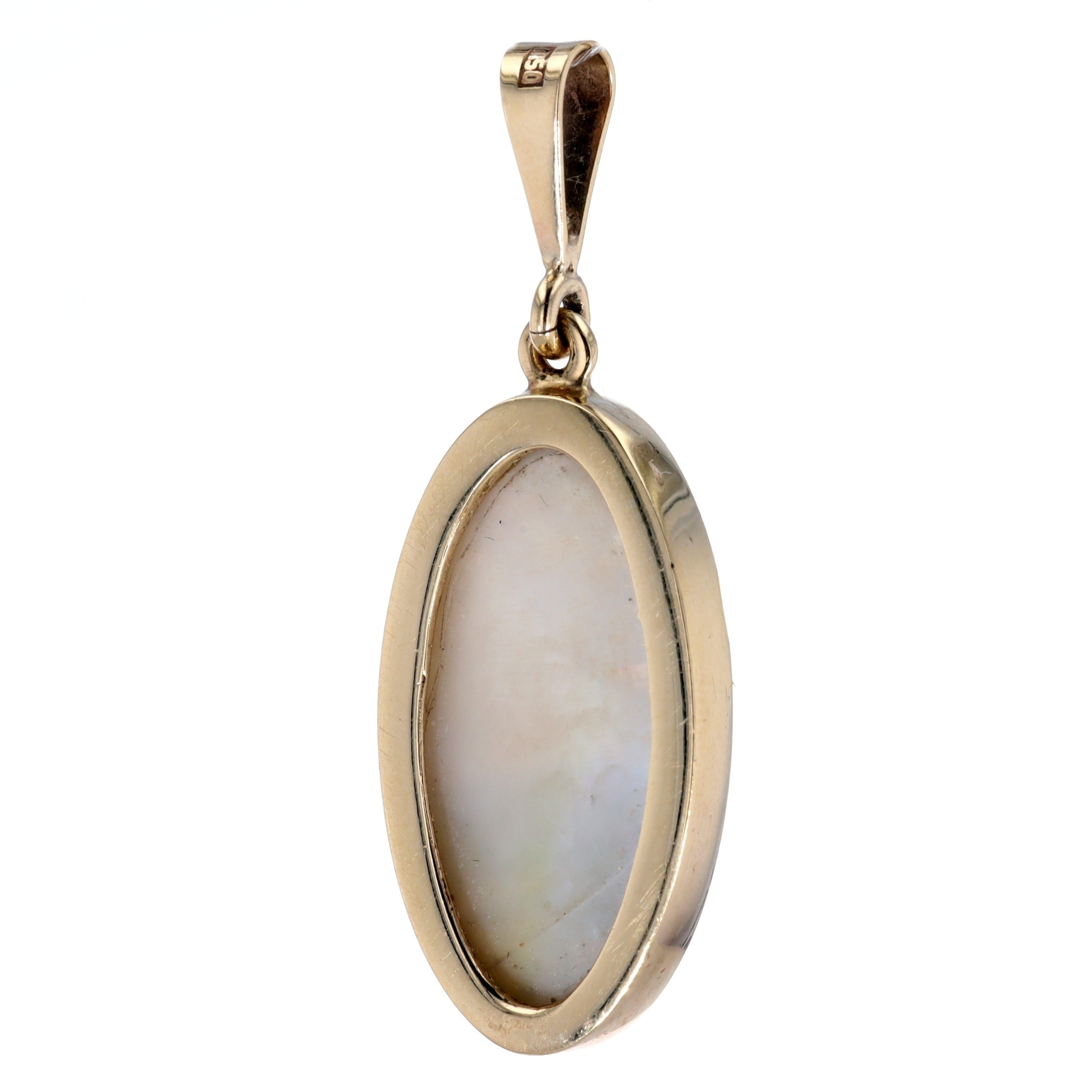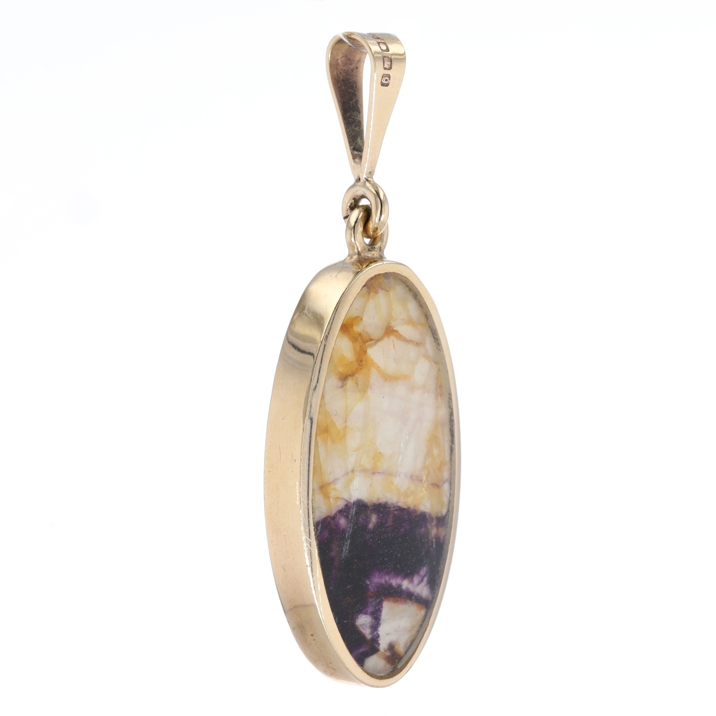 Blue John 9ct Gold Pendant by David Scott Walker. This piece is hallmarked 375 with the makers mark DSW. The pendant measures approximately 4.5cm in length and 1.6cm wide, weighs in total 6g.