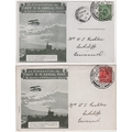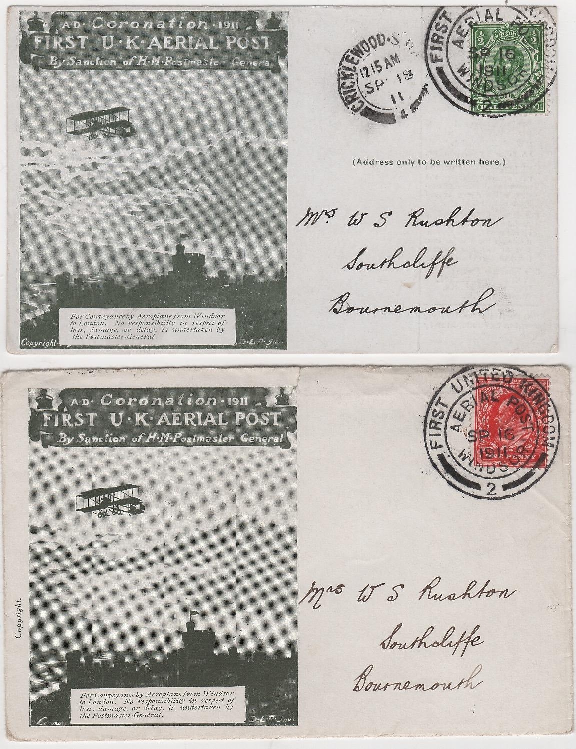 1911 (Sep 16) Windsor to London envelope and postcard in green, the card franked KGV ½d and the cover franked KEVII 1d, with Windsor Aerial Post c.d.s code "2" and Cricklewood arrival datestamps, both sent by W.S Rushton, G.P.O Surveyor who represented the G.P.O at Windsor, to his wife in Bournemouth. The cover with small unobtrusive tear at upper edge, otherwise fine, the Windsor envelope the scarcest of all the basic stationery types. (2).