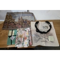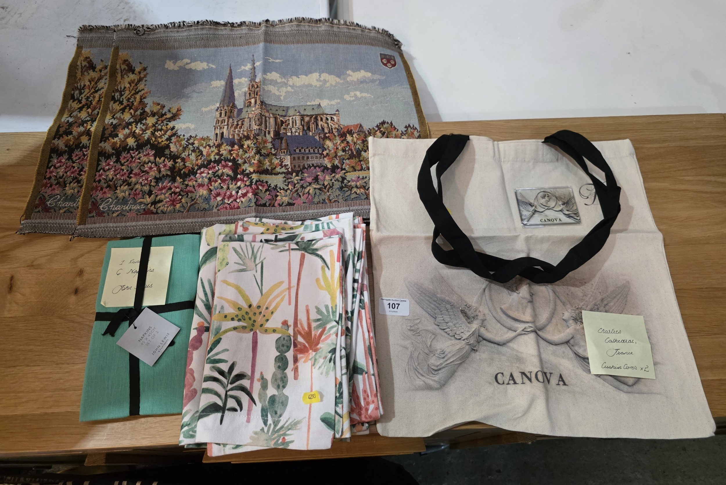 ASSORTED TEXTILES INCLUDING JOHN LEWIS NAPKINS AND RUNNER, TWO TAPESTRY CUSHION COVERS OF CHARLES CATHEDRAL, FRANCE AND CANOVA BAG