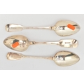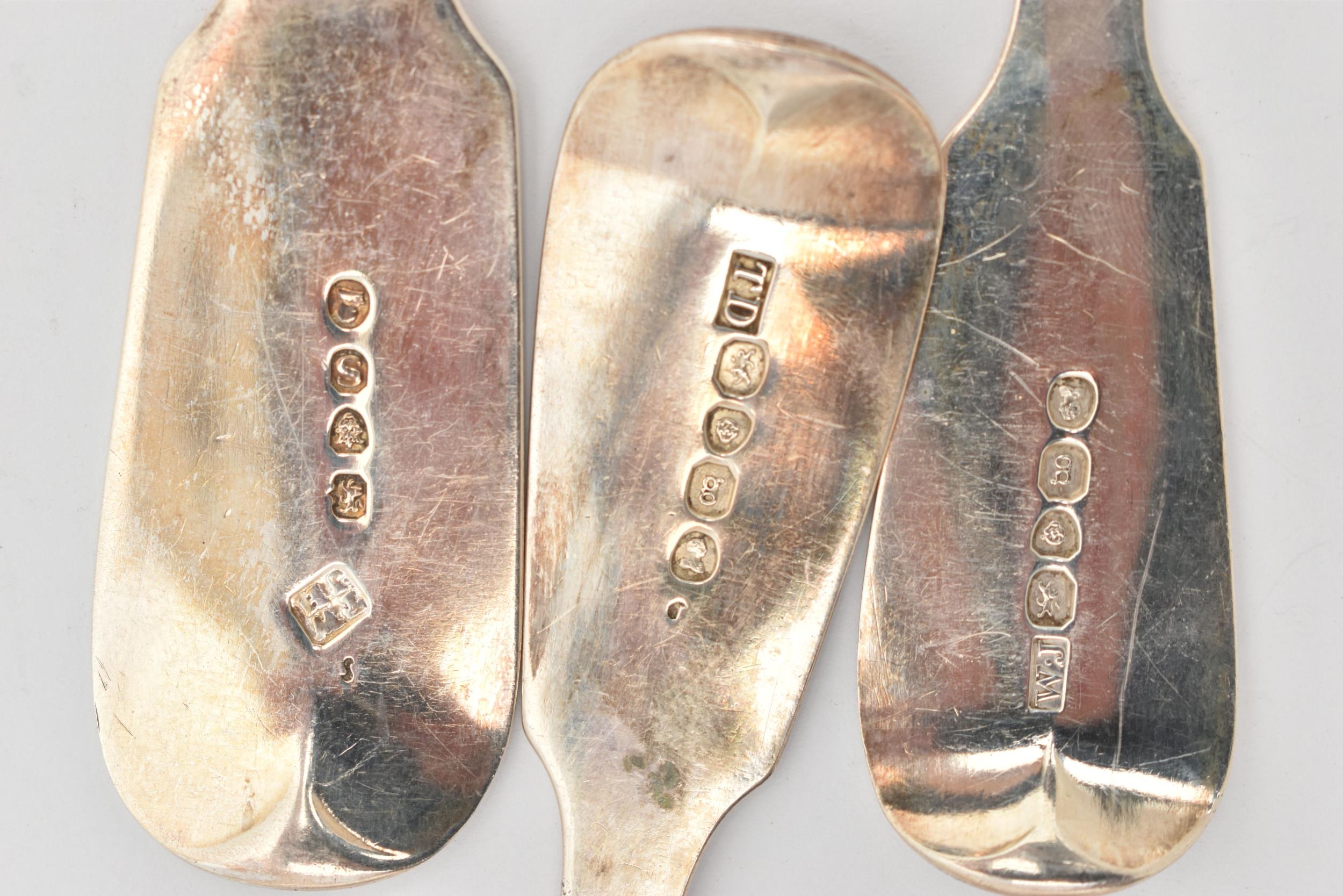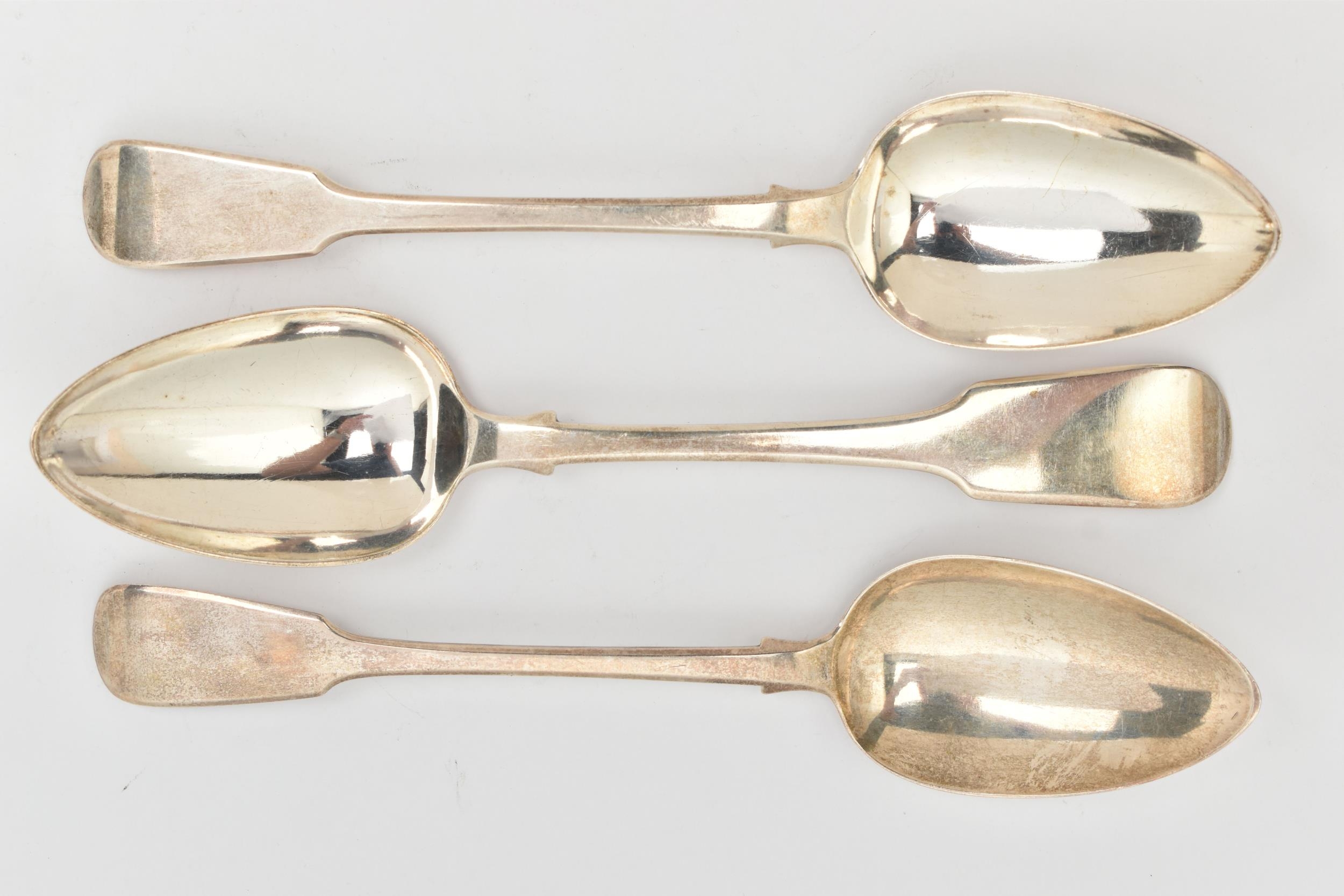 THREE GEORGIAN SILVER TABLESPOONS, fiddle pattern spoons with polished terminals, each hallmarked for London, makers marks 'Thomas Wallis (II) & Jonathan Hayne', 'William Johnson' and 'Thomas Dicks', lengths 22.5cm, approximate gross weight 6.57 ozt, 204.3 grams (condition report: general light wear)