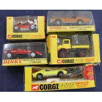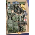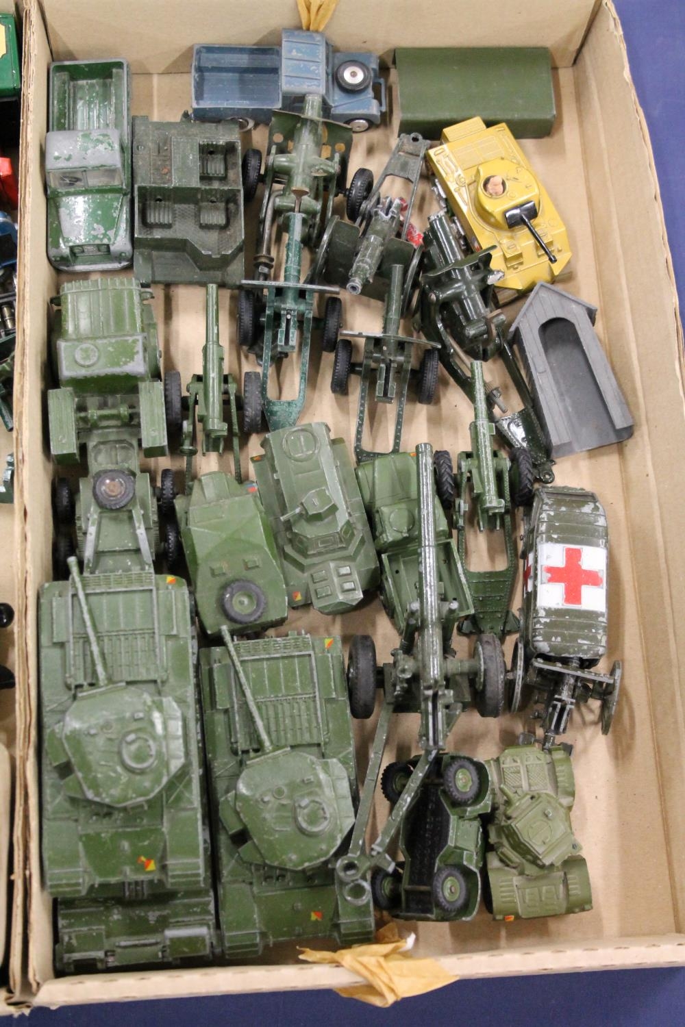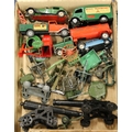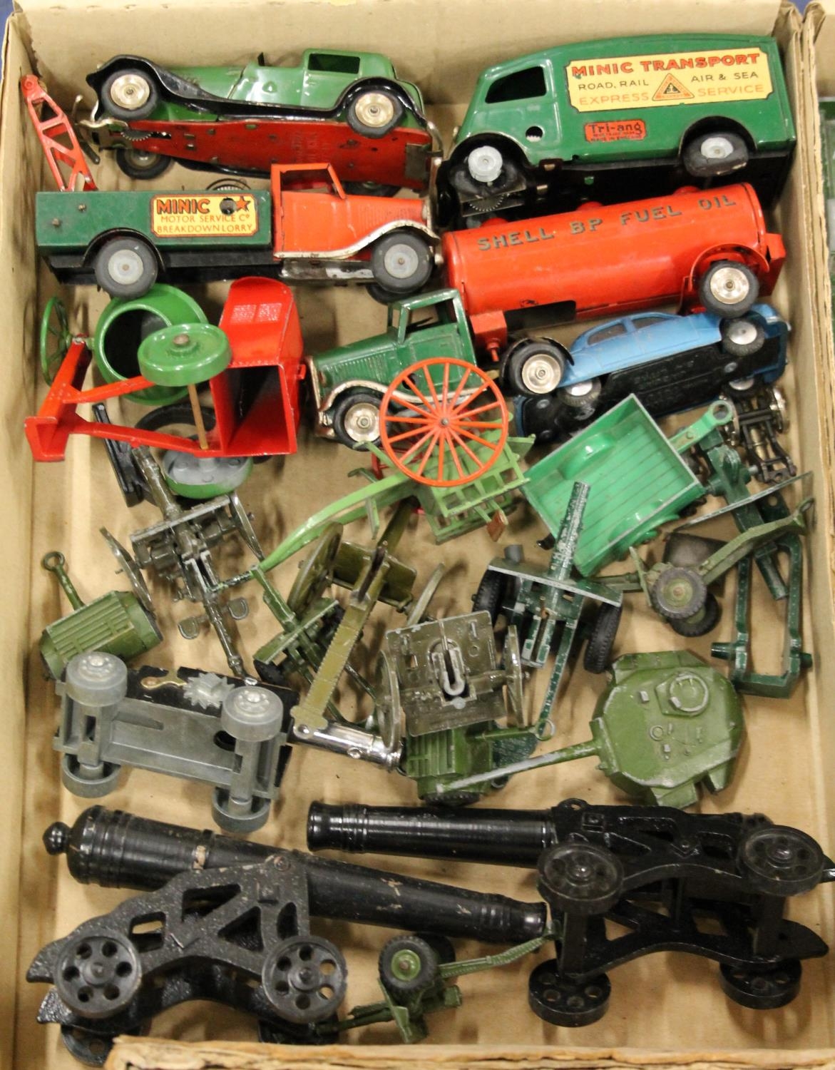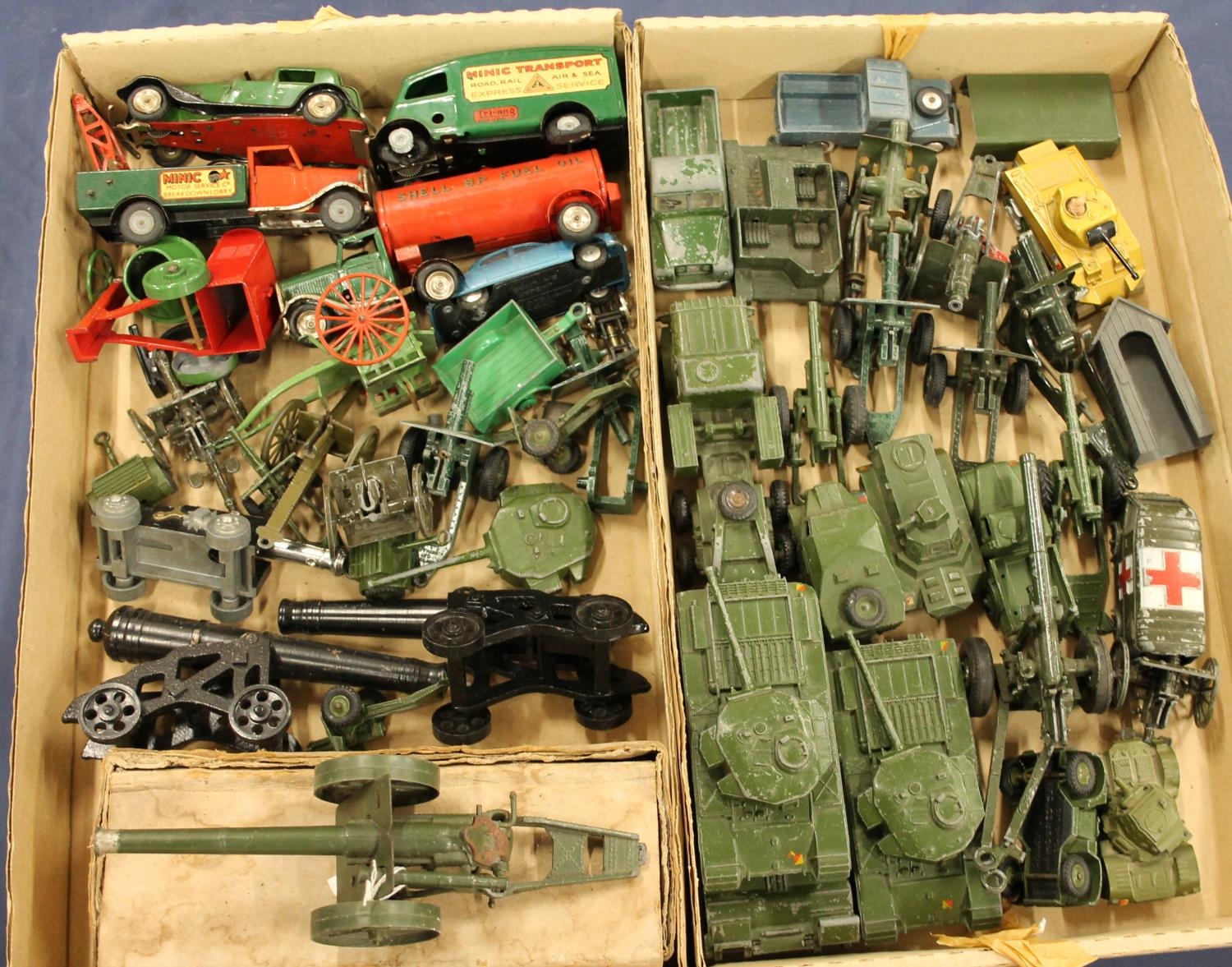 Britians Limited diecast 4.7" naval gun boxed, pair of metal models of cannon, Dinky and other diecast military vehicles to include tank transporter, tanks, guns etc. also Triang Minic clockwork vehicles to include Lines Brothers Express Service van, Motor Service Co Breakdown truck, saloon car and Shell BP tanker etc.