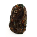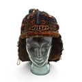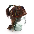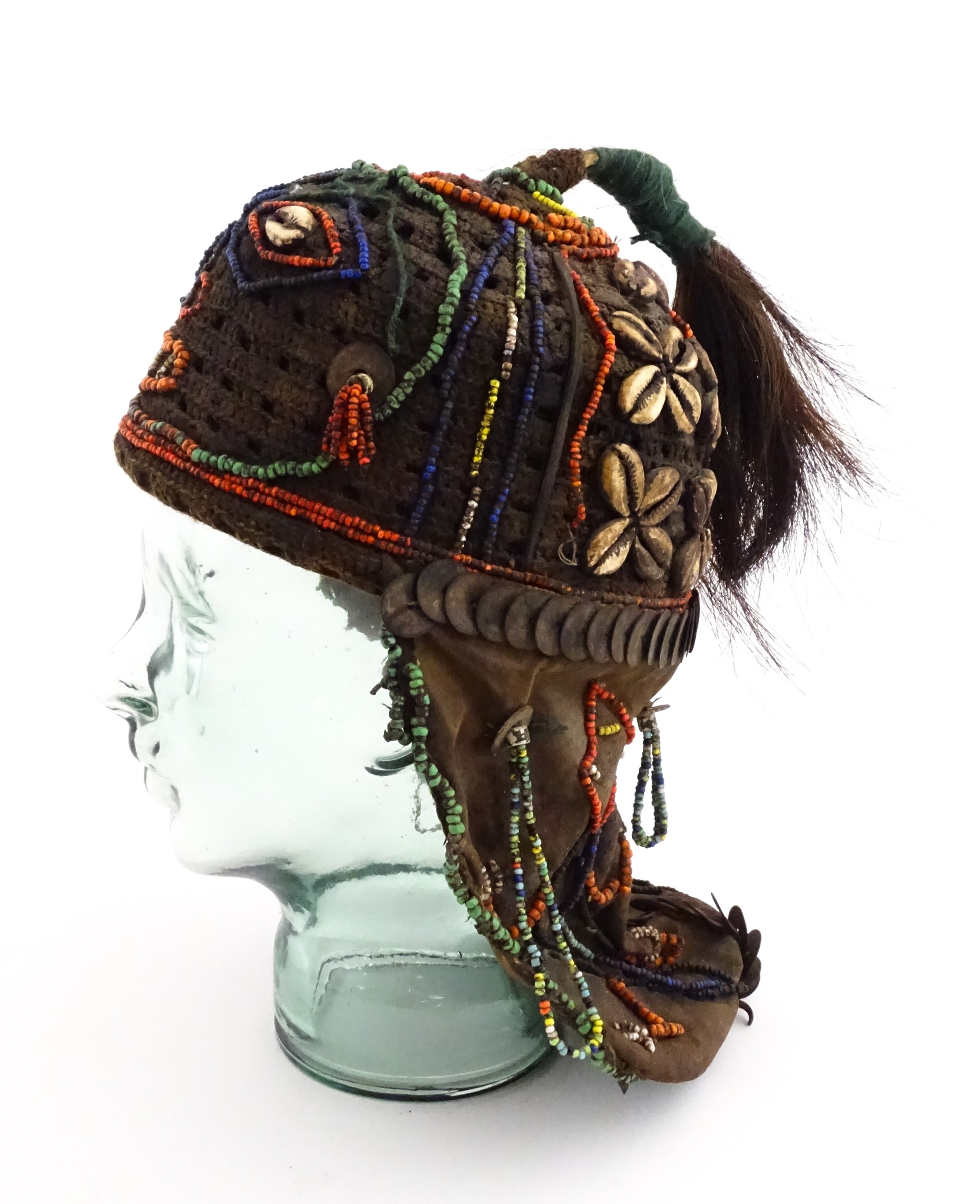Ethnographic / Native / Tribal : A tribal headdress / hat with beadwork and cowrie shell decoration depicting a stylised face to front. Approx. 8" wide