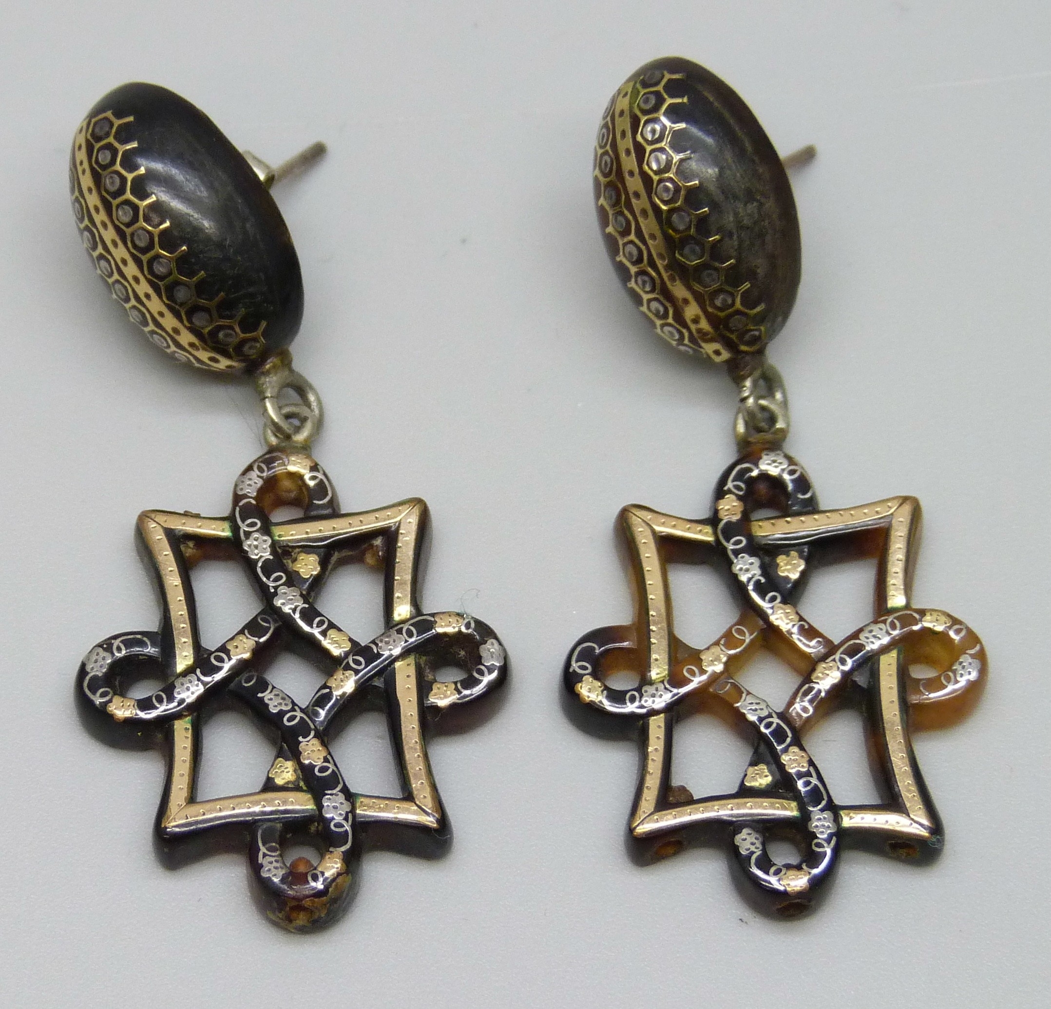 Pair of Victorian pique drop earrings, 4.6cm