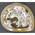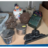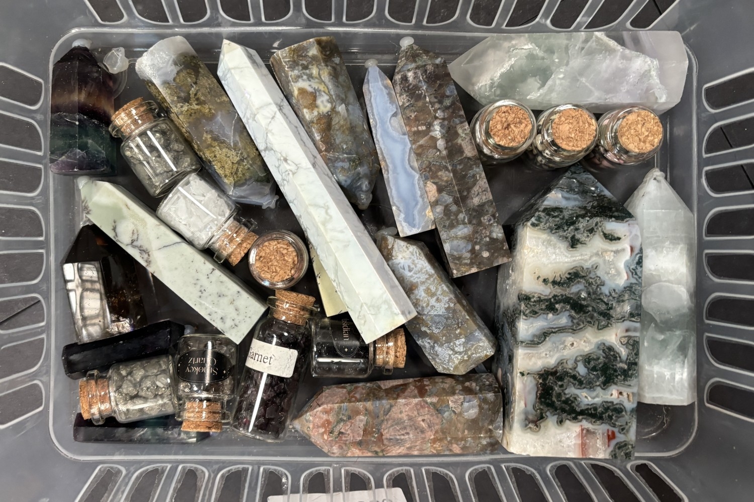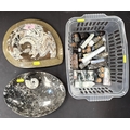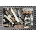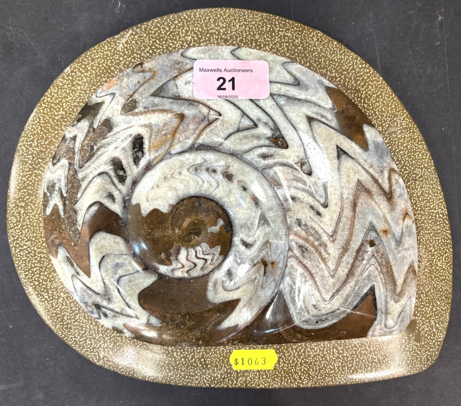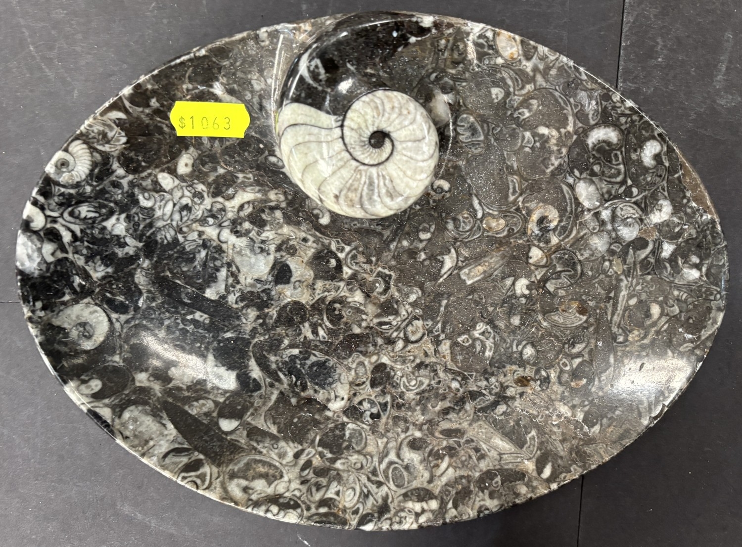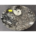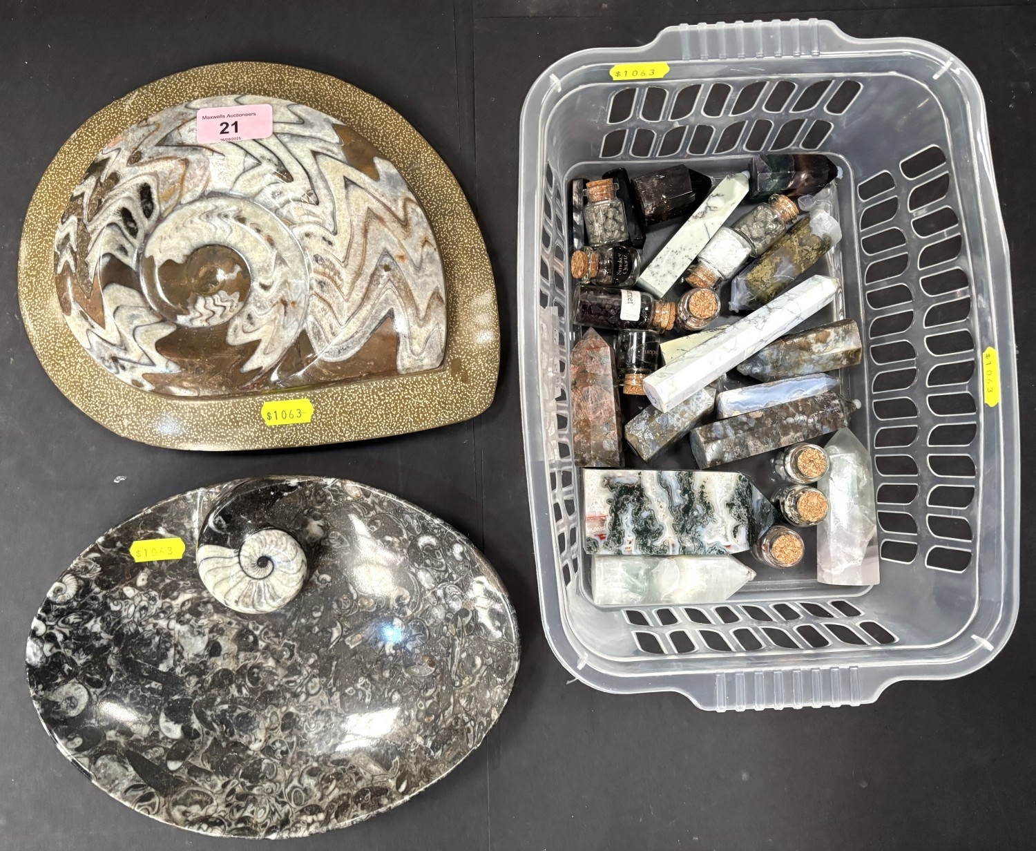 A collection of stone display specimens including large and smaller polished Ammonites, other columns