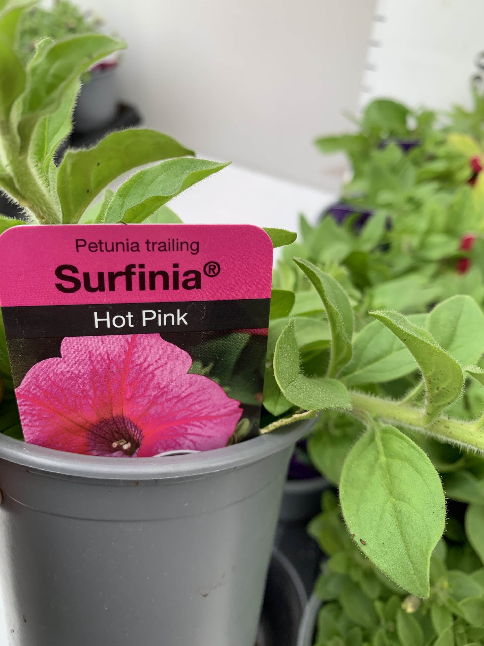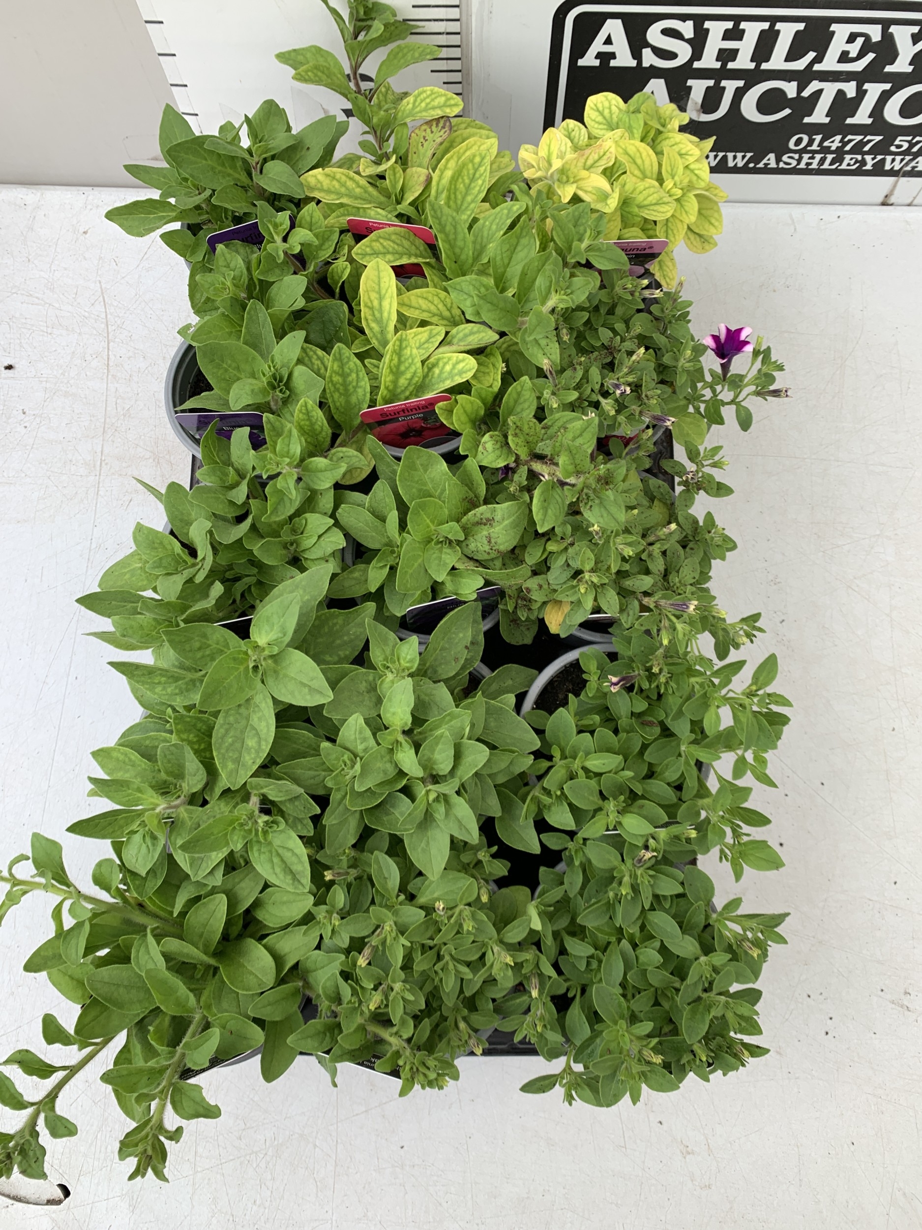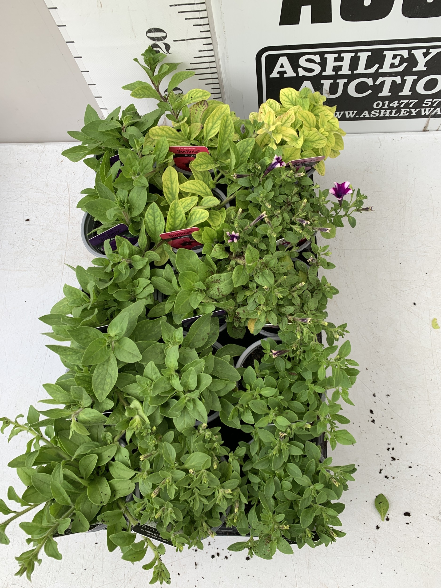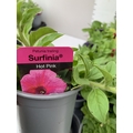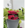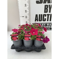 FIFTEEN MIXED BEDDING PLANTS IN P9CM POTS TO INCLUDE PETUNIA SURFINIA HOT PINK AND SHORTCAKE BLUEBERRY, SURFINIA BLUE AND PURPLE, AND TRAILING PETUNIA SANGUNA PINK VEIN. ON A TRAY TO BE SOLD FOR THE FIFTEEN
