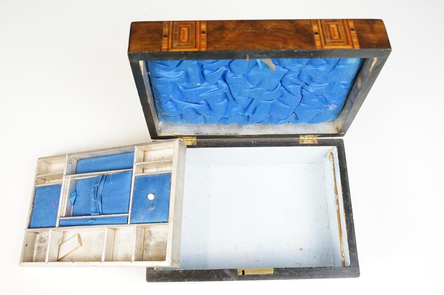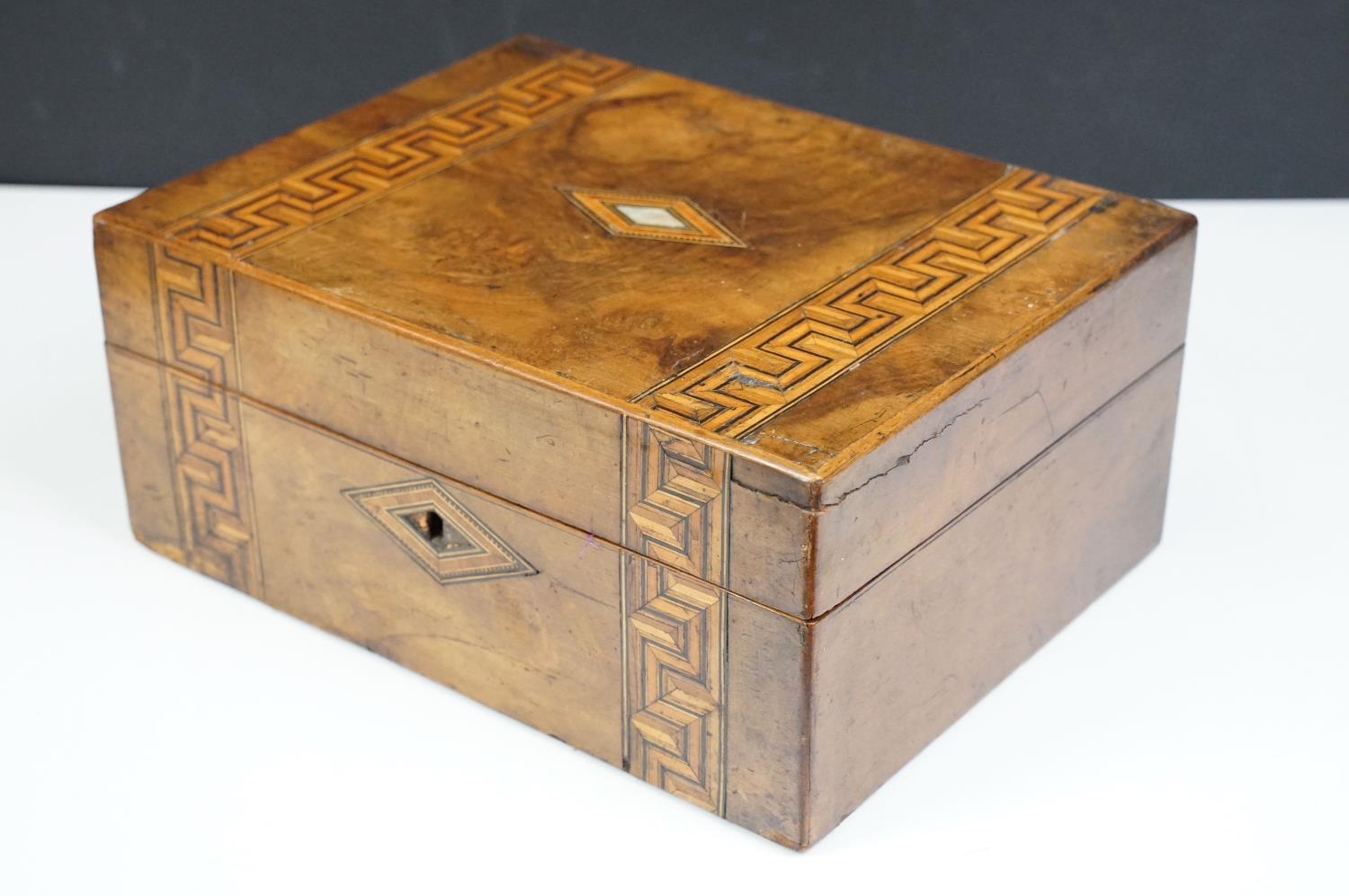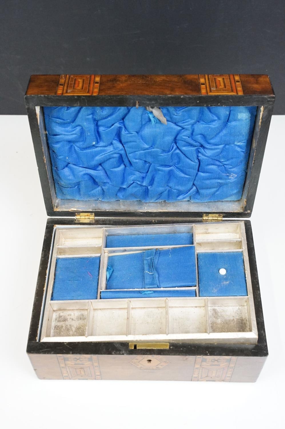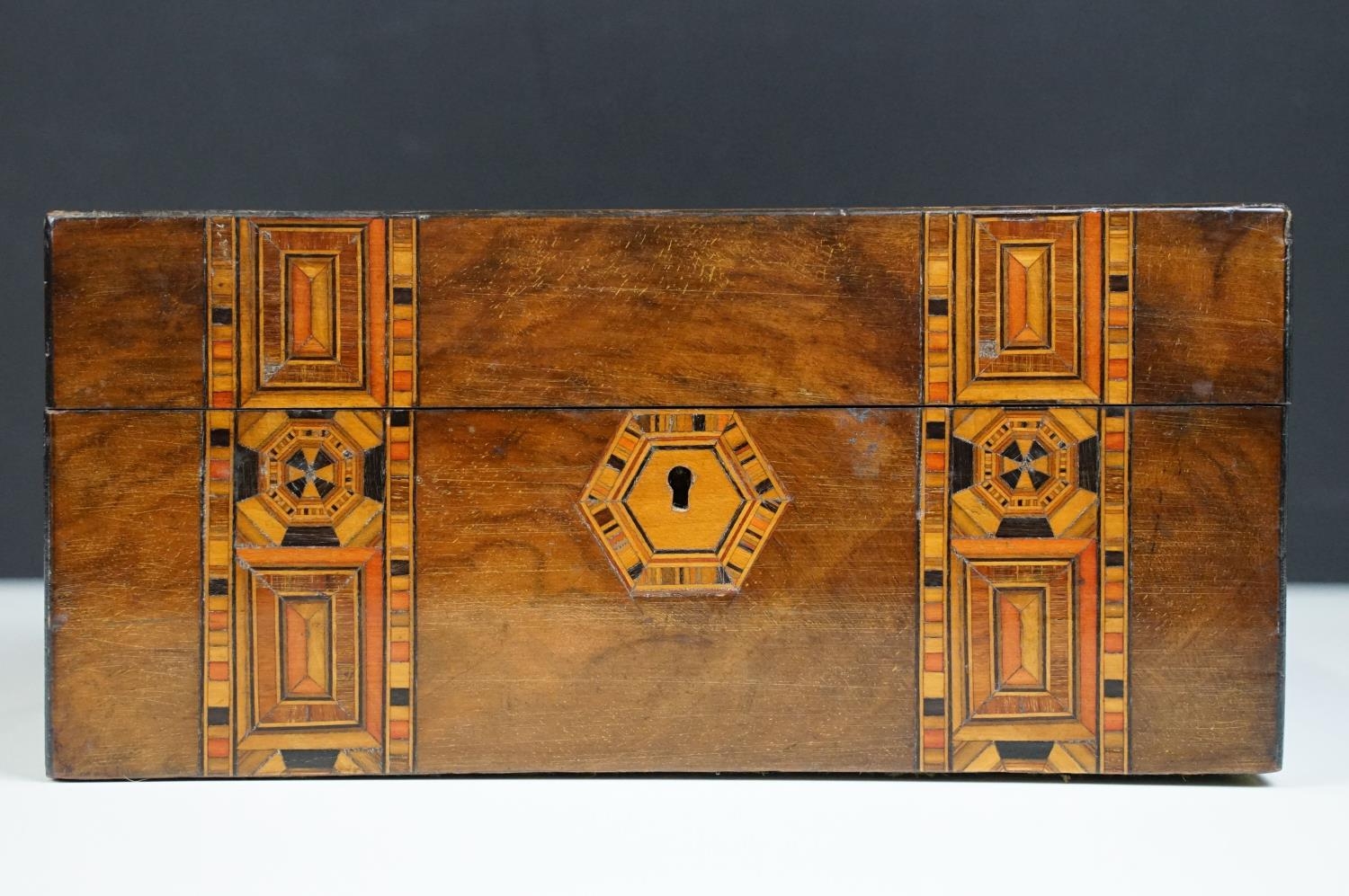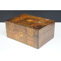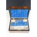 Victorian Walnut parquetry sewing box with MOP inlay and sewing related contents to include scissors, threads, pins etc together with Tunbridge jewellery, sewing box.