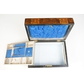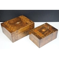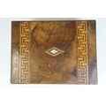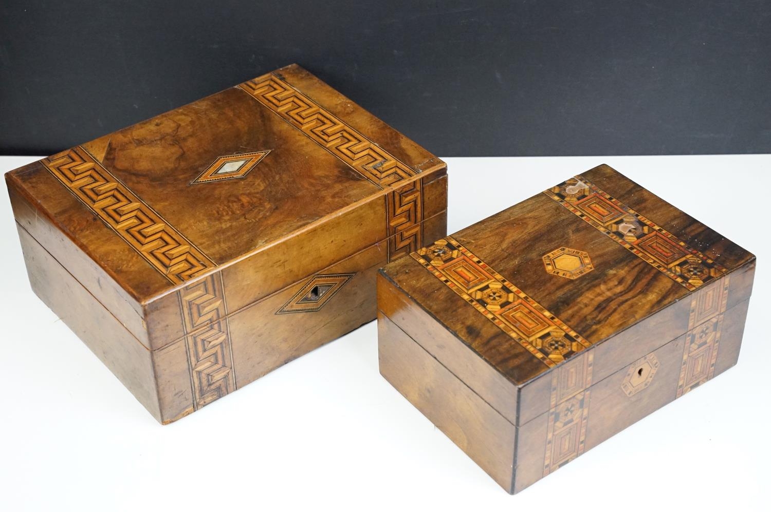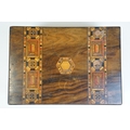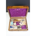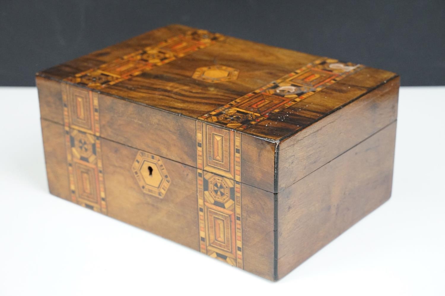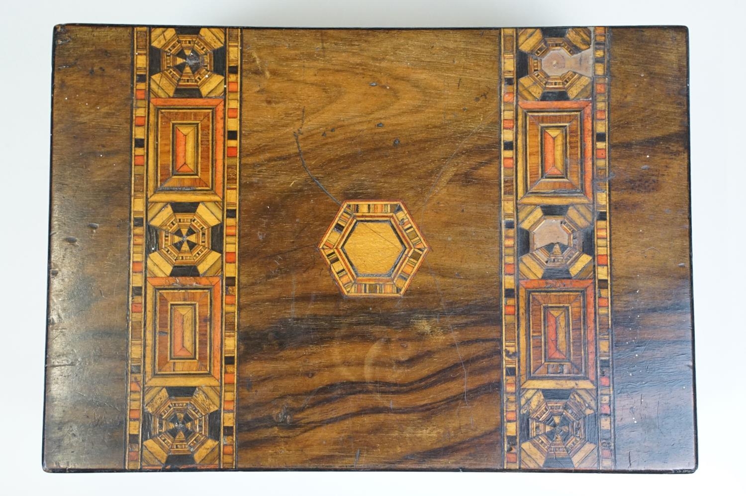 Victorian Walnut parquetry sewing box with MOP inlay and sewing related contents to include scissors, threads, pins etc together with Tunbridge jewellery, sewing box.