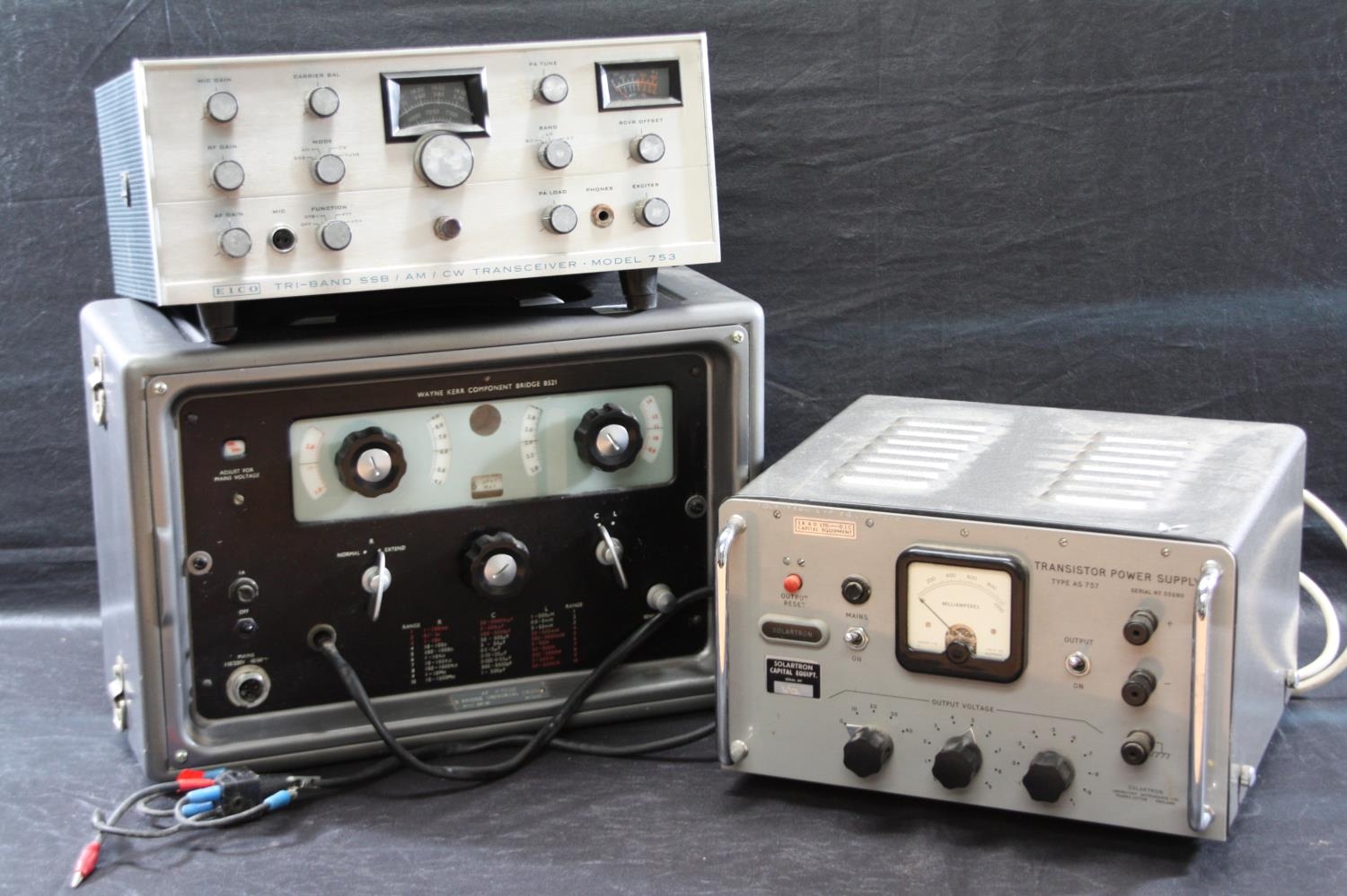 Wayne Kerr component bridge B521, Eico transceiver model 753 and a Solatron transistor power supply unit