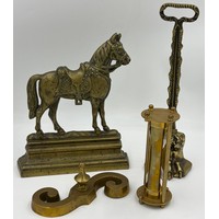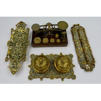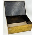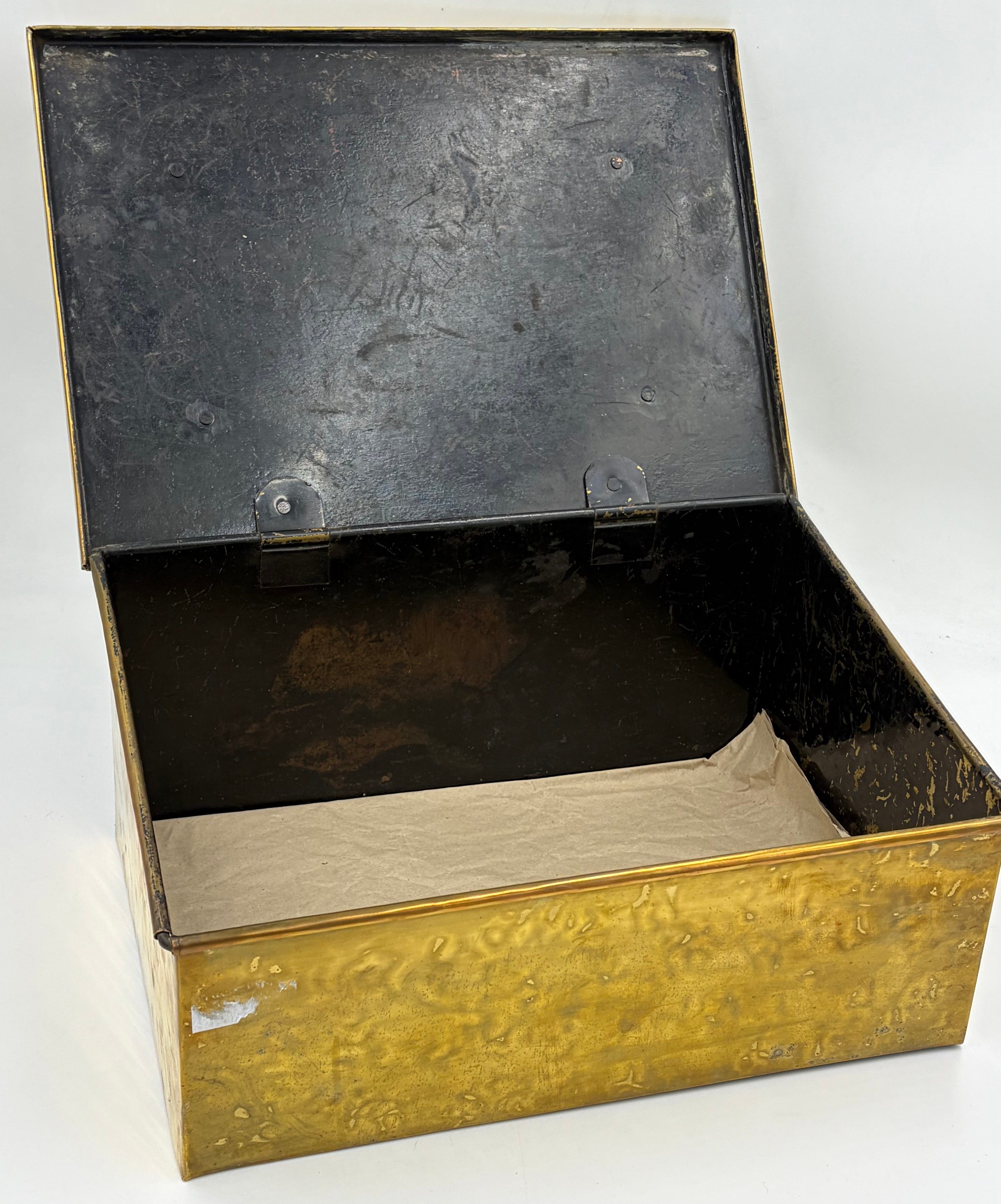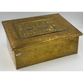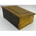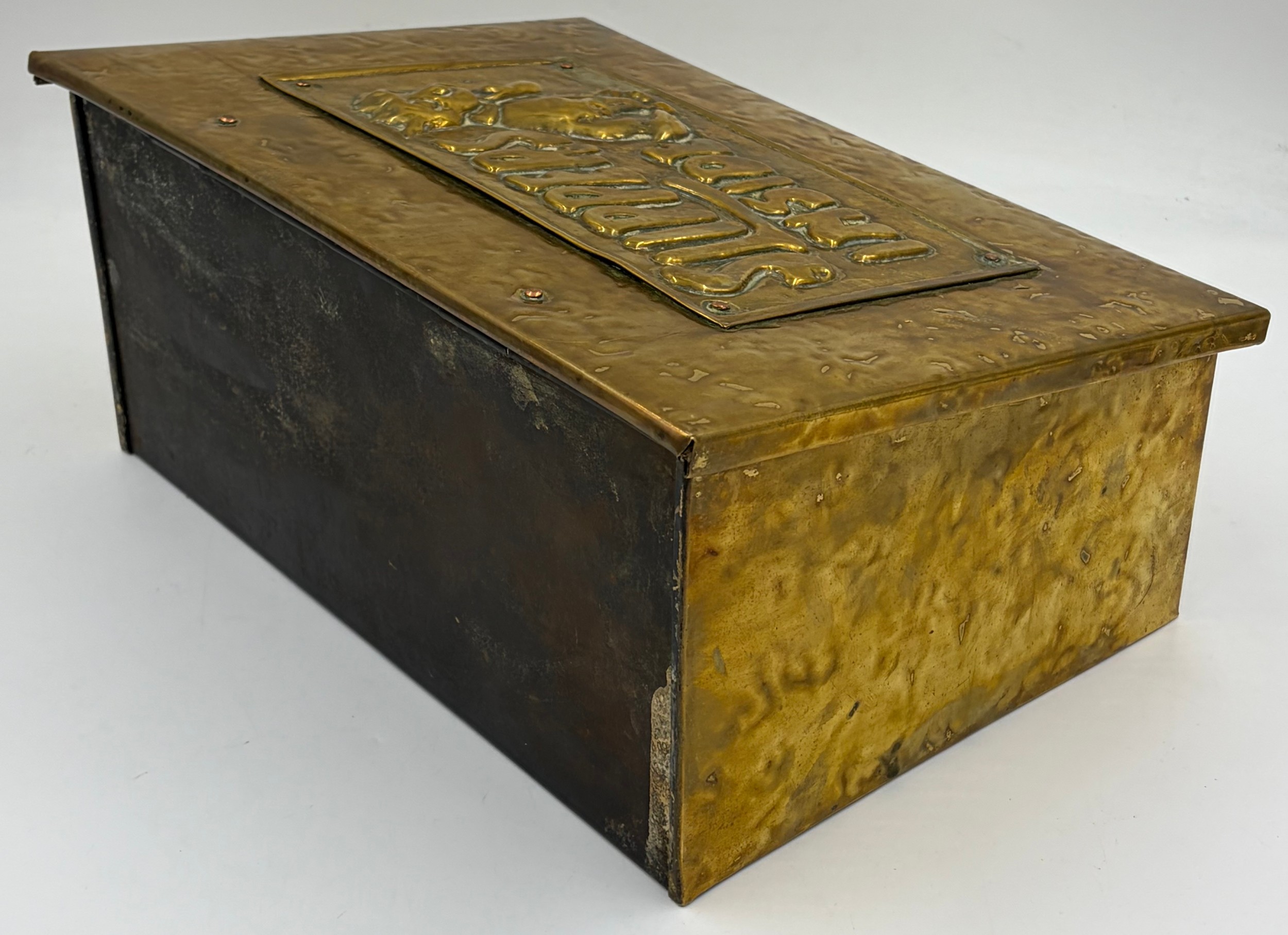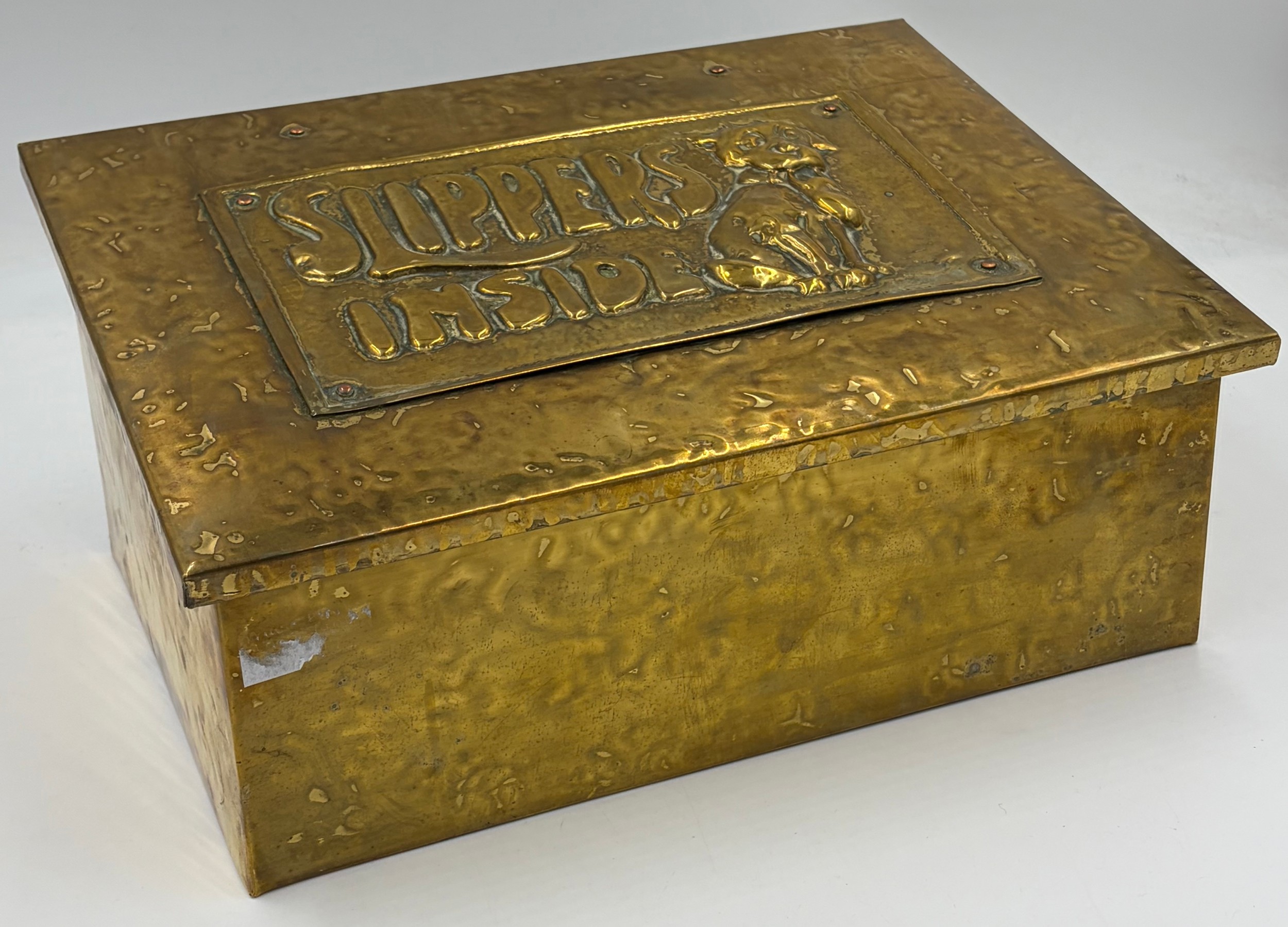 An Arts and Crafts brass clad slipper box with a hinged sloping cover embossed with a dog and inscribed Slippers 35.5cm w x 16.5cm h at back x 25cm deep.
