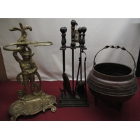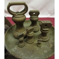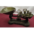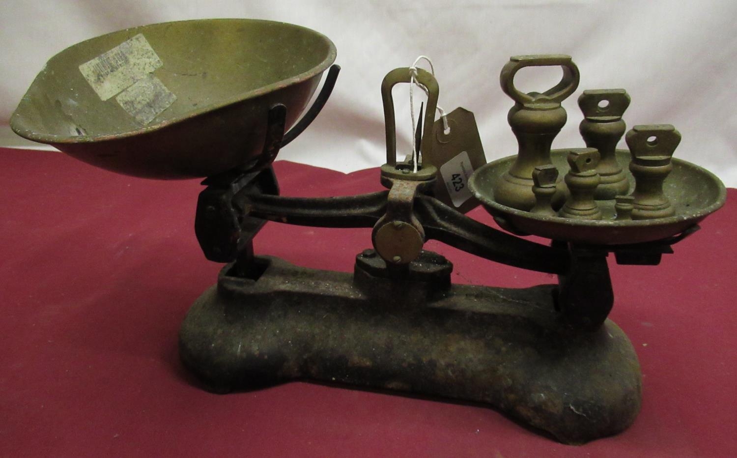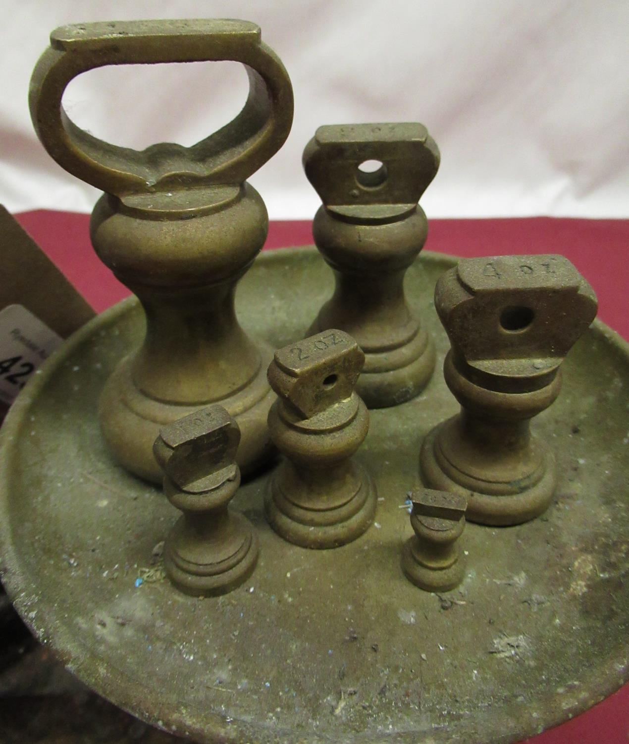 Pair of early C20th kitchen scales with brass pans and brass dumbbell weights, 1lb, 8oz, 4oz, 2oz, 1oz and 1/2oz