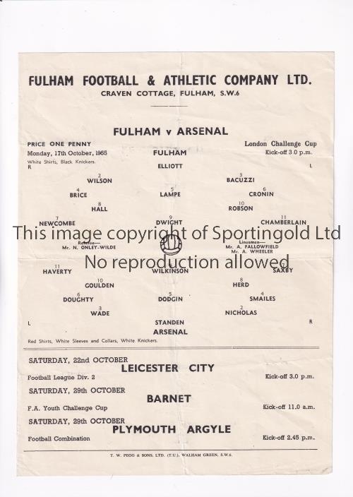 ARSENAL Single sheet programme for the away London Challenge Cup tie v Fulham 17/10/1955, slightly creased. Generally good