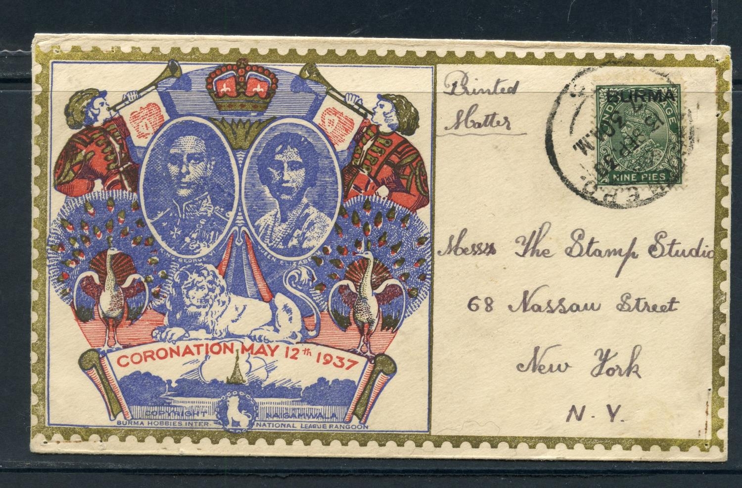 BURMA 1937 illustrated Coronation cover to USA. Good condition.