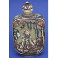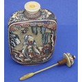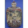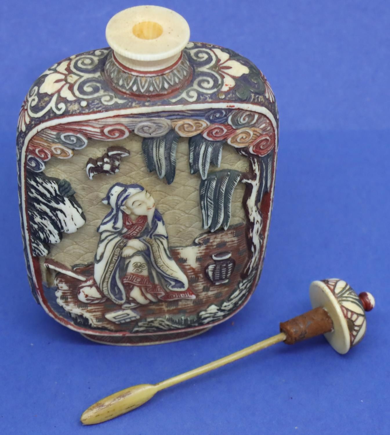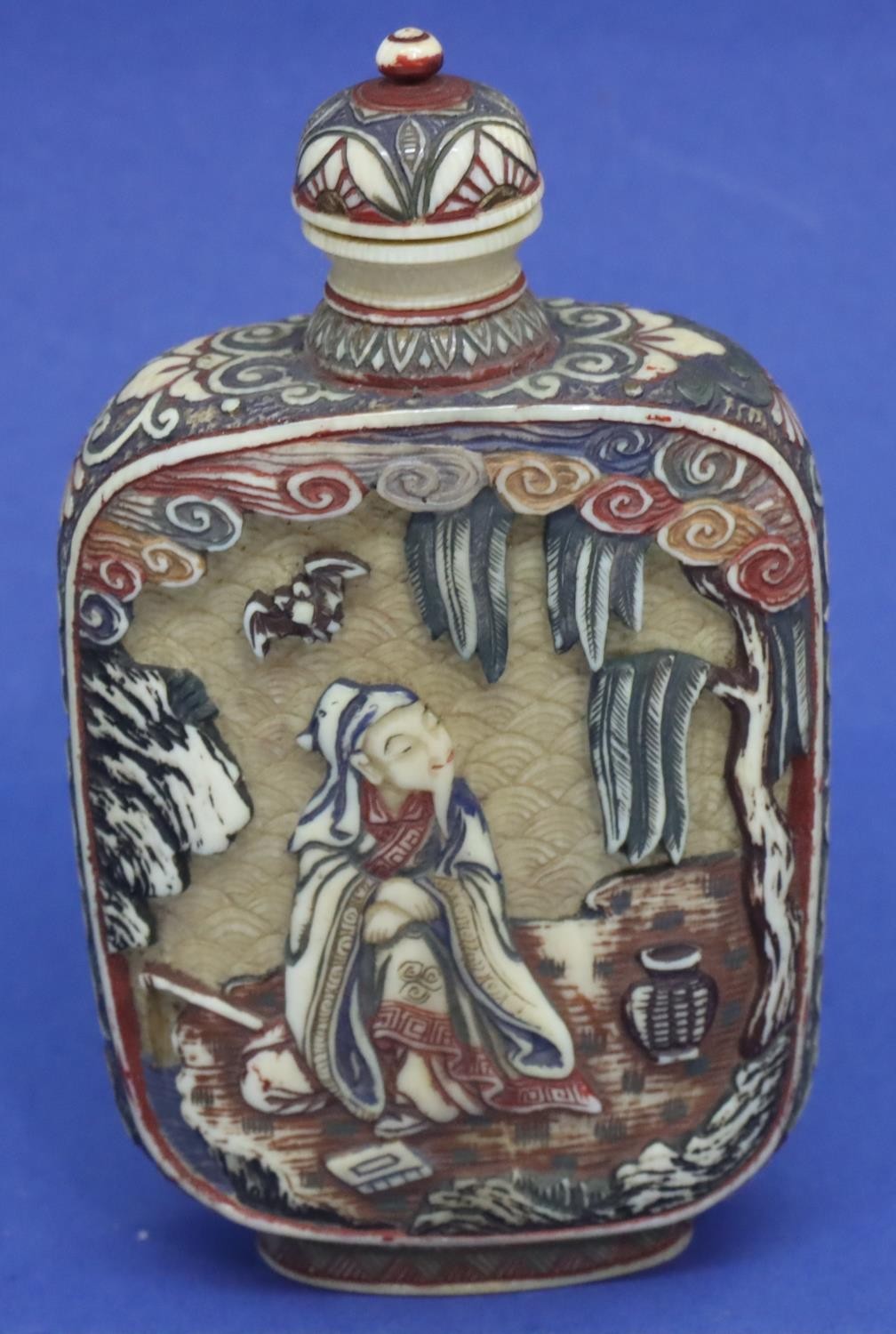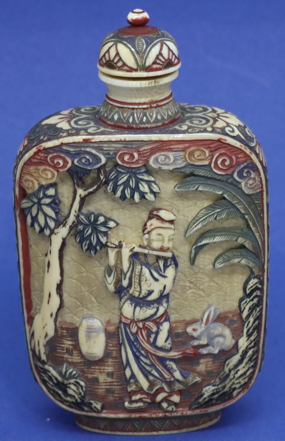 Polychrome ivory snuff bottle with a day scene featuring a flautist and a rabbit and a night scene with the resting flutist and a bat, H: 94 mm. P&P Group 1 (£14+VAT for the first lot and £1+VAT for subsequent lots)