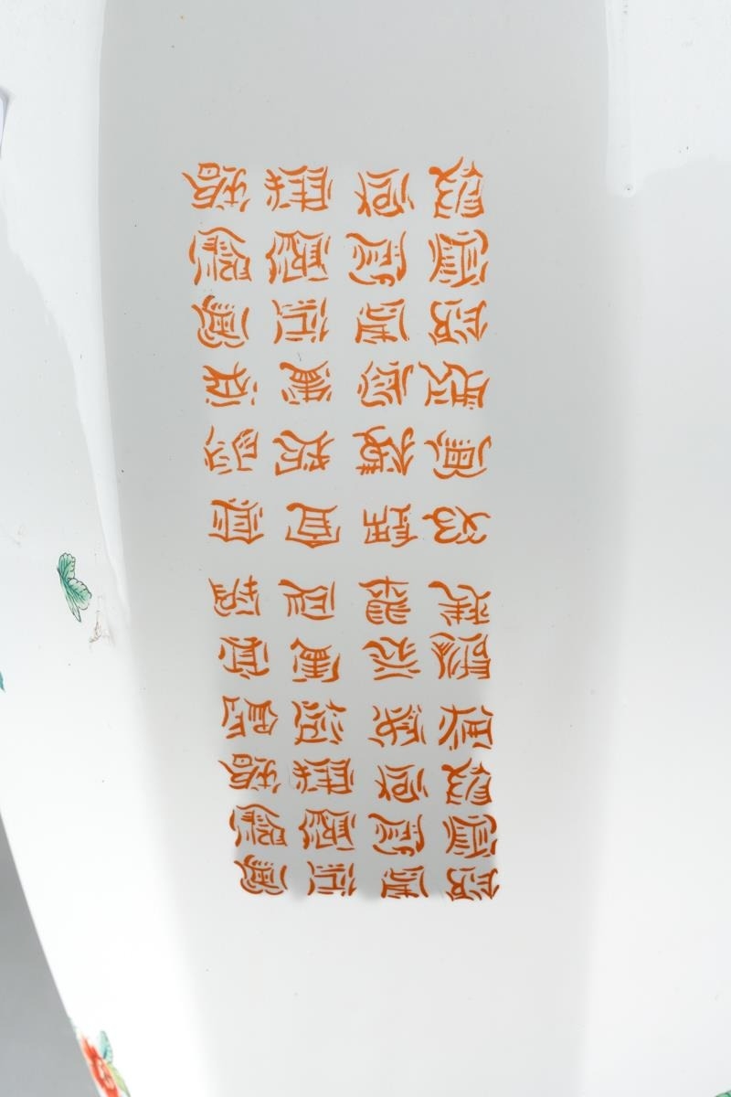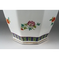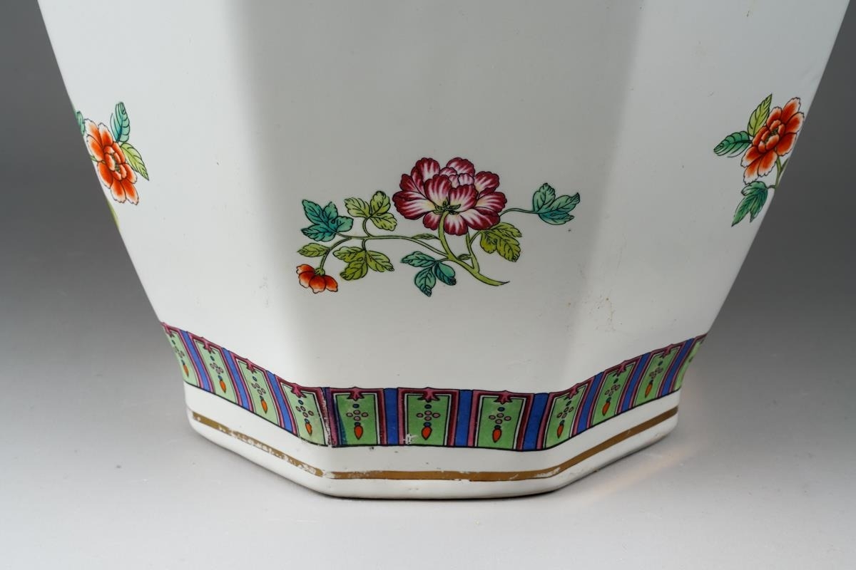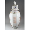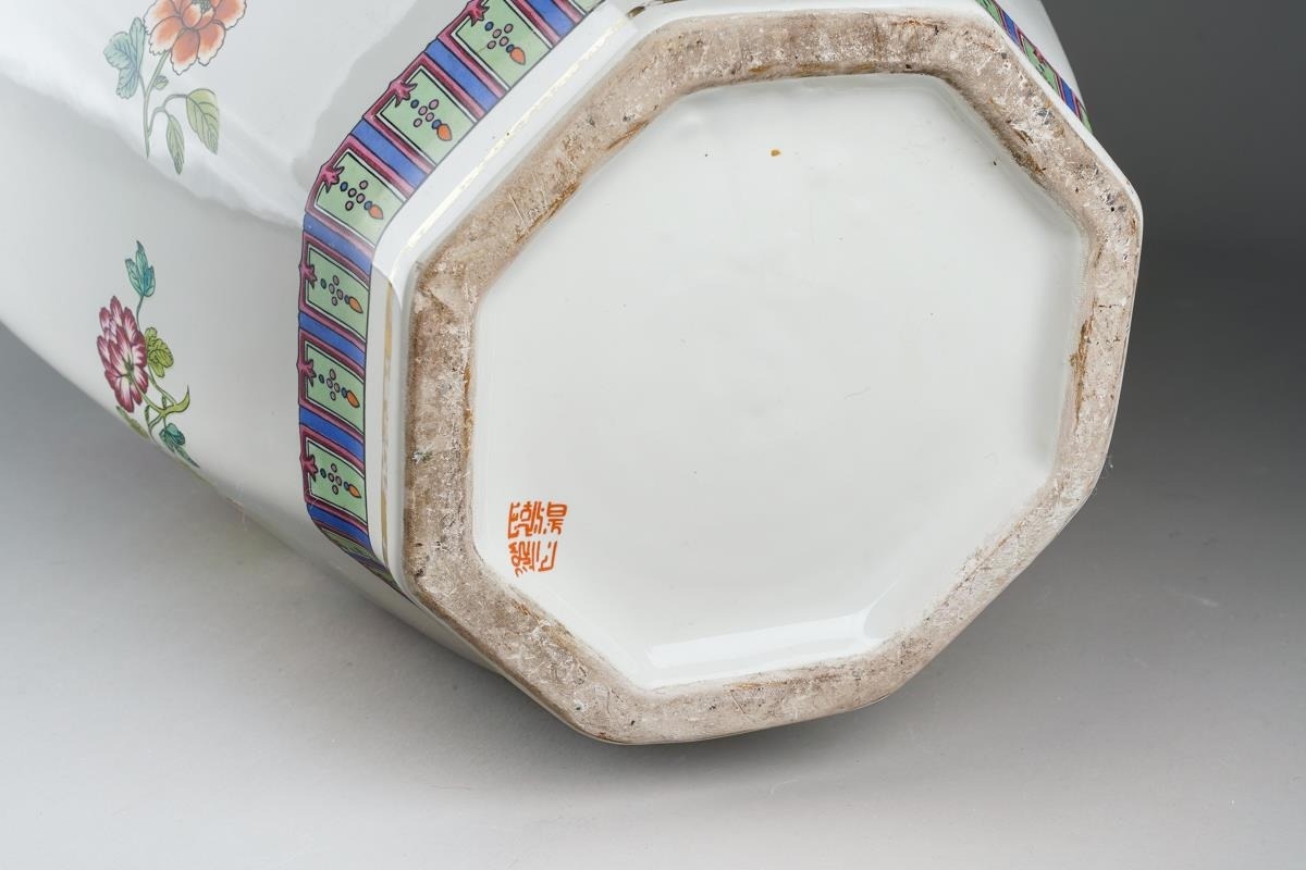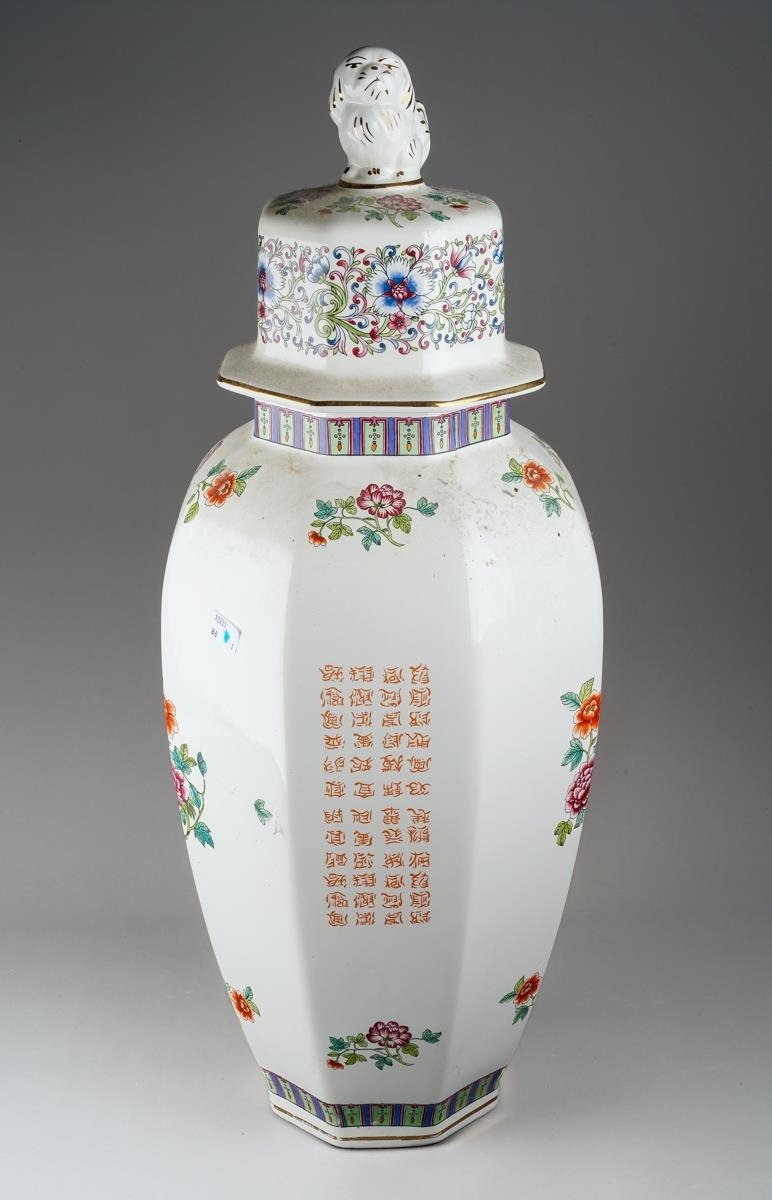A Chinese octagonal large vase and cover, decorated with flowers and character marks, the cover with Pekinese finial., character marks to base, approx 72cm high [1]