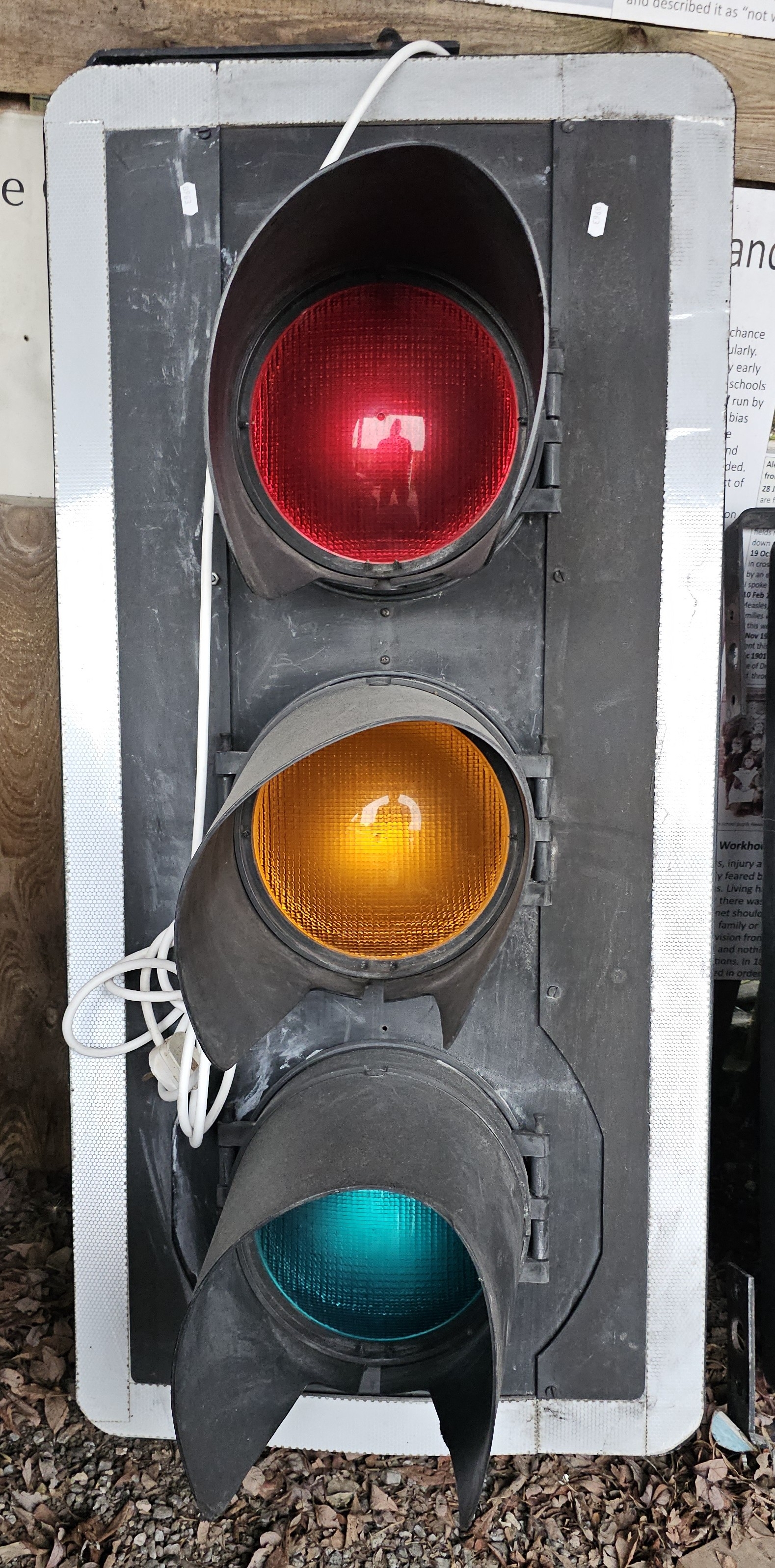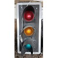 A large vintage 20th-century traffic light, plastic case finished in black with glass coloured traffic control lights, rewired with 12V halogen bulbs with a transformer, 120 x 56cm