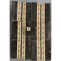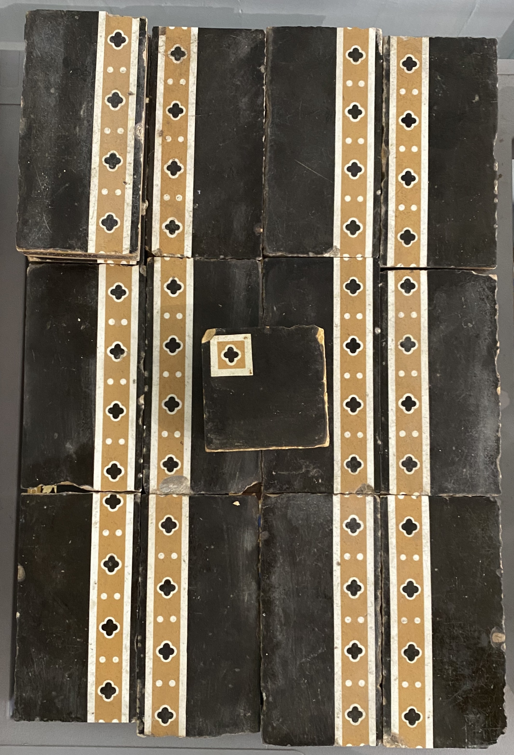 Thirteen Minton & Co encaustic border tiles and one part tile, with repeating quatrefoil in white and buff on black background 14cm by 7.6cm