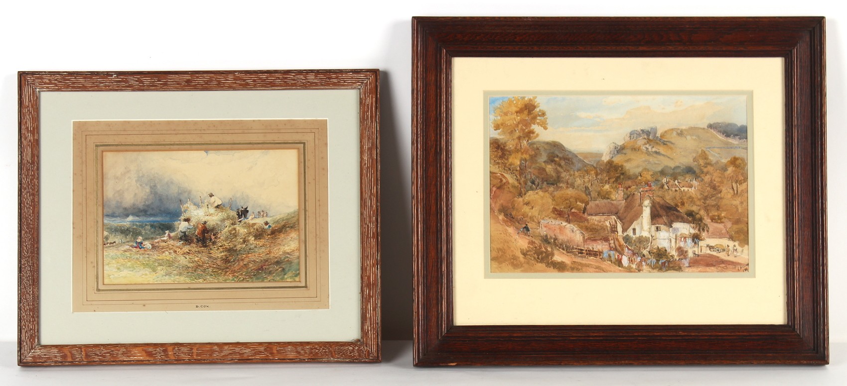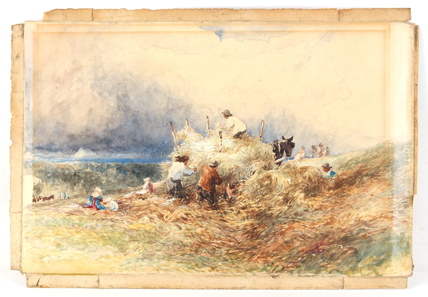Property of a deceased estate - follower of David Cox Snr. OWS (1783-1859) - HARVESTING THE HAY - watercolour, 6.5 by 9.9ins. (16.5 by 25cms.), in glazed frame; together with