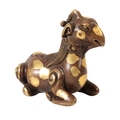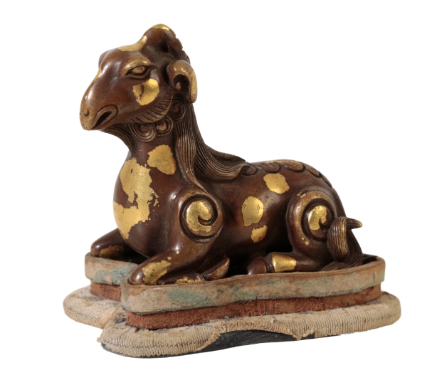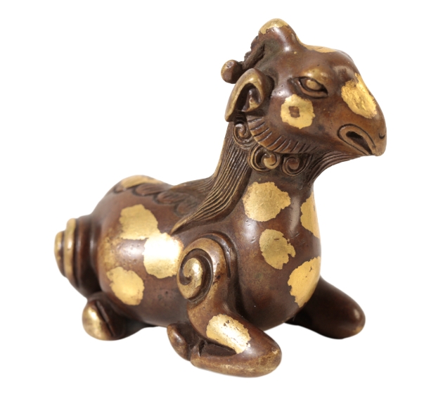 A CHINESE BRONZE SCROLL-WEIGHT modelled as a recumbent goat with well defined mane and curly tail and ' gold - splash' markings, early Qing or later, 7.5cm long