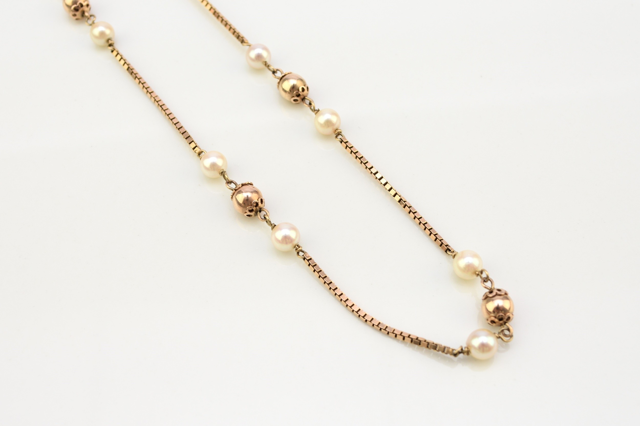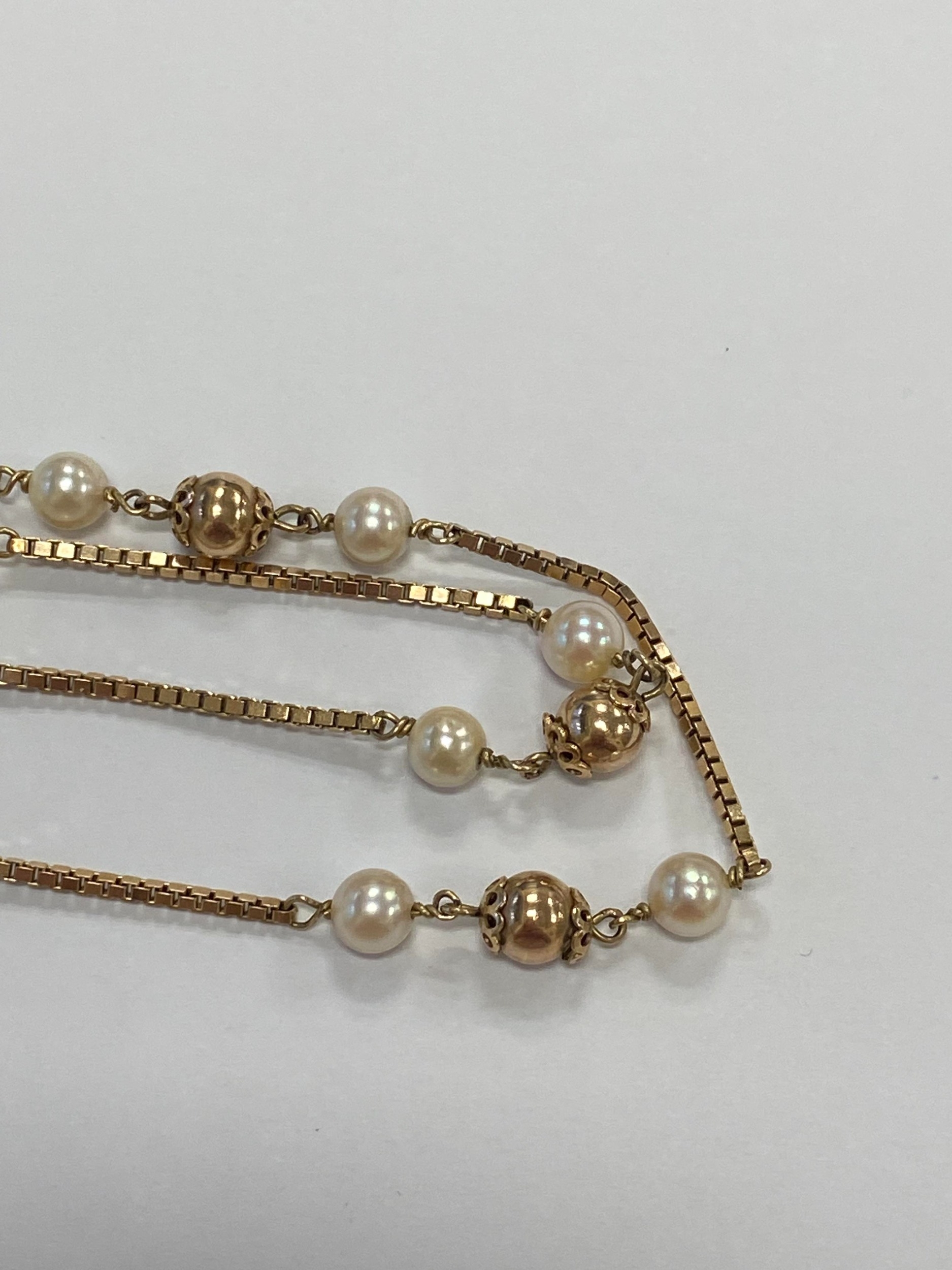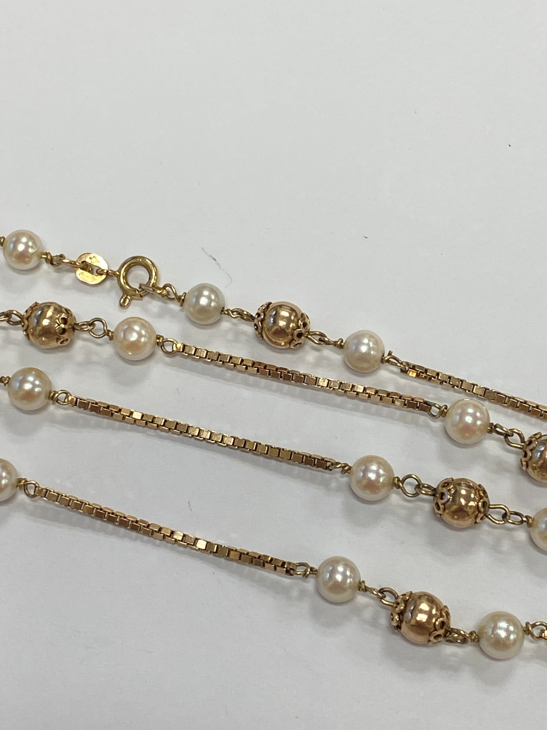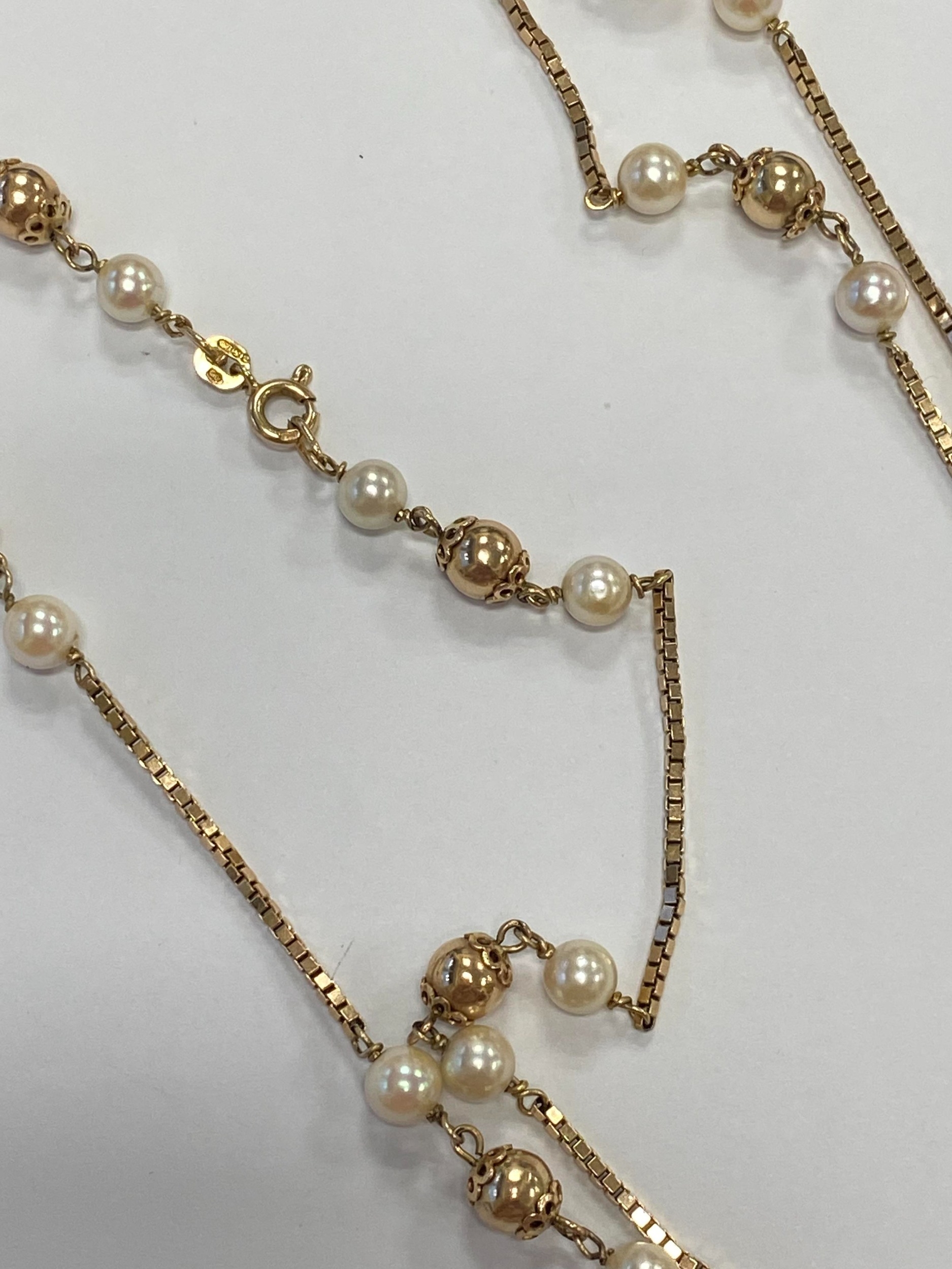 A 9ct gold cultured pearl set necklace, the 9ct gold box link chain set with eleven polished gold beads each flanked to each side by a single cultured pearl, all with bolt ring clasp, 72cm long, weight approx 19.5g Condition:London import hallmark for 1977, general wear but no significant visible damage, refer to images