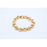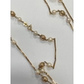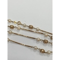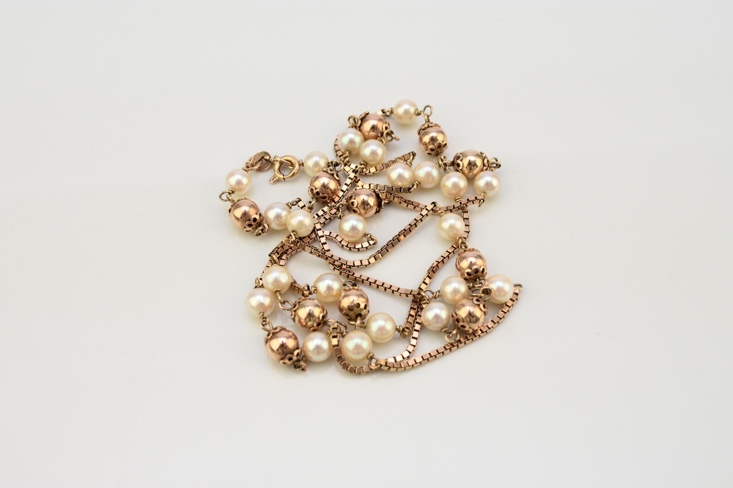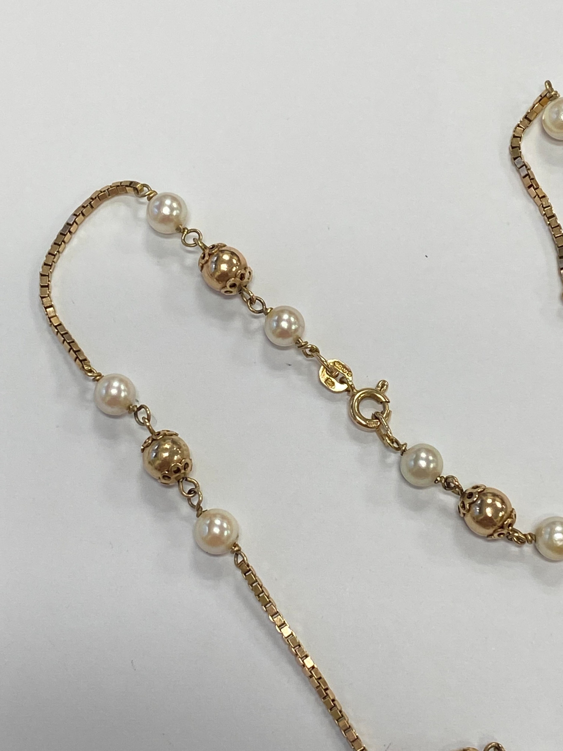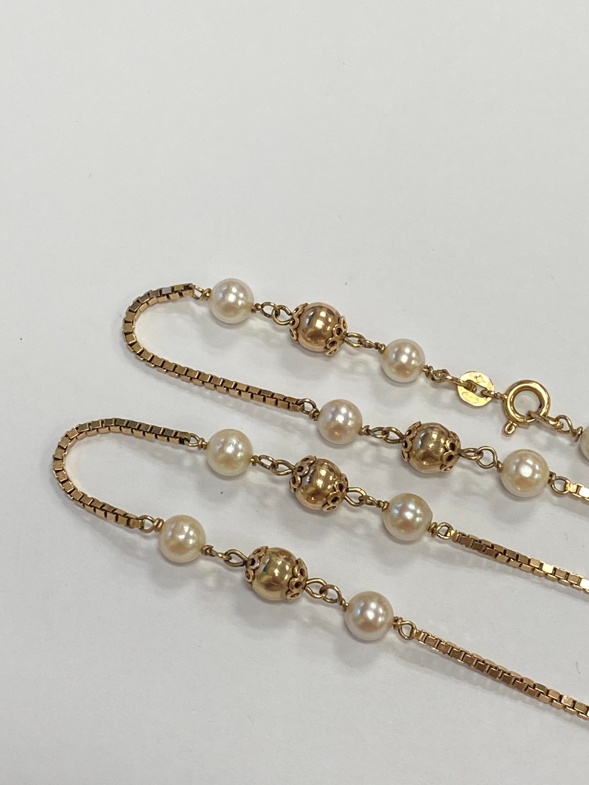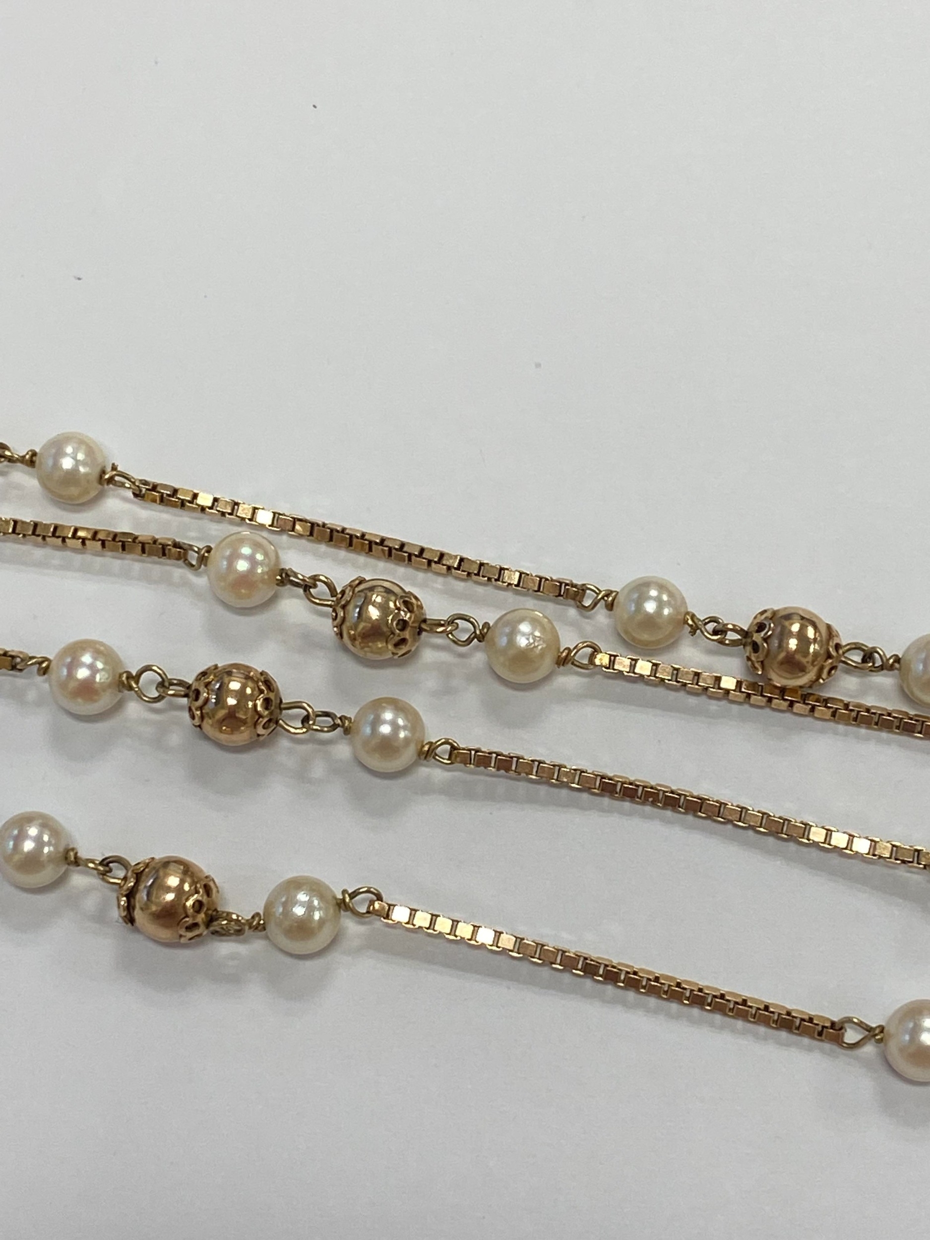 A 9ct gold cultured pearl set necklace, the 9ct gold box link chain set with eleven polished gold beads each flanked to each side by a single cultured pearl, all with bolt ring clasp, 72cm long, weight approx 19.5g Condition:London import hallmark for 1977, general wear but no significant visible damage, refer to images