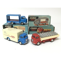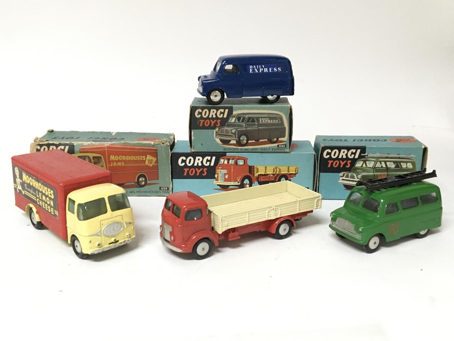 Corgi toys, #459 ERF model 44G Moorhouses van, no box ends, #452 Commer dropside lorry, #405 Bedford Utilecon AFS tender and #403 Bedford van Daily Express, boxed