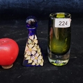 Two vintage glass items including a hand painted blue decanter and a heavy green smoked glass bud vase.