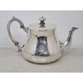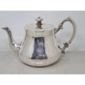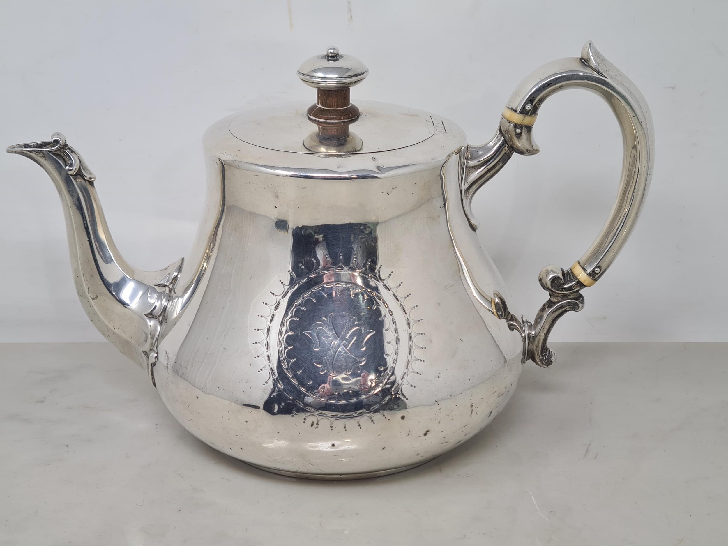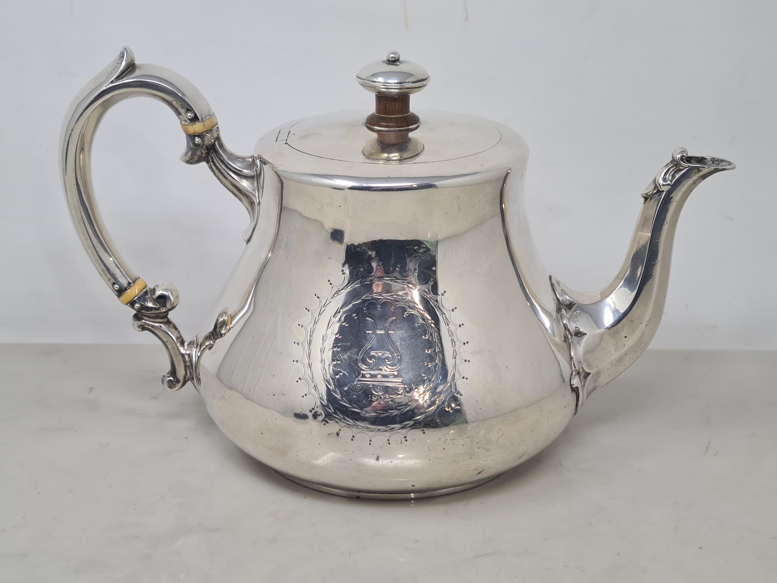 A Victorian silver teapot of bellied form engraved lyre crest and initials within circular cartouches, 1867, maker: R.H, 620gms