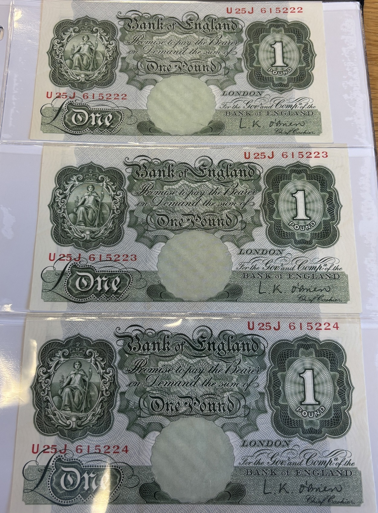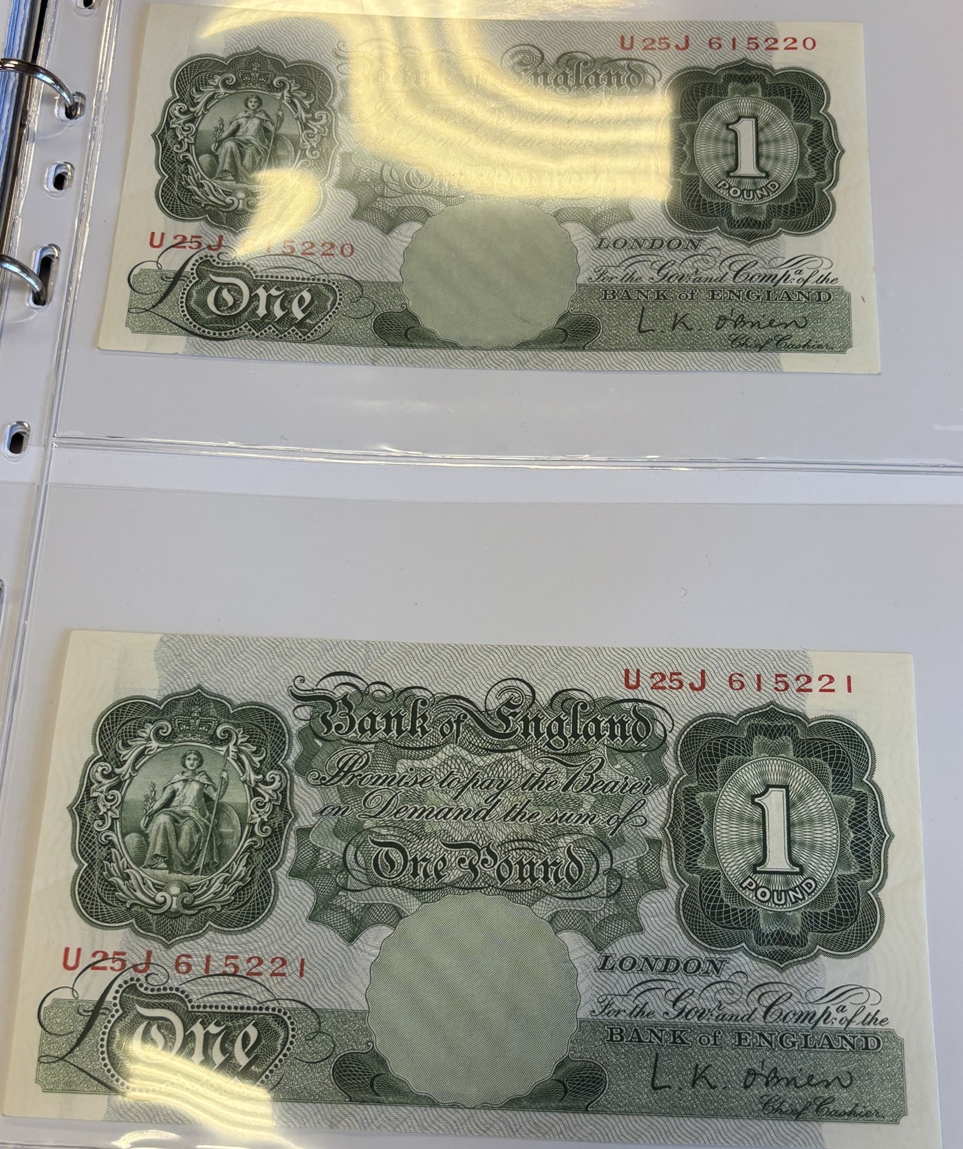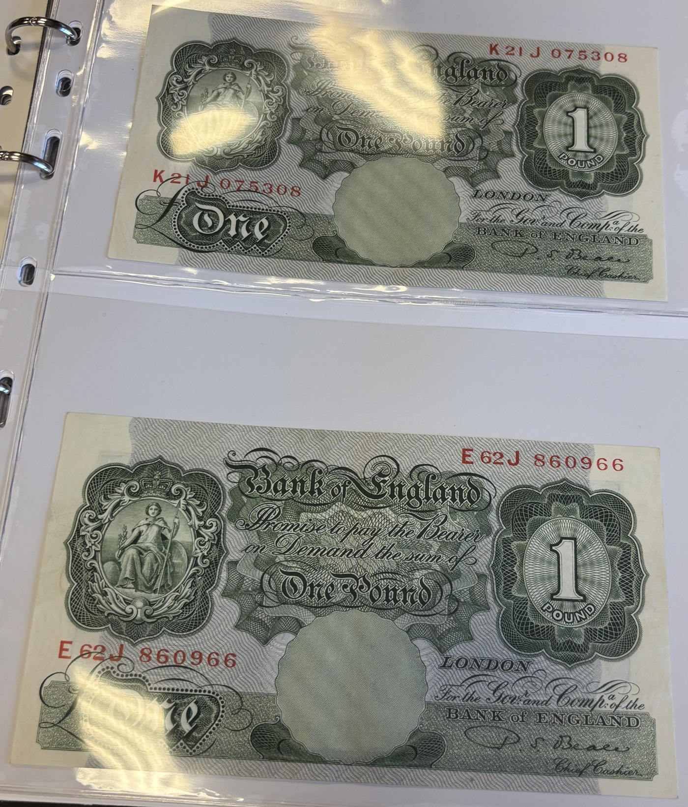 Collection in one album, generally very fine to extremely fine, including Mahon 1928 £1 A13 271361 first series, Beale 1950 £1 H38B, K08J, K21J, E62J, B65J, B86J, J50J, H10J, H39J, H89J, L56C, 10/- L36Z, N82Z, O'Brien 1955 £1 U25J consecutives (5), L19K, 10/- E86Y, 1957 £5 A64 and 1961 £5 K36. Qty 23. (V)