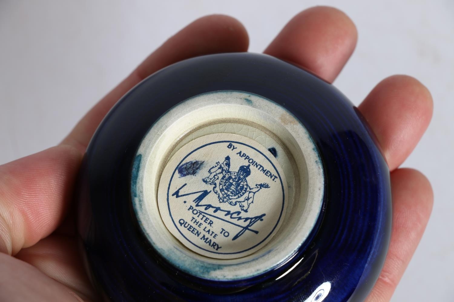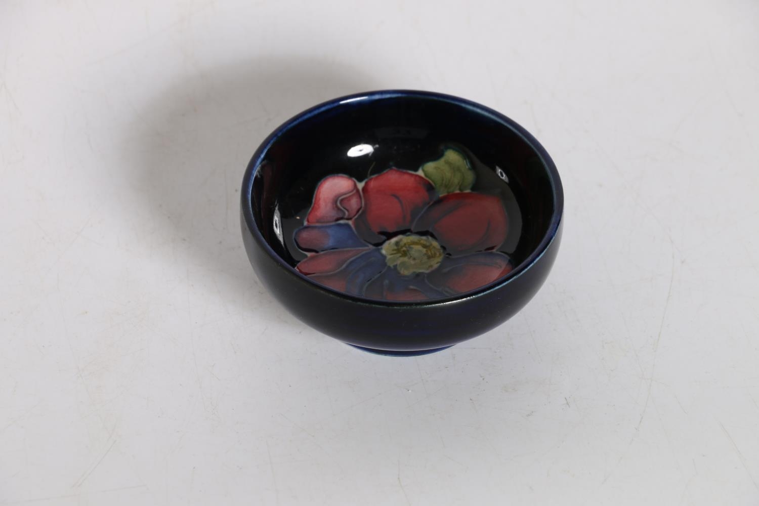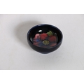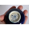 Moorcroft blue ground dish with label to reverse, 8cm diameter.