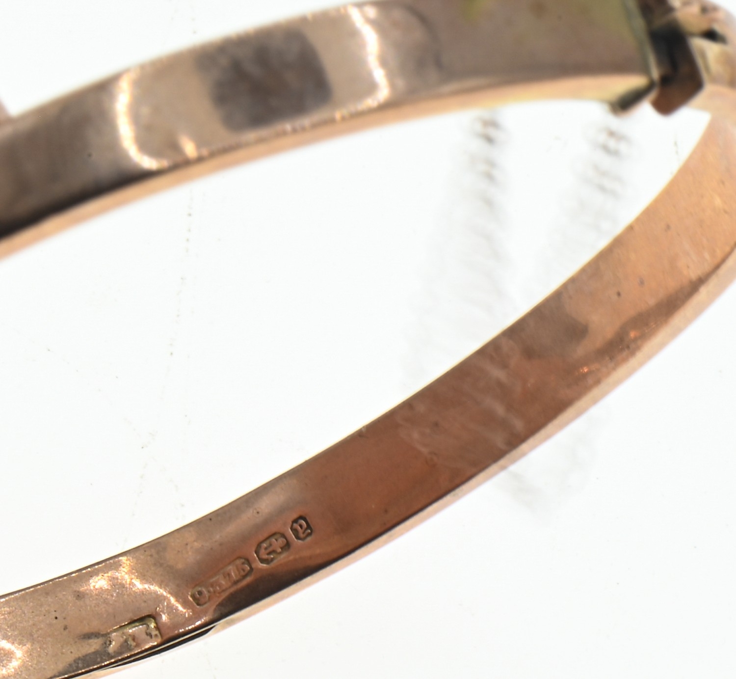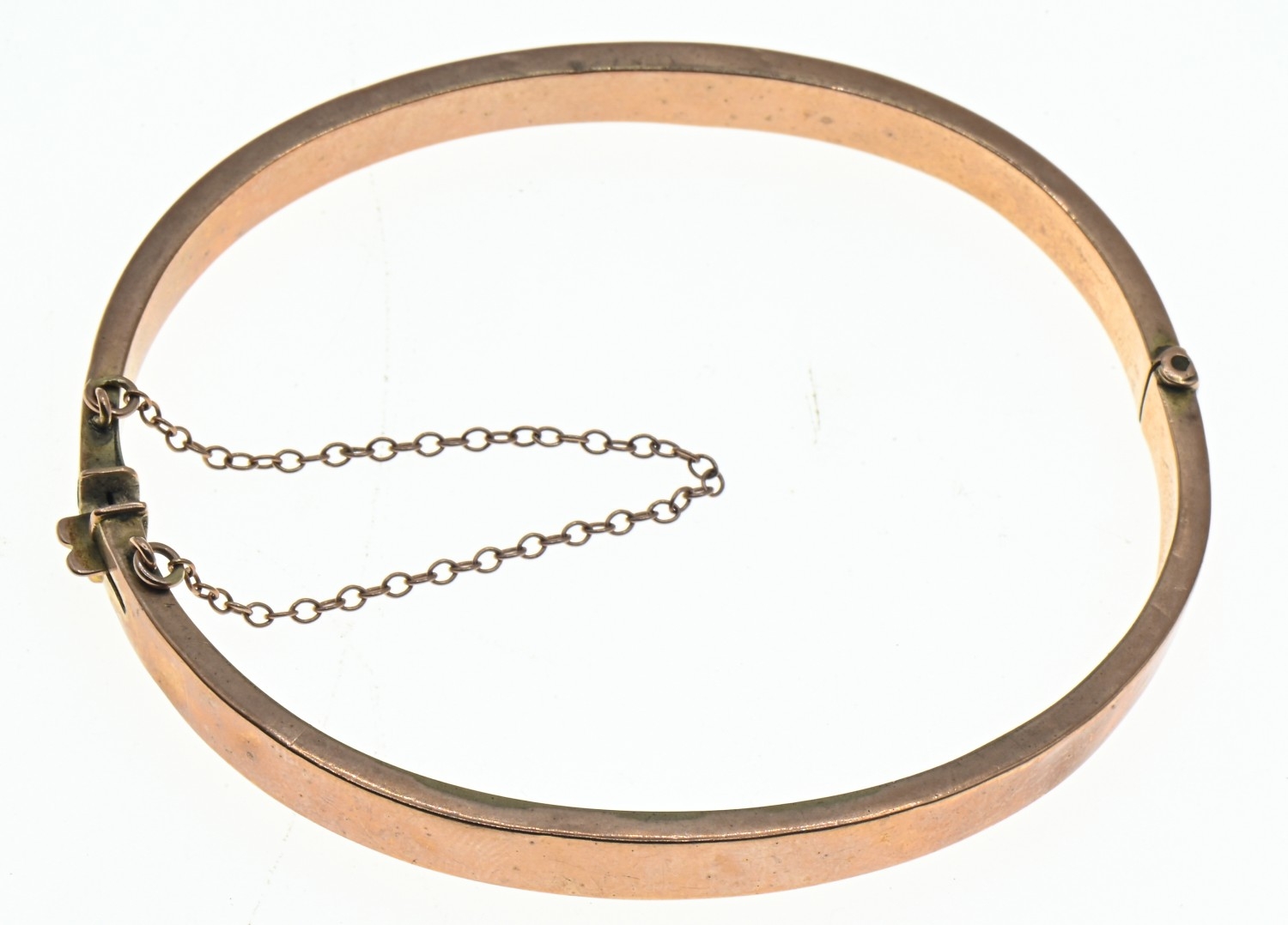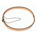 Late Victorian 9ct rose gold hinged bracelet, Birmingham 1898, with safety chain, inner width 58mm, 6.5 grams