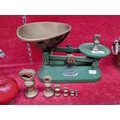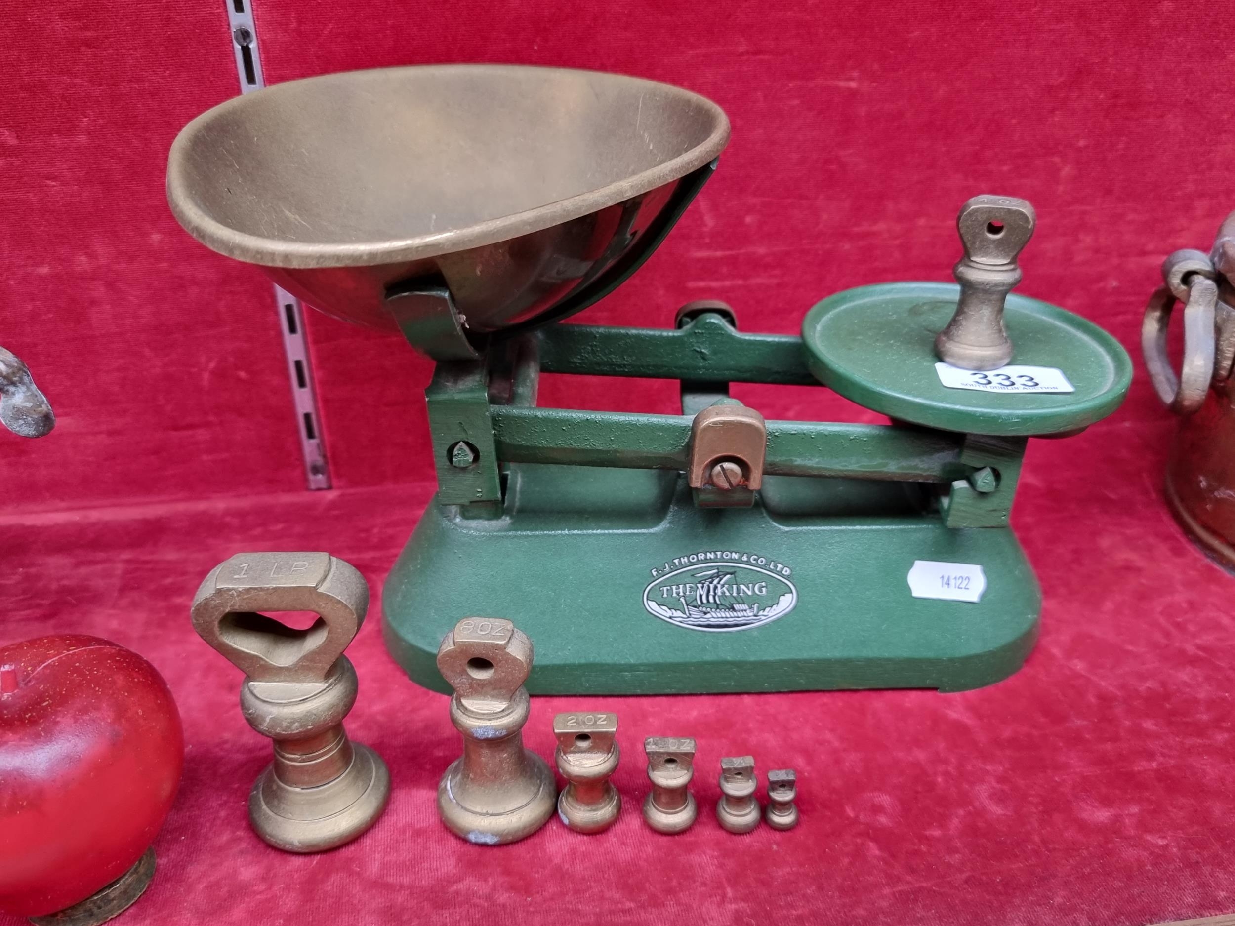 A complete Grover's weiging scales by F.J Thornton & Co in the Viking model. Complete with a set of seven brass weights weighing a total of 1Lb and 15 3/4 oz.