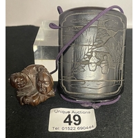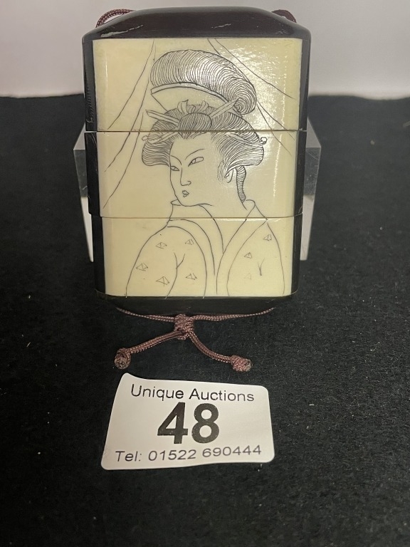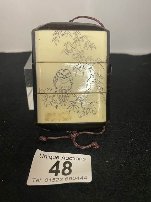 A Japanese carved bone inro with geisha & owl design