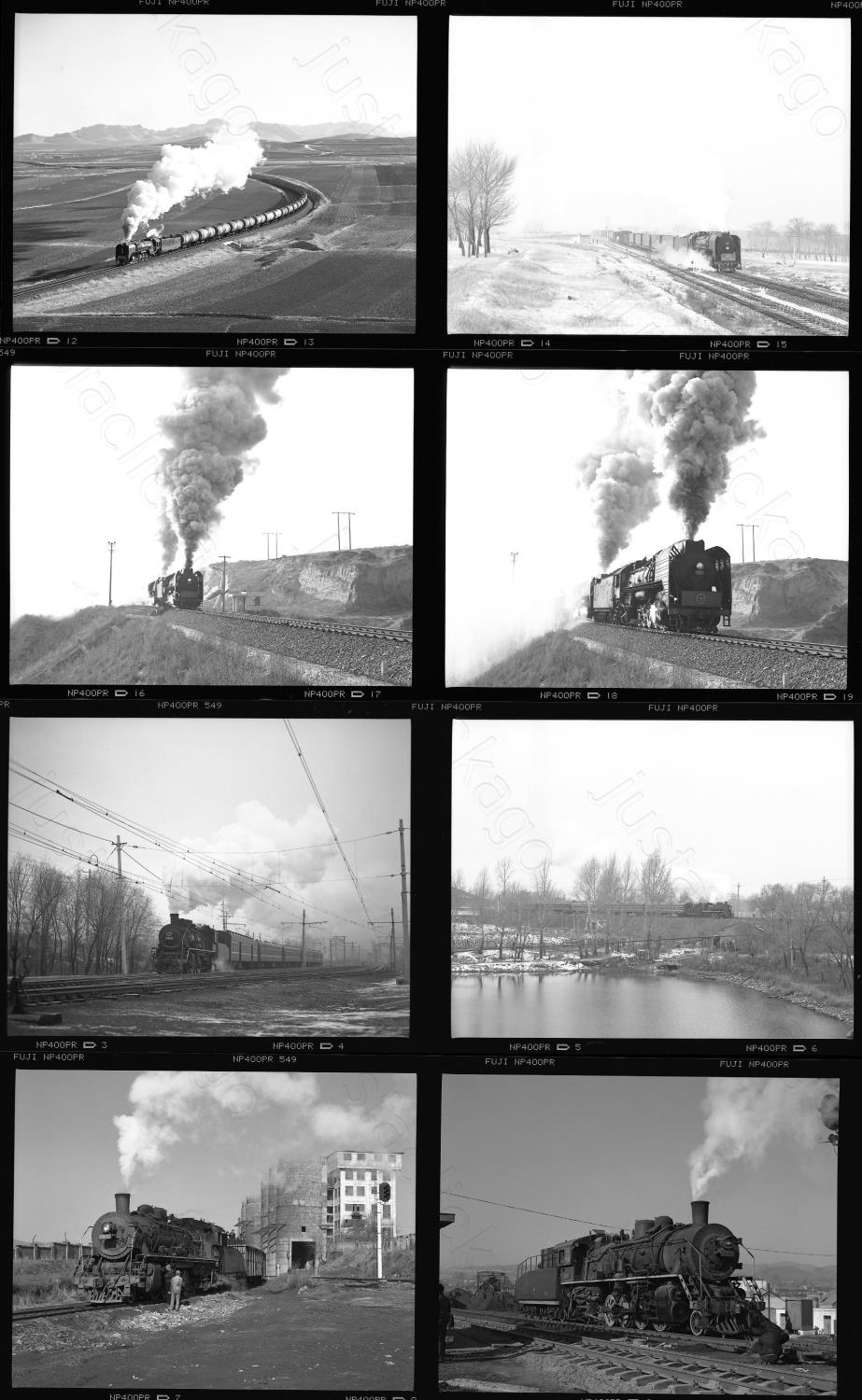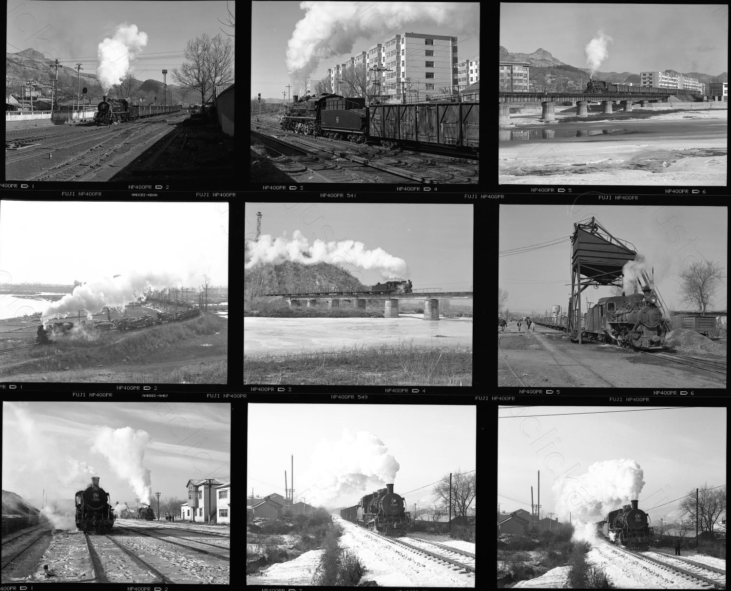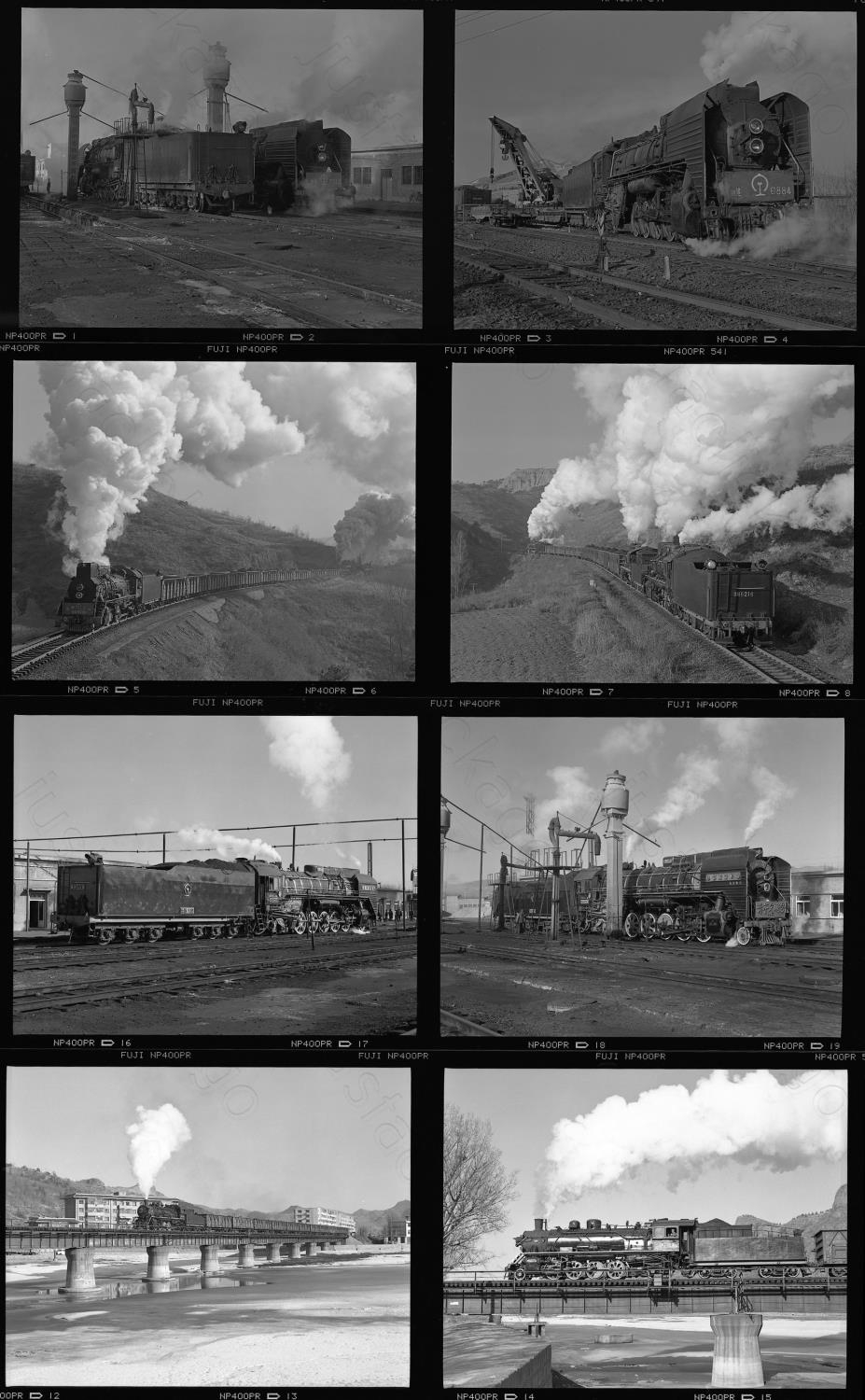 Railway. Overseas Traction-China. A good quality selection of approx. 170, medium format, black and white negatives, stored in negative sleeves, with accompanying contact print sheets (not all present). The negatives feature mostly working steam and some modern traction locomotives in CHINA, from the mountains to the city and industrial zones. There are some fine photographs in this lot, sadly no captions, however, they are sold with copyright. Sample illustrated.