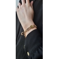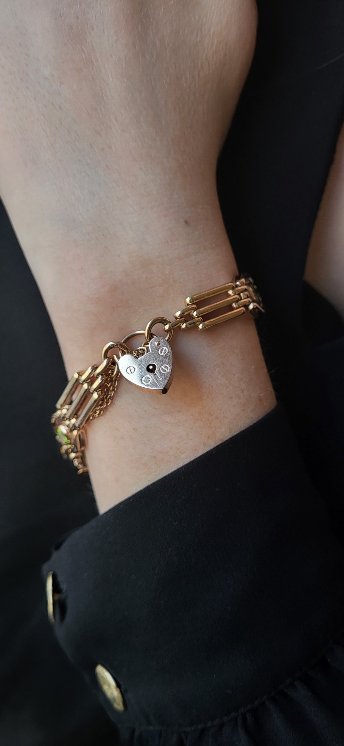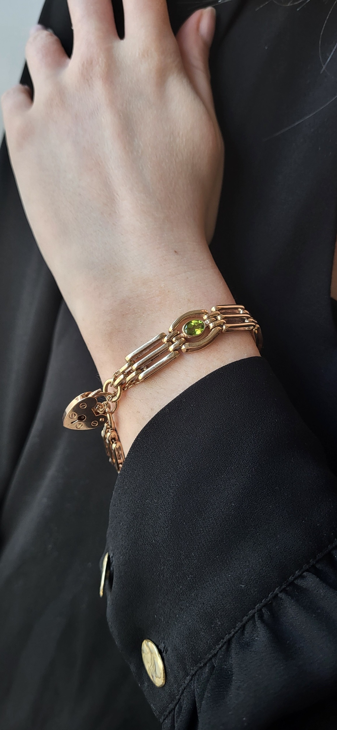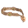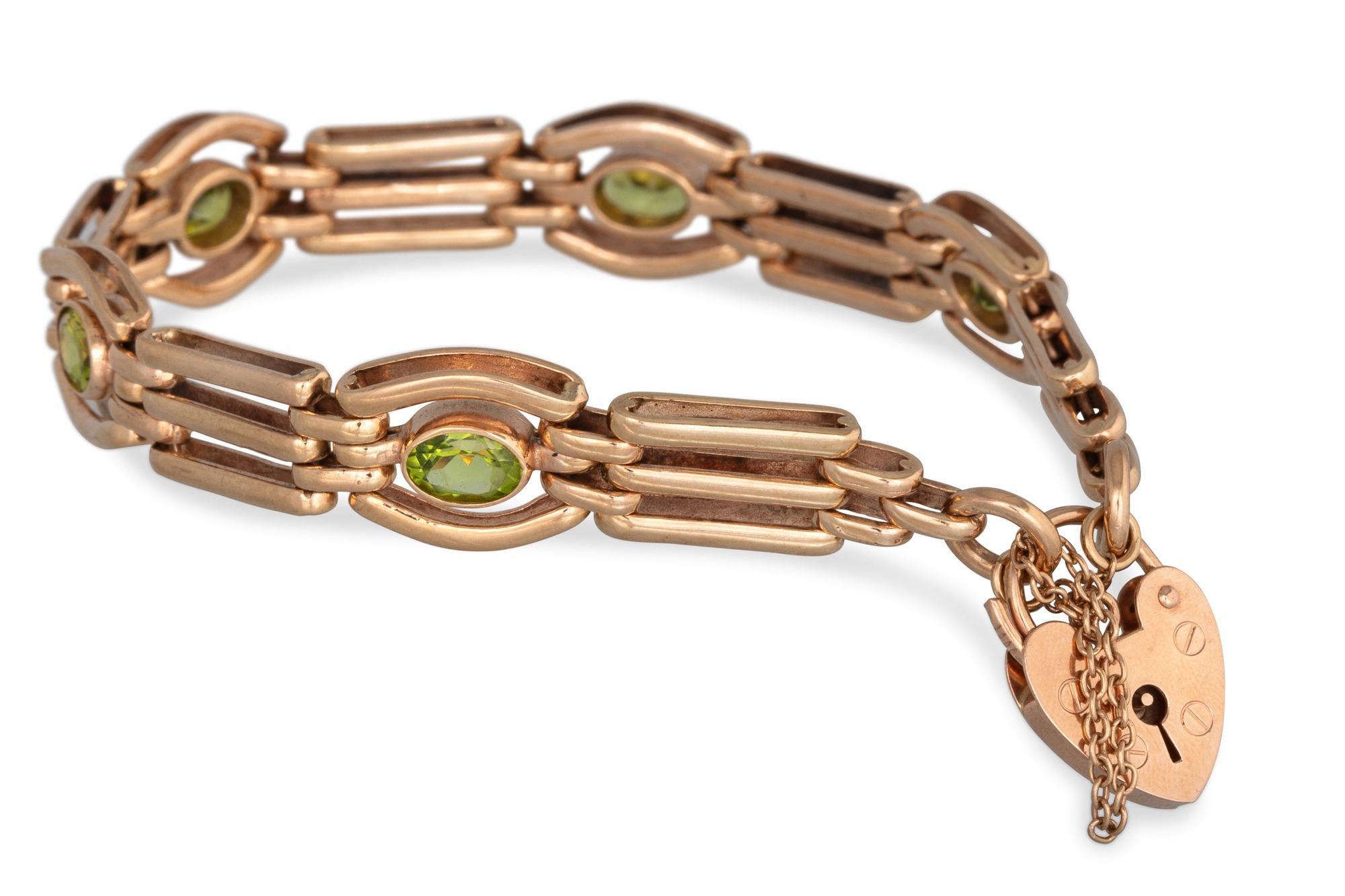 A 9CT GOLD GATE BRACELET, set with peridot, padlock clasp & safety chain, bracelet: 7" long, padlock clasp: 1.8 cm, ca 24.8 g.