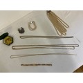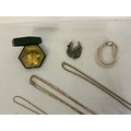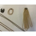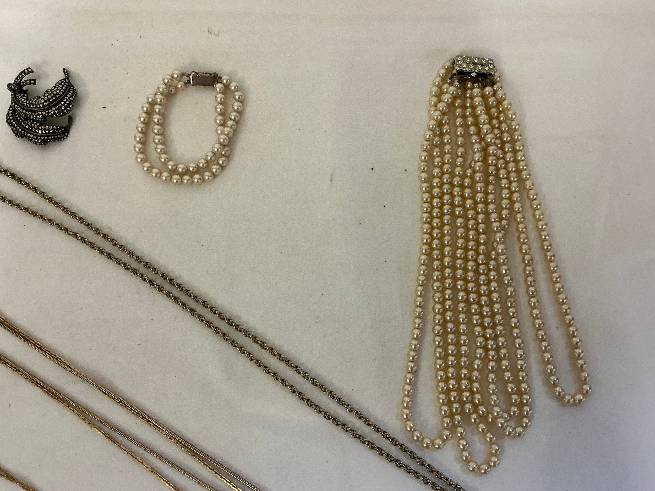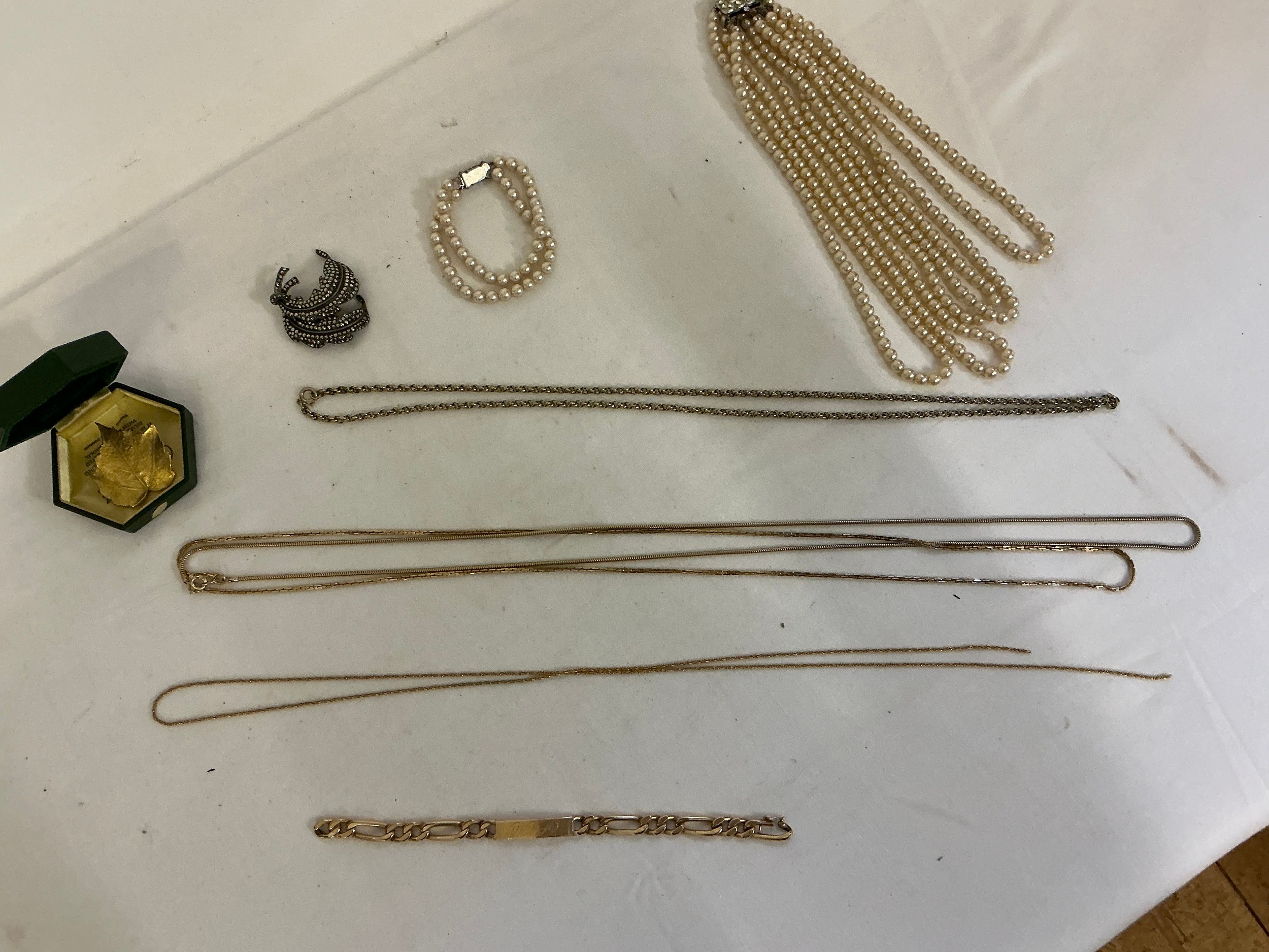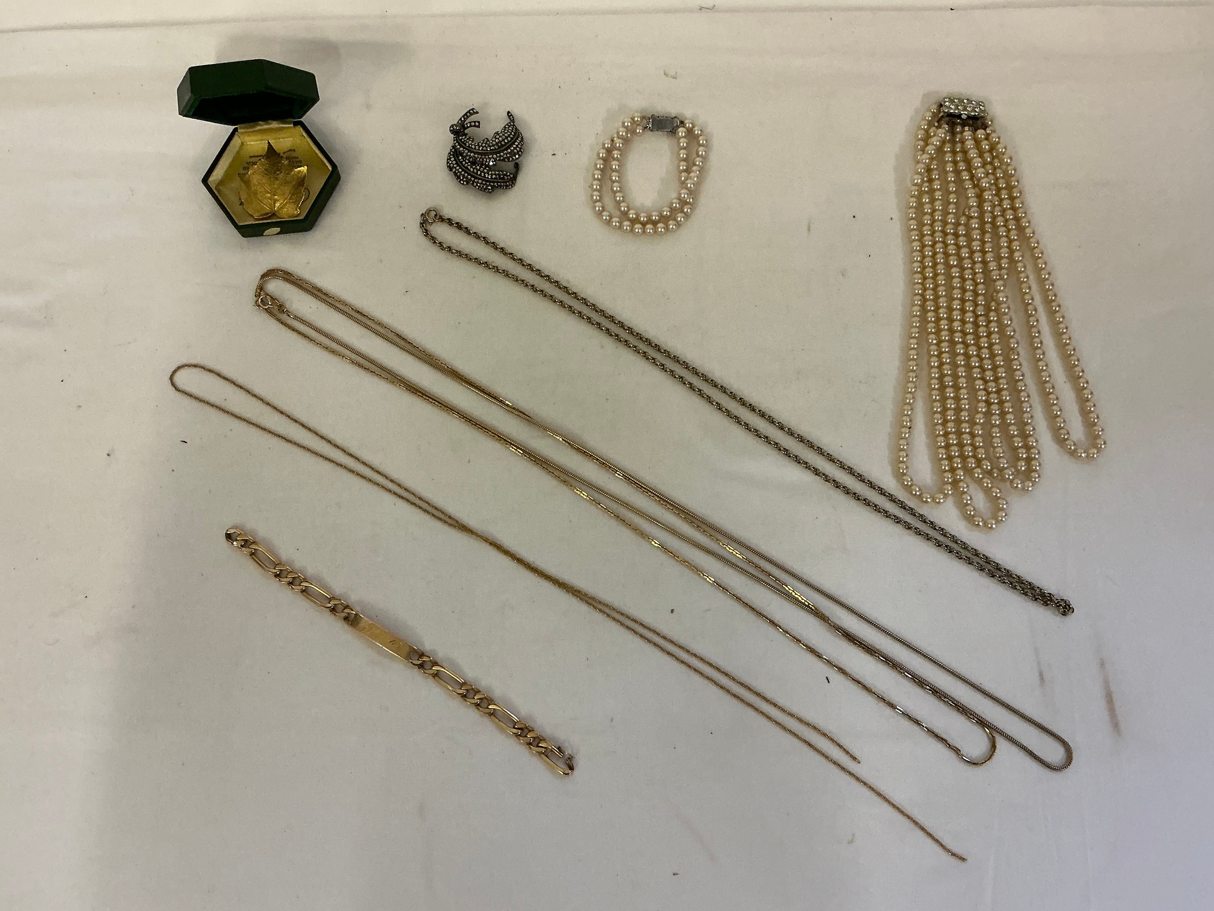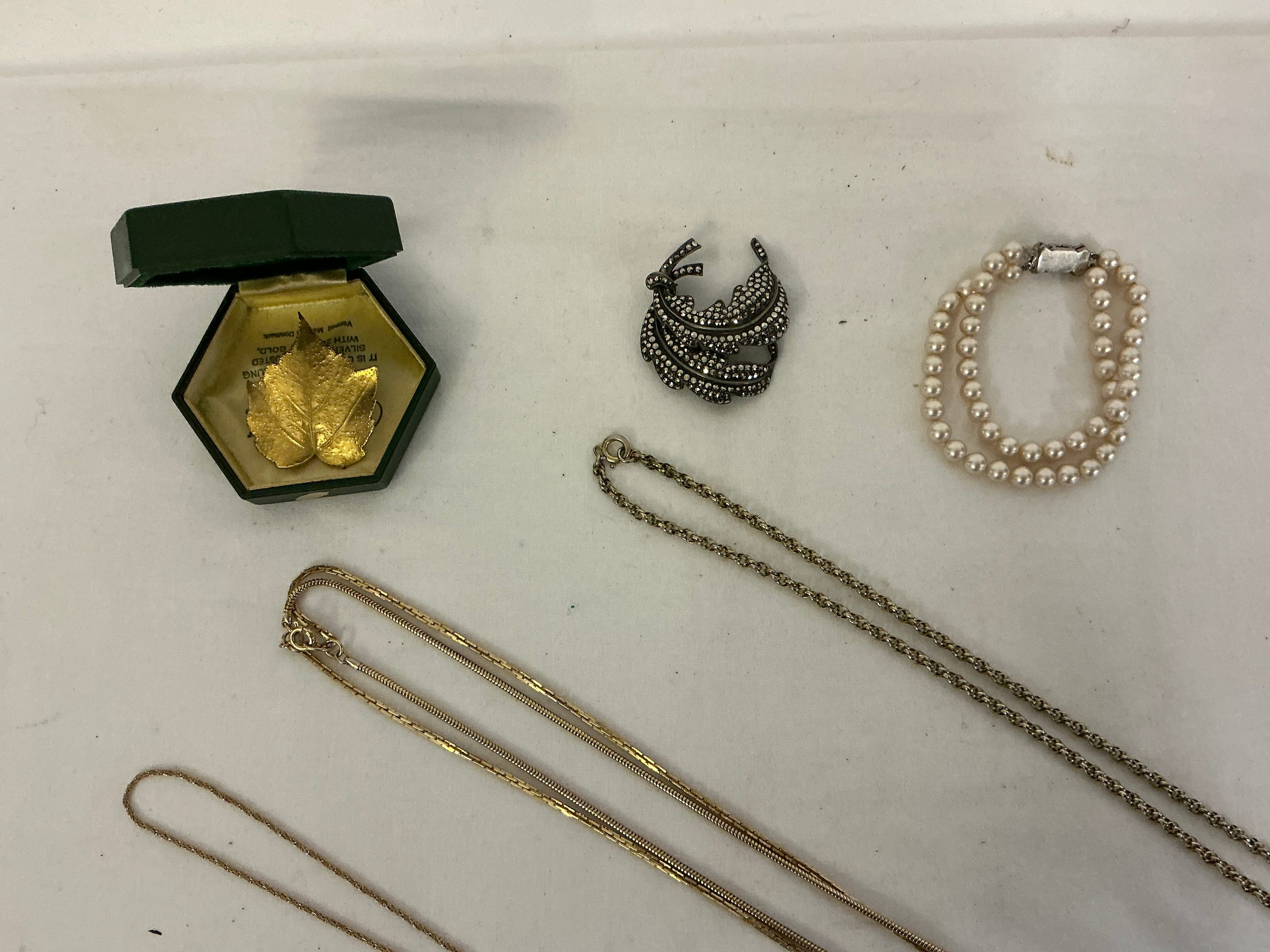 A varied collection of costume jewellery, comprising a costume pearl necklace and matching bracelet, several gold-coloured chains, a silver marquisette brooch, a Danish 24-carat gold-covered leaf etc.