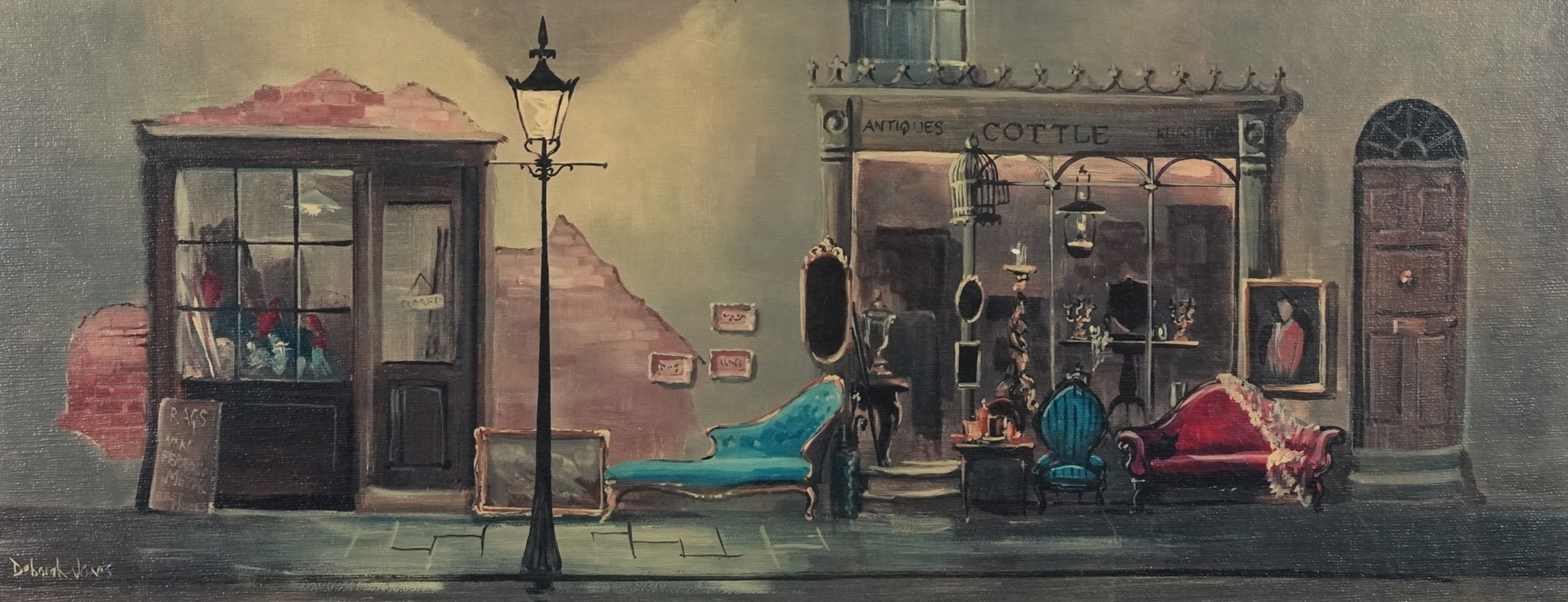 The Antiques Shop, 20th century overpainted print within a gild frame, 29cm x 75cm.